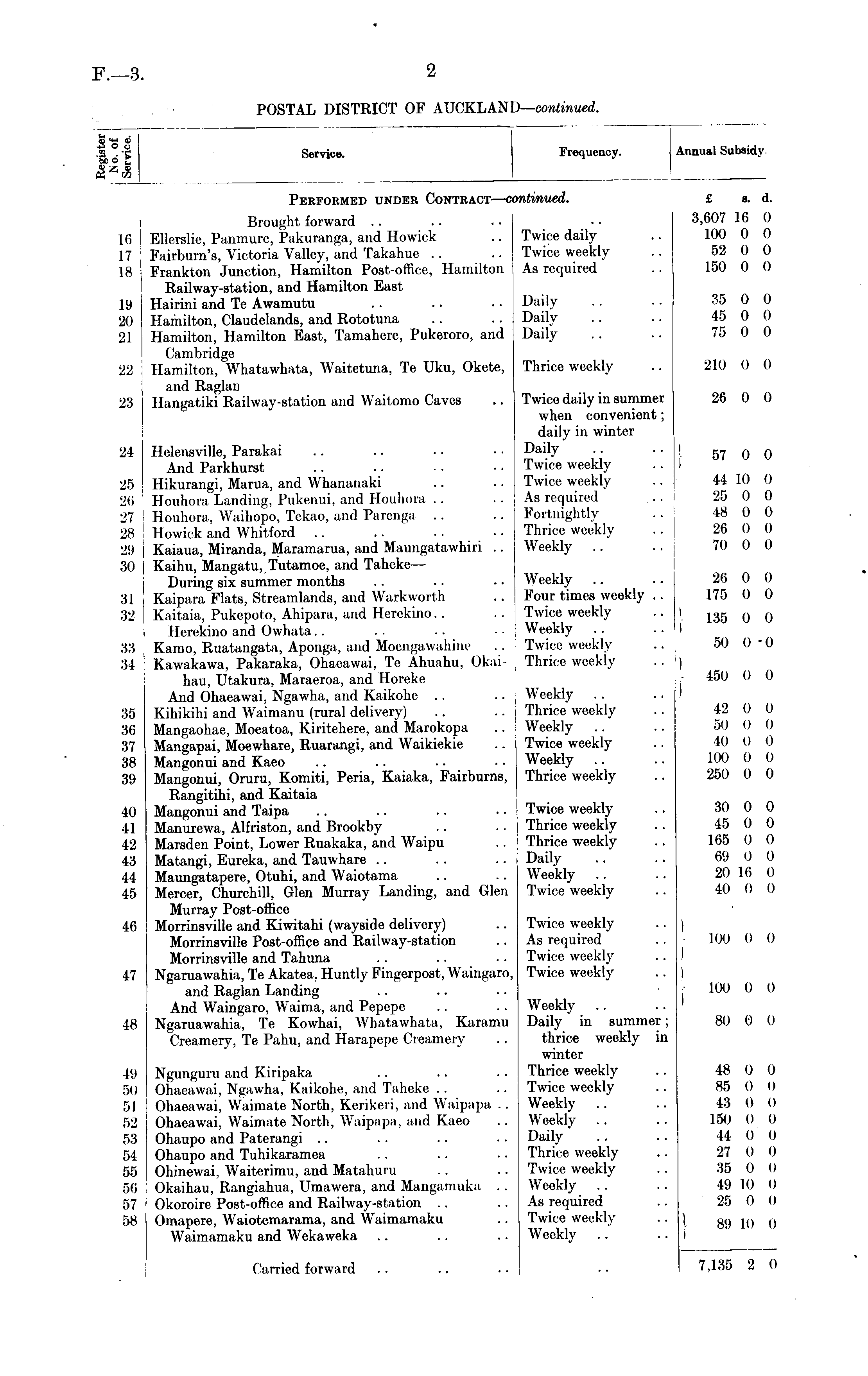 st £ on •_< •a 6 t Frequency. Annual Subsidy Service. Performed under Contract — a ntinued. £ s. d. 16 17 18 19 20 21 Brought forward Ellerslie, Panmure, Pakuranga, and Howick Fairburn's, Victoria Valley, and Takahue Frankton Junction, Hamilton Post-office, Hamilton Railway-station, and Hamilton Last Hairini and Te Awamutu Hamilton, Claudelands, and Rototuna Hamilton, Hamilton East, Tamahere, Pukeroro, and Cambridge Hamilton, Whatawhata, Waitetuna, Te Uku, Okete, and Raglan Hangatiki Railway-station and Waitomo Caves Twice daily Twice weekly As required Daily Daily Daily 3,607 16 0 100 0 0 52 0 0 150 0 0 35 0 0 45 0 0 75 0 0 22 Thrice weekly 210 0 0 23 'Twice daily in summer when convenient; daily in winter Daily Twice weekly 'Twice weekly As required Fortnightly Thrice weekly Weekly 26 0 0 21 Helensville, Para kai And Parkhurst Hikurangi, Marua, and Whananaki Houhora Landing, Pukenui, and Houhora Houhora, Waihopo, Tekao, and Parenga Howick and Whitford .. .. .. Kaiaua, Miranda, Maramarua, and Maungatawhiri .. Kaihu, Mangatu, Tutamoe, and Taheke — During six summer months Kaipara Flats, Streamlands, and Warkworth Kaitaia, Pukepoto, Ahipara, and Herekino.. Herekino and Owhata Kamo, Ruatangata, Aponga, and Moengawahine Kawakawa, Pakaraka, Ohaeawai, Te Ahuahu, Okaihau, Utakura, Maraeroa, and Horeke And Ohaeawai, Ngawha, and Kaikohe Kihikihi and Waimanu (rural delivery) Mangaohae, Moeatoa, Kiritehere, and Marokopa Mangapai, Moewhare, Ruarangi, and Waikiekie Mangonui and Kaeo Mangonui, Oruru, Komiti, Peria, Kaiaka, Fairburns, Rangitihi, and Kaitaia Mangonui and Taipa Manurewa, Alfriston, and Brookby Marsden Point, Lower Ruakaka, and Waipu Matangi, Eureka, and Tauwhare Maungatapere, Otuhi, and Waiotama Mercer, Churchill, Glen Murray Landing, and Glen Murray Post-office Morrinsville and Kiwitahi (wayside delivery) Morrinsville Post-office and Railway-station Morrinsville and Tahuna Ngaruawahia, Te Akatea. Huntly Fingerpost, Waingaro, and Raglan Landing And Waingaro, Waima, and Pepepe Ngaruawahia, Te Kowhai, Whatawhata, Karamu Creamery, Te Pahu, and Harapepe Creamery I I 57 0 0 25 26 27 28 29 30 44 10 0 25 0 0 48 0 0 26 0 0 70 0 0 Weekly Four times weekly . . Twice weekly Weekly Twice weekly Thrice weekly 26 0 o 175 n i) 31 32 l i 135 0 0 33 31 50 0 -0 ) I 450 0 0 35 36 37 38 39 Weekly Thrice weekly Weekly Twice weekly Weekly Thrice weekly 42 0 0 50 it 0 Ki 0 0 100 0 0 250 0 0 lu II 12 13 ■II 15 Twice weekly Thrice weekly Thrice weekly Daily Weekly Twice weekly 30 0 0 45 0 0 165 0 0 69 0 0 20 16 0 40 0 0 46 Twice weekly As required Twice weekly Twice weekly I 100 0 0 47 I i 100 0 0 IS 49 Till 51 52 53 51 55 56 57 58 Ngunguru and Kiripaka Ohaeawai, Ngawha. Kaikohe. and 'Taheke .. Ohaeawai, Waimate North, Kerikeri, and Waipapa . . Ohaeawai. Waimate North. Waipapa, and Kaeo Ohaupo and Paterangi Ohaupo and Tuhikaramea Ohinewai, Waiterimu, and Matahuru Okaihau, Rangiahua, Umawera, and Mangamuka Okoroire Post-office and Railway-station Omapere, Waiotemarama, and Waimamaku Waimamaku and Wekaweka Weekly Daily in summer; thrice weekly in winter Thrice weekly 'Twice weekly Weekly Weekly Daily' Thrice weekly 'Twice, weekly Weekly As required 'Twice weekly Weekly 80 0 0 18 n o 85 o 0 13 (I U 150 0 0 44 0 0 27 0 0 35 " 0 49 10 0 25 0 0 I I 89 in 0 Carried forward 7,135 2