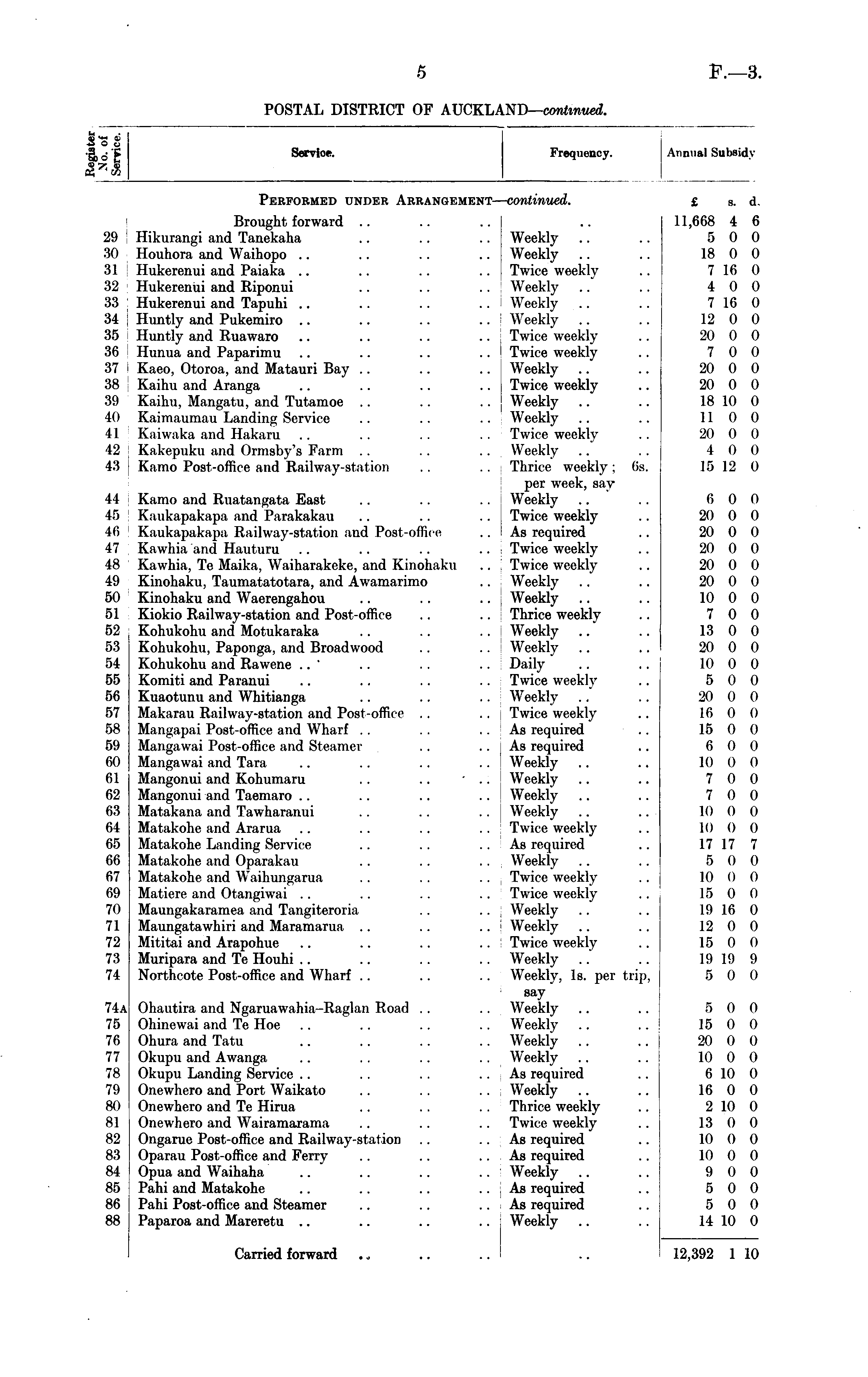 So S ■a»-g Servioe. Frequency. Annual Subsidy Performed under Arrangement— continued. £ s. d. 29 30 31 32 33 34 35 36 37 38 39 40 41 12 13 44 45 46 47 48 49 50 51 52 53 54 55 56 57 58 59 60 61 62 63 64 65 66 67 69 70 71 72 73 74 Brought forward Hikurangi and Tanekaha .. .. .. Weekly Houhora and Waihopo .. .. .. .. Weekly Hukerenui and Paiaka .. .. .. .. Twice weekly Hukerenui and Riponui .. .. .. Weekly Hukerenui and Tapuhi .. .. .. .. Weekly Huntly and Pukemiro .. .. .. .. Weekly Huntly and Ruawaro .. .. .. .. I Twice weekly Hunua and Paparimu .. .. .. .. Twice weekly Kaeo, Otoroa, and Matauri Bay .. .. .. Weekly Kaihu and Aranga .. .. .. .. Twice weekly Kaihu, Mangatu, and Tutamoe .. .. .. Weekly Kaimaumau Landing Service .. .. .. Weekly Kaiwaka and Hakaru .. .. . . .. Twice weekly Kakepuku and Ormsby's Farm .. .. .. Weekly Kamo Post-office and Railway-station .. Thrice weekly; (is. per week, say Kamo and Ruatangata East .. .. Weekly Kaukapakapa and Parakakau .. .. Twice weekly Kaukapakapa Railway-station and Post-office .. | As required Kawhia and Hauturu .. .. .. .. j Twice weekly Kawhia, Te Maika, Waiharakeke, and Kinohaku .. Twice weekly Kinohaku, Taumatatotara, and Awamarimo .. Weekly Kinohaku and Waerengahou .. .. .. Weekly Kiokio Railway-station and Post-office .. .. Thrice weekly Kohukohu and Motukaraka .. .. .. Weekly Kohukohu, Paponga, and Broadwood .. .. Weekly Kohukohu and Rawene .. ' .. .. .. Daily Komiti and Paranui .. .. .. .. Twice weekly Kuaotunu and Whitianga .. .. Weekly Makarau Railway-station and Post-office .. .. Twice weekly Mangapai Post-office and Wharf .. . . As required Mangawai Post-office and Steamer .. As required Mangawai and Tara .. .. .. Weekly Mangonui and Kohumaru .. .. ' .. Weekly Mangonui and Taemaro .. .. .. . . Weekly Matakana and Tawharanui .. .. .. Weekly Matakohe and Ararua .. .. .. .. Twice weekly Matakohe Landing Service .. .. As required Matakohe and Oparakau . . .. . . Weekly Matakohe and Waihungarua .. . . Twice weekly Matiere and Otangiwai .. .. .. . . Twice weekly Maungakaramea and Tangiteroria .. .. Weekly Maungatawhiri and Maramarua .. . . .. Weekly Mititai and Arapohue .. .. .. .. Twice weekly Muripara and Te Houhi .. .. . . .. Weekly Northcote Post-office and Wharf .. .. .. Weekly, Is. per trip, 11,668 4 6 5 0 0 18 0 0 7 16 0 4 0 0 7 16 0 12 0 0 20 0 0 7 0 0 20 0 0 20 0 0 18 10 0 11 0 0 20 0 0 4 0 0 15 12 0 6 0 0 20 0 0 20 0 0 20 0 0 20 0 0 20 0 0 10 0 0 7 0 0 13 0 0 20 0 0 10 0 0 5 0 0 20 0 0 16 0 0 15 0 0 6 0 0 10 0 0 7 0 0 7 0 0 10 0 0 10 0 0 17 17 7 5 0 0 10 0 0 15 0 0 19 16 0 12 0 0 15 0 0 19 19 9 5 0 0 74a 75 76 77 78 79 80 81 82 83 84 85 86 88 j say Ohautira and Ngaruawahia-Raglan Road . . Weekly Ohinewai and Te Hoe .. .. .. .. Weekly Ohura and Tatu .. .. .. .. Weekly Okupu and Awanga .. .. .. . . Weekly Okupu Landing Service .. .. .. .. As required Onewhero and Port Waikato .. .. Weekly Onewhero and Te Hirua .. .. . . Thrice weekly Onewhero and Wairamarama .. .. .. Twice weekly Ongarue Post-office and Railway-station .. As required Oparau Post-office and Ferry .. .. As required Opua and Waihaha .. .. .. .. Weekly Pahi and Matakohe .. .. .. .. j As required Pahi Post-office and Steamer .. .. .. i As required Paparoa and Mareretu .. .. .. .. Weekly Carried forward 5 0 0 15 0 0 20 0 0 10 0 0 6 10 0 16 0 0 2 10 0 13 0 0 10 0 0 10 0 0 9 0 0 5 0 0 5 0 0 14 10 0 12,392 1 10