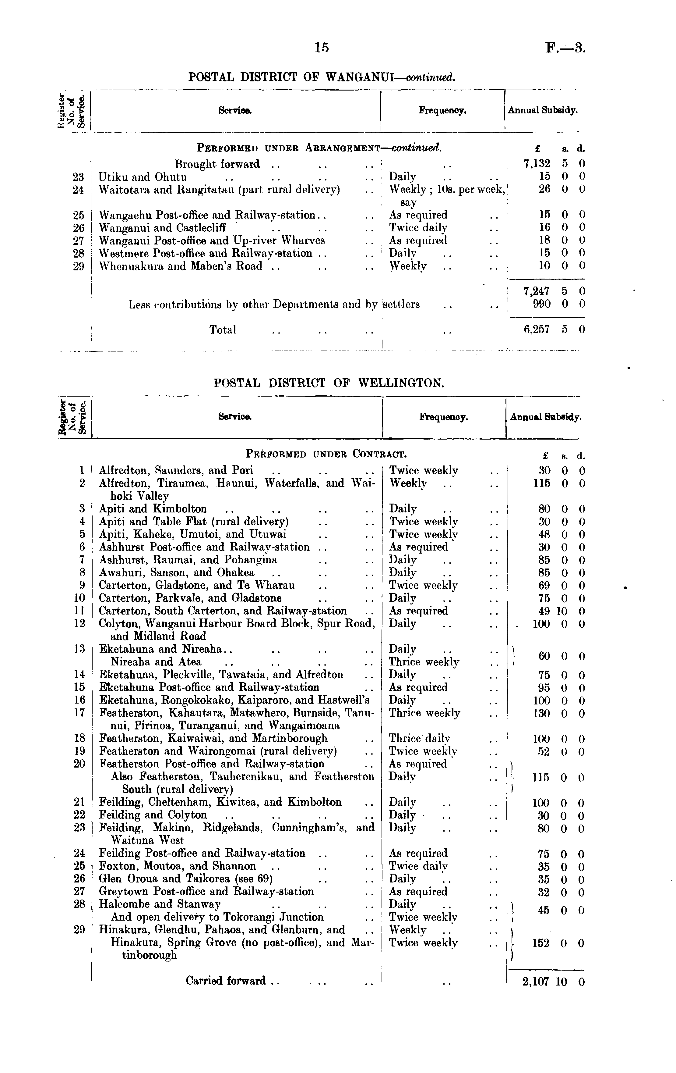 rH • 1 -_» O cj \ •I>°'r. Service. Frequency. Annual Subsidy. Performed under Cont: act. £ B. (1. 1 2 Alfredton, Saunders, and Pori Alfredton, Tiraumea, Haunui, Waterfalls, and Waihoki Valley Apiti and Kimbolton Apiti and Table Flat (rural delivery) Apiti, Kaheke, Umutoi, and Utuwai Ashhurst Post-office and Railway-station Ashhurst, Raumai, and Pohangina Awahuri, Sanson, and Ohakea Carterton, Gladstone, and Te Wharau Carterton, Parkvale, and Gladstone Carterton, South Carterton, and Railway-station Colyton, Wanganui Harbour Board Block, Spur Road, and Midland Road Eketahuna and Nireaha Nireaha and Atea Eketahuna, Pleckville, Tawataia, and Alfredton Eketahuna Post-office and Railway-station Eketahuna, Rongokokako, Kaiparoro, and Hastwell's Featherston, Kahautara, Matawhero, Burnside, Tanunui, Pirinoa, Turanganui, and Wangaimoana Featherston, Kaiwaiwai. and Martinborough Featherston and Wairongomai (rural delivery) Featherston Post-office and Railway-station Also Featherston, Tauherenikau, and Featherston South (rural delivery) Feilding, Cheltenham, Kiwitea, and Kimbolton Feilding and Colyton Feilding, Makino, Ridgelands, Cunningham's, and Waituna West Feilding Post-office and Railway-station Foxton, Moutoa, and Shannon Glen Oroua and Taikorea (see 69) Greytown Post-office and Railway-station Halcombe and Stanway And open delivery to Tokorangi .function Hinakura, Glendhu, Pahaoa, and Glenbum, and Hinakura, Spring Grove (no post-office), and Martinborough Twice weeklv Weekly . . 30 0 0 115 0 0 3 4 5 6 7 8 9 10 11 12 Daily Twice weekly Twice weekly As required Daily Daily Twice weekly Daily As required Daily 80 0 0 30 0 0 48 0 0 30 0 0 85 0 0 85 0 0 69 0 0 75 0 0 49 10 0 100 0 0 13 Daily Thrice weekly Daily As required Daily Thrice weekly I i 60 0 0 14 15 16 17 75 0 0 95 0 0 100 0 0 130 0 0 18 19 20 Thrice daily Twice weekly As required Daily loo 0 0 52 0 0 115 0 0 21 22 23 Daily Daily Daily loo 0 0 30 0 0 80 0 0 21 25 26 27 28 As required Twice dailyDaily As required Daily Twice weekly Weekly Twice weekly 75 0 0 35 0 0 35 0 0 32 0 0 j 45 0 0 29 i \ 152 0 0 Carried forward .. 2,107 10 0