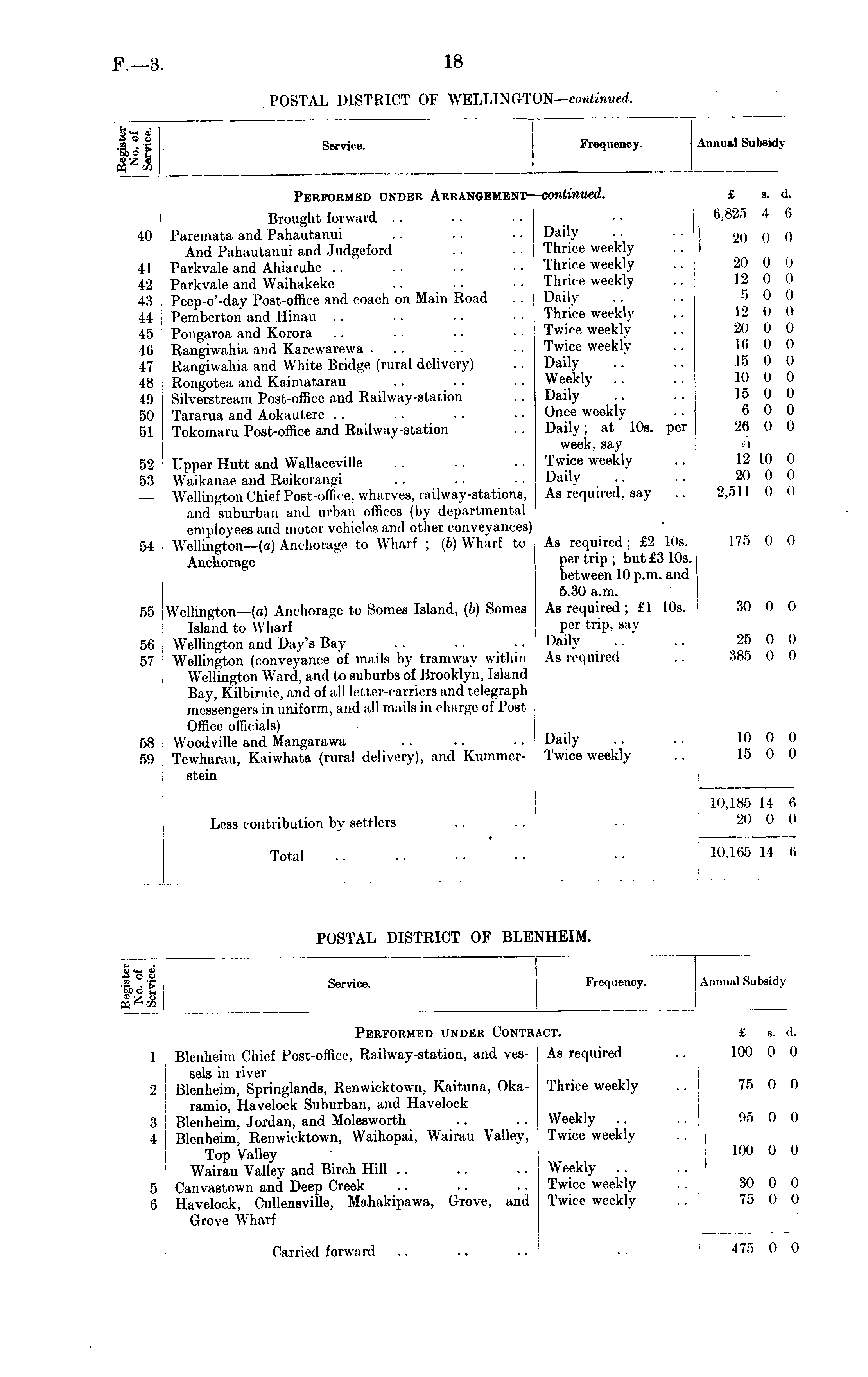 *- o o Uofe a** Service. Frequenoy. Annual Subsidy Performed under Arrangement— continued. £ s. d. IO 11 12 43 44 45 -16 47 48 19 50 51 52 53 Brought forward . . . . • • 6 > 825 4 6 Paremata and Pahautanui .. .. Daily .. .. \ 20 0 0 And Pahautanui and Judgeford .. .. Thrice weekly . . I Parkvale and Ahiaruhe .. .. .. •■ Thrice weekly .. 20 0 o Parkvale and Waihakeke .. . . • • Thrice weekly .. 12 0 0 Peep-o'-day Post-office and coach on Main Road Daily Pemberton and Hinau .. .. • • • • Thrice weekly .. 12 0 0 Pongaroa and Korora .. .. .. • • Twice weekly .. 20 0 0 Rangiwahia and Karewarewa . .. .. •• Twice weekly .. 16 0 0 Rangiwahia and White Bridge (rural delivery) .. Daily .. .. 15 0 0 Rongotea and Kaimatarau .. •. • • Weekly .. 10 0 0 Silverstream Post-office and Railway-station .. Daily .. .. 15 0 0 Tararua and Aokautere .. .. • • • • Once weekly .. 6 0 0 Tokomaru Post-office and Railway-station .. Daily; at 10s. per 26 0 0 week, say i Upper Hutt and Wallaceville .. .. .. Twice weekly .. 12 10 0 Waikanae and Reikorangi .. .. .. Daily .. .. 20 0 0 Wellington Chief Post-office, wharves, railway-stations, As required, say 2,511 0 0 and suburban and urban offices (by departmental employees and motor vehicles and other conveyances) Wellington—(o) Anchorage to Wharf ; (6) Wharf to As required; £2 LOs. 175 0 0 Anchorage P er trip ; but £3 10s. between 10 p.m. and j 5.30 a.m. Wellington—(a) Anchorage to Somes Island, (b) Somes As required ; £1 10s. 30 0 0 Island to Wharf ! per trip, say Wellington and Day's Bay .. .. .. Daily .. .. 25 0 0 Wellington (conveyance of mails by tramway within As required .. 385 0 0 Wellington Ward, and to suburbs of Brooklyn, Island Bay, Kilbirnie, and of all letter- ca rriers and telegraph messengers in uniform, and all mails in charge of Post Office officials) Woodville and Mangarawa .. .. •. Daily .. .. 10 0 0 Tewharau, Kaiwhata (rural delivery), and Kummer- Twice weekly .. 15 0 0 stein 51 55 56 57 58 59 10,185 14 6 Less contribution by settlers . . . . . • 20 0 0 Total ■ - 10.165 14 6