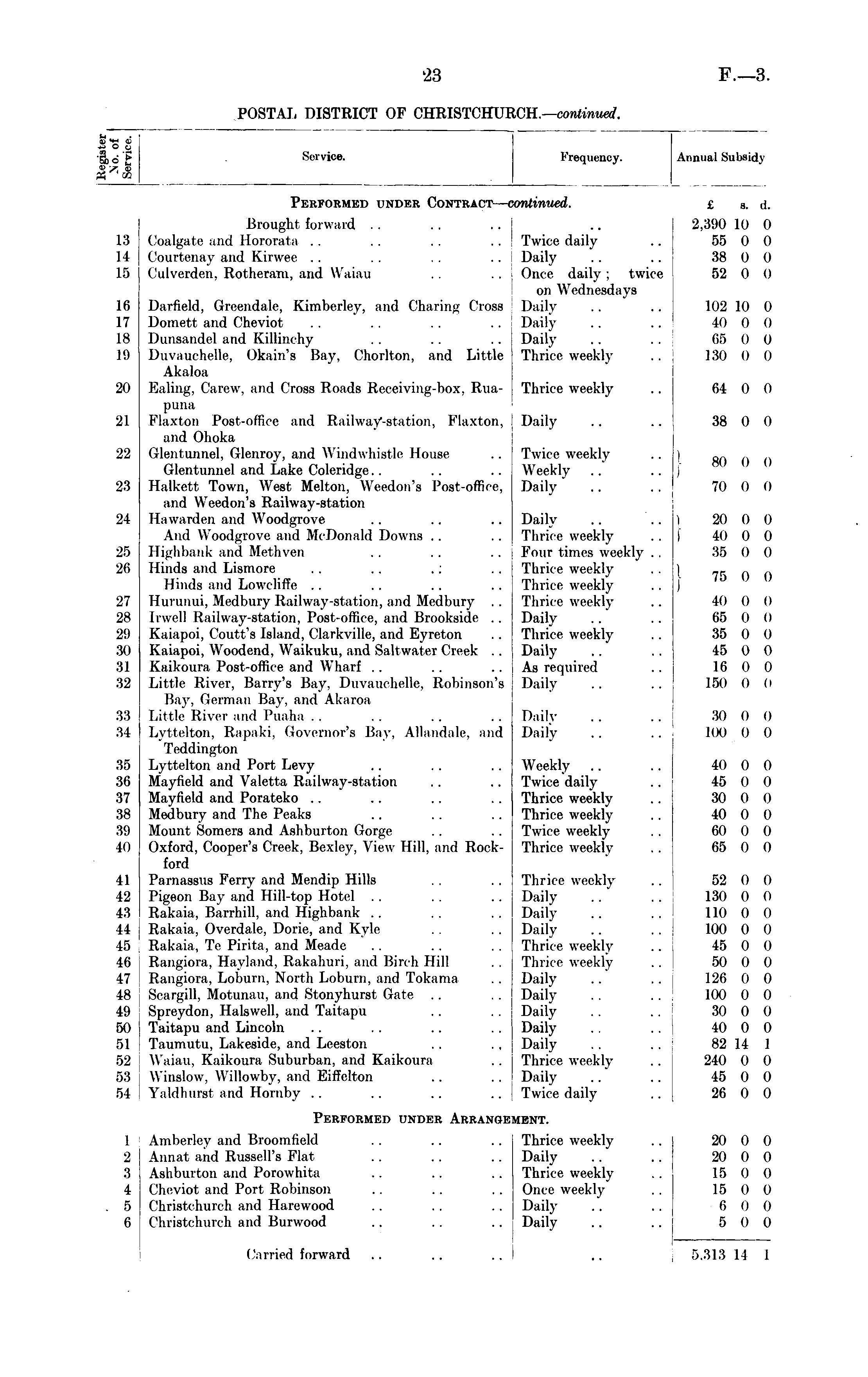 CD *£- <fc 3"* Service. Frequency. Annual Subsidy Performed under Contract — c mtinued. £ s. d. 13 14 15 Brought forward . . (loalgate and I [ororata Courtenay and Kirwee Culverden, Rotheram, and Waiau .. .. j Twice dailv Daily Once daily : twice on Wednesdays Dailv .. Daily Daily 'Thrice weekly 2.390 10 0 55 0 0 38 0 0 52 0 0 16 17 18 19 Darfield, Greendale, Kimberley, and Charing Cross Domett and Cheviot . . . . Dunsandel and Killinchy .. .. Duvauchelle, Okain's Bay, Chorlton, and Ijittle Akaloa Baling, Carew, and Cross Roads Receiving-box, Ruapuna Flaxton Post-office and Railway-station. Flaxton. and Ohoka Glentunnel, Glenroy, and Windwhistle House Glentunnel and Lake Coleridge.. Ilalkett 'Town. West Melton, Wcedon's Post-office. and Weedon's Railway-station Ha warden and Woodgrove And Woodgrove and McDonald Downs llighbank and Methven .. .. Hinds and Lismore Minds and Lowcliffe Hurimui, Medbury Railway-station, and Medbury Dwell Railway-station. Post-office, and Brook-side .. Kaiapoi. Court's Island. Claikville, and Eyreton Kaiapoi. Woodend. Waiknku. and Sail water Creek .. Kaikoura Post-office and Wharf Lit lie River, Barry's Bay, Duvauchelle, Robinson's Pay. German Bay, and Akaroa Little River and Puaha Lyttelton. Rapaki. Governor's Ray. Allandale, and Teddington Lyttelton and Port Levy Mayfield and Valetta Railway-station Mayfield and Porateko Medbury and The Peaks Mount Somers and Ashburton Gorge Oxford, Cooper's Creek, Bexley, View Hill, and Rockford 102 10 0 40 0 0 65 0 0 130 0 0 20 Thrice weekly 61 0 0 21 Daily 38 0 0 22 Twice weekly Weekly Daily' I J 80 0 0 23 70 0 0 24 Daily 'Thrice weekly Four times weekly . . Thrice weekly Thrice weekly Thrice weekly Daily 'Thrice weekly Daily As required Daily i 20 0 0 lo o 0 35 0 0 25 26 1 ) 75 0 0 27 28 29 30 31 32 40 o o 65 o o 35 o o 45 0 0 16 o o 150 0 0 33 34 Daily Daily 30 0 0 100 0 O 35 36 37 38 39 40 Weekly Twice daily Thrice weekly Thrice weekly Twice weekly Thrice weekly 40 0 0 45 0 0 30 0 0 40 0 0 60 0 0 65 0 0 41 42 43 44 45 46 47 48 49 50 51 52 53 54 Parnassus Ferry and Mendip Hills Pigeon Bay and Hill-top Hotel .. Rakaia, Barrhill, and Highbank Rakaia, Overdale, Dorie, and Kyle Rakaia, Te Pirita, and Meade Rangiora, Hayland, Rakahuri, and Birch Hill Rangiora, Loburn, North Loburn, and Tokama Scargill, Motunau, and Stonyhurst Date Spreydon, Hals well, and Taitapu .. Taitapu and Lincoln .. .. .. Taumutu, Lakeside, and Leeston Waiau. Kaikoura Suburban, and Kaikoura Winslow, Willowby, and Eiffelton Valdhurst and Hornby .. 'Thrice weekly Daily Daily Daily Thrice weekly Thrice weekly Daily Daily Daily Daily Daily Thrice weeklv Daily Twice daily 52 0 0 130 0 0 110 0 0 100 0 0 45 0 0 50 0 0 126 0 0 100 0 0 30 0 0 40 0 0 82 14 1 240 0 0 45 0 0 26 0 0 1 2 3 4 5 6 Performed under Arrange [ENT. 20 0 0 20 0 0 15 0 0 15 0 0 6 0 0 5 0 0 Amberley and Broomfield Annat and Russell's Flat Ashburton and Porowhita Cheviot and Port Robinson Christchurch and Harewood Christchurch and Burwood Thrice weekly Daily Thrice weekly Once weekly Daily Daily ('allied forward