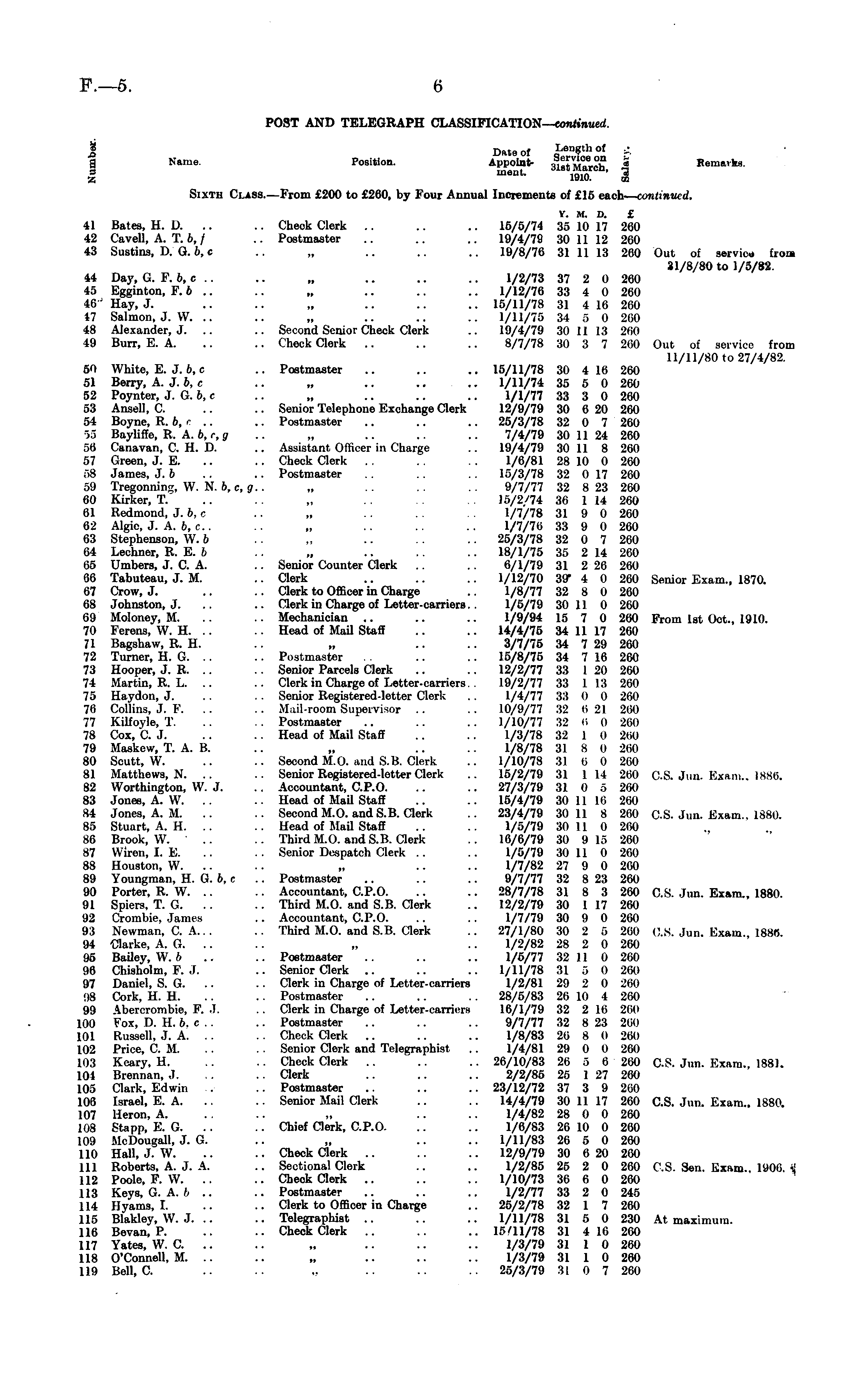 POST AND TELEGRAPH CLASSIFICATION— continuaI. j> Date of Length of .• I Name. Position. Appoint j^ 3 Remarks. = meat. 191Q • J Sixth Class.—From £200 to £260, by Four Annual Increments of £16 each— continued. y. It D. £ 41 Bates, H. D. .. .. Check Clerk .. .. .. 15/5/74 35 10 17 260 42 Cavell, A. T. b, f .. Postmaster .. .. .. 19/4/79 30 11 12 260 43 Sustins, D. G. b, c .. „ .. .. .. 19/8/76 311113 260 Out of service from 31/8/80 to 1/3/82. 44 Day, G. F. b, c .. .. „ .. .. .. 1/2/73 37 2 0 260 45 Egginton, F. b .. .. „ .. .. .. 1/12/76 33 4 0 260 46' Hay, J. .. .. „ 15/11/78 31 4 16 260 47 Salmon, J. VV. .. .. „ .. .. .. 1/11/75 34 5 0 260 48 Alexander, J. .. .. Second Senior Check Clerk .. 19/4/79 30 11 13 2(i(l 49 Burr, E. A. .. .. Check Clerk .. .. .. 8/7/78 30 3 7 260 Out of service from 11/11/80 to 27/4/82. 50 White, E. J. b, c .. Postmaster .. .. .. 15/11/78 30 416 260 51 Berry, A. J. b, c .. „ .. .. .. 1/11/74 35 5 0 260 52 Poynter, J. G. b, c .. „ .. .. .. 1/1/77 33 3 0 260 53 Ansell, C. .. .. Senior Telephone Exchange Clerk 12/9/79 30 620 260 54 Boyne, R. 6, <■ .. .. Postmaster .. .. .. 25/3/78 32 0 7 260 55 Bayliffe, R. A. 6, r, g .. „ .. .. .. 7/4/79 30 1124 260 56 Canavan, C. H. D. .. Assistant Officer in Charge .. 19/4/79 30 11 8 260 57 Green, J. E. .. .. Check Clerk . . .. .. 1/6/81 28 10 0 260 58 James, J. b .. .. Postmaster .. .. .. 15/3/78 32 017 260 59 Tregonning, W. N. 6, c, g.. „ .. .. .. 9/7/77 32 823 260 60 Kirker, T. .. .. „ .. .. .. 15/2/74 36 114 260 61 Redmond, 3.b,c .. „ .. . . . . 1/7/78 31 9 0 260 62 Algio, J. A. b, c. .. „ .. .. .. 1/7/70 33 9 0 260 63 Stephenson, W. 6 . . „ .. . . .. 25/3/78 32 0 7 260 64 Lechner, R. E. b .. „ .. .. .. 18/1/75 35 214 260 65 Umbers, J. C. A. .. Senior Counter Clerk .. .. 6/1/79 31 226 260 66 Tabuteau, J. M. .. Clerk .. .. .. 1/12/70 39* 4 0 260 Senior Exam., 1870. 67 Crow, J. .. .. Clerk to Officer in Charge .. 1/8/77 32 8 0 260 68 Johnston, J. .. .. Clerk in Charge of Letter-carriers.. 1/5/79 30 11 0 260 69 Moloney, M. .. .. Mechanician .. .. .. 1/9/94 15 7 0 260 From Ist Oct., 1910. 70 Ferens, W. H. .. .. Head of Mail Staff .. .. 14/4/75 34 1117 260 71 Bagshaw, R. H. .. „ .. .. 3/7/75 34 729 260 72 Turner, H. G. .. .. Postmaster . . .. .. 15/8/75 34 716 260 73 Hooper, J. R. .. .. Senior Parcels Clerk .. .. 12/2/77 33 120 260 74 Martin, R. L. .. .. Clerk in Charge of Letter-carriers. . 19/2/77 33 113 260 75 Haydon, J. .. .. Senior Registered-letter Clerk .. 1/4/77 33 0 0 260 76 Collins, J. F. .. .. Mail-room Supervisor .. .. 10/9/77 32 t> 21 260 77 Kilfoyle, T. .. .. Postmaster .. .. .. 1/10/77 32 8 0 260 78 Cox, C. J. .. .. Head of Mail Staff .. .. 1/3/78 32 1 0 260 79 Maskew, T. A. B. .. „ .. .. 1/8/78 31 8 0 260 80 Scutt, W. .. .. Second M.O. and S.B. Clerk .. 1/10/78 31 0 0 260 81 Matthews, N. .. .. Senior Registered-letter Clerk .. 15/2/79 31 1 l-l 260 C.S. Jim. Exam.. I.SSO. 82 Worthington, W. J. .. Accountant, C.P.O. .. .. 27/3/79 31 0 5 260 83 Jones, A. W. .. .. Head of Mail Staff .. .. 15/4/79 ;io II Lβ 260 84 Jones, A. M. .. .. Second M.O. and S.B. Clerk .. 23/4/79 30 11 8 260 C.S. Jim. Exam., 1880. 85 Stuart, A. H. .. .. Head of Mail Staff .. .. 1/5/79 30 11 0 260 86 Brook, \V. .. .. Third M.O. and S.B. Clerk .. 16/6/79 30 1) 16 260 87 Wiren, I. E. .. .. Senior Despatch Clerk .. .. 1/5/79 80 11 0 260 88 Houston, W. .. .. „ .. .. 1/7/82 27 9 0 260 89 Youngman, H. G. b, c .. Postmaster .. .. .. 9/7/77 32 823 260 90 Porter, R. W. .. .. Accountant, C.P.O. .. .. 28/7/78 31 8 3 260 C.S. Jun. Exam., 1880. 91 Spiers, T. G. .. .. Third M.O. and S.B. Clerk .. 12/2/79 30 117 260 92 Crombie, James .. Accountant, C.P.O. .. .. 1/7/79 30 9 0 260 93 Newman, C. A.. ... Third M.O. and S.B. Clerk .. 27/1/80 30 2 5 260 C.S. Jun. Kxam. 1880. 94 Clarke, A. G. .. .. „ .. 1/2/82 28 2 0 260 95 Bailey, W. l> .. .. Postmaster .. .. .. 1/5/77 32 11 0 260 96 Chisholm, F. J. .. Senior Clerk .. .. .. 1/11/78 31 5 0 260 97 Daniel, S. G. .. .. Clerk in Charge of Letter-carriers 1/2/81 29 2 0 260 98 Cork, H. H. .. .. Postmaster .. .. .. 28/5/83 26 10 4 260 99 Abercrombie, F. .1. .. Clerk in Charge of Letter-carriers 16/1/79 32 216 260 100 Fox, D. H. 6. c .. .. Postmaster .. .. .. 9/7/77 32 823 260 101 Russell, J. A. .. .. Check Clerk .. .. .. 1/8/83 2ti g 0 260 102 Price, C. M. .. .. Senior Clerk and Telegraphist .. 1/4/81 29 0 0 260 103 Keary, H. .. .. Check Clerk .. .. .. 26/10/83 26 5 6 260 C.S. Jun. Exam., 188). 101 Brennan, J. .. .. Clerk .. .. .. 2/2/85 25 127 260 105 Clark, Edwin . .. Postmaster .. .. .. 23/12/72 37 3 9 260 106 Israel, E. A. .. .. Senior Mail Clerk .. .. 14/4/79 30 11 17 260 C.S. Jun. Exam.. 1880. 107 Heron, A. .. .. „ .. .. 1/4/82 28 0 0 260 108 Stapp, E. G. .. .. Chief Clerk, C.P.O. .. .. 1/6/83 26 10 0 200 109 McDougall, J. G. .. „ .. .. 1/11/83 26 5 0 260 110 Hall, J. W. .. .. Cheek Clerk .. .. .. 12/9/79 30 620 260 111 Roberts, A. J. A. .. Sectional Clerk .. .. 1/2/85 25 2 0 260 C.S. Sen. Exam., l'JOii 112 Poole, F. W. .. .. Check Clerk .. .. .. 1/10/73 36 6 0 260 113 Keys, G. A. b .. .. Postmaster .. .. .. 1/2/77 33 2 0 245 114 H yams, I. .. .. Clerk to Officer in Charge .. 25/2/78 32 1 7 260 115 Blakley, W. J. .. .. Telegraphist .. .. .. 1/11/78 31 5 0 230 At maximum. 116 Bevan, P. .. .. Check Clerk .. .. .. 15/11/78 31 416 260 117 Yates, W. C. .. .. „ .. .. .. 1/3/79 31 1 0 260 118 O'Connell, M. .. .. „ .. .. .. 1/3/79 31 1 0 260 119 Bell, C. .. .. .. 25/3/79 31 0 7 260