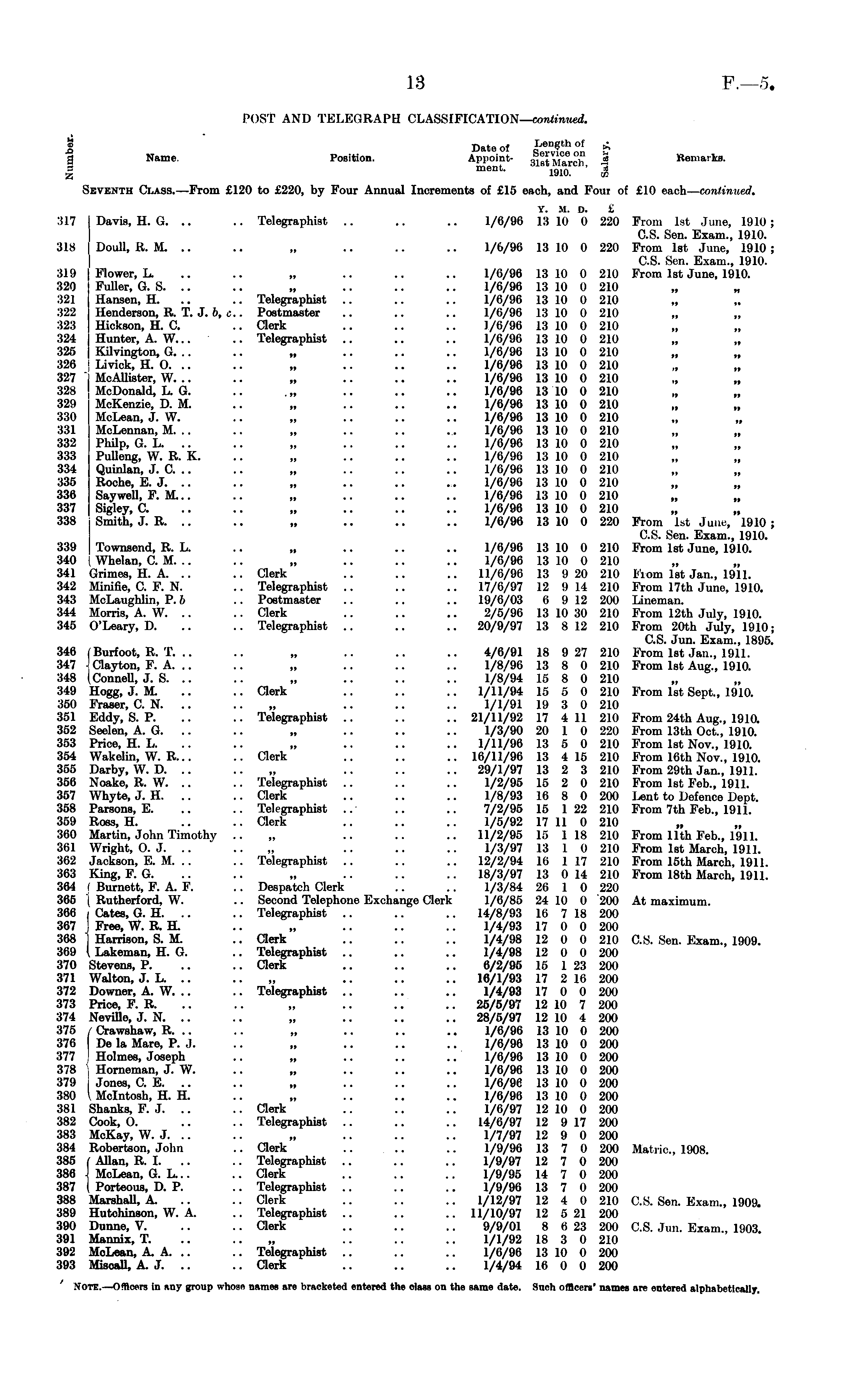 POST AND TELEGRAPH CLASSIFICATION— continued. S Date of Length of & Name. Position. Appoint- £ Remarla. s ment. 1910 ■ * Seventh Class.—From £120 to £220, by Four Annual Increments of £15 each, and Four of £10 each— continued. Y. M. d. £ 317 Davis, H. G. .. .. Telegraphist .. .. .. 1/6/96 13 10 0 220 From Ist June, 1910; C.S. Sen. Exam., 1910. 318 Doull, R. M. .. .. „ .. .. .. 1/6/96 13 10 0 220 From Ist June, 1910 ; C.S. Sen. Exam., 1910. 319 Flower, L. .. .. „ .. .. .. 1/6/96 13 10 0 210 From Ist June, 1910. 320 Fuller, G. S. .. .. „ .. .. .. 1/6/96 13 10 0 210 321 Hansen, H. .. .. Telegraphist .. .. .. 1/6/96 13 10 0 210 „ 322 Henderson, R. T. J. b, c. Postmaster .. .. .. 1/6/96 13 10 0 210 „ 323 Hickson, H. C. .. Clerk .. .. .. J/6/96 13 10 0 210 „ 324 Hunter, A. W... .. Telegraphist .. .. .. 1/6/96 13 10 0 210 325 Kilvington, G. .. .. „ .. .. .. 1/6/96 13 10 0 210 326 j Livick, H. O. .. .. „ .. .. .. 1/6/96 13 10 0 210 „ „ 327 "I McAllister, W. .. .. „ .. .. .. 1/6/96 13 10 0 210 „ 328 j McDonald, L. G. .. „ .. .. .. 1/6/96 13 10 0 210 „ 329 McKenzie, D. M. .. „ .. .. .. 1/6/96 13 10 0 210 330 McLean, J. W. .. „ .. .. .. 1/6/96 13 10 0 210 331 McLennan, M. .. .. „ .. .. .. 1/6/96 13 10 0 210 332 Philp, G. L. .. .. „ .. .. .. 1/6/96 13 10 0 210 333 Pulleng, W. R. K. .. „ .. .. .. 1/6/96 13 10 0 210 334 Quinlan, J. C. .. .. „ .. .. .. 1/6/96 13 10 0 210 335 Roche, E. J. .. .. „ .. .. .. 1/6/96 13 10 0 210 „ „ 336 Saywell, F. M... .. „ .. .. .. 1/6/96 13 10 0 210 337 Sigley, C. .. .. „ .. .. .. 1/6/96 13 10 0 210 „ „ 338 Smith, J. R. .. .. „ .. .. .. 1/6/96 13 10 0 220 From Ist June, 1910 ; C.S. Sen. Exam., 1910. 339 Townsend, R. L. .. „ .. .. .. 1/6/96 13 10 0 210 From Ist June, 1910. 340 I Whelan, CM... .. „ .. .. .. 1/6/96 13 10 0 210 „ 341 Grimes, H. A. .. .. Clerk .. .. .. 11/6/96 13 920 210 tiom Ist Jan., 1911. 342 Minifie, C. F. N. .. Telegraphist .. .. .. 17/6/97 12 914 210 From 17th June, 1910. 343 McLaughlin, P. 6 .. Postmaster .. .. .. 19/6/03 6 912 200 Lineman. 344 Morris, A. W. .. .. Clerk .. .. .. 2/5/96 13 10 30 210 From 12th July, 1910. 345 O'Leary, D. .. .. Telegraphist .. .. .. 20/9/97 13 812 210 From 20th July, 1910; C.S. Jun. Exam., 1895. 346 (Burfoot, R. T. .. .. „ .. .. .. 4/6/91 18 927 210 From Ist Jan., 1911. 347 \ Clayton, F. A. .. .. „ .. .. .. 1/8/96 13 8 0 210 From Ist Aug., 1910. 348 (Connell, J. S. .. .. „ .. .. .. 1/8/94 15 8 0 210 „ 349 Hogg, J. M. .. .. Clerk .. .. .. 1/11/94 15 5 0 210 From Ist Sept., 1910. 350 Fraser, C. N. .. .. „ .. .. .. 1/1/91 19 3 0 210 351 Eddy, S. P. .. .. Telegraphist .. .. .. 21/11/92 17 411 210 From 24th Aug., 1910. 352 Seelen, A. G. .. .. „ .. .. .. 1/3/90 20 1 0 220 From 13th Oct., 1910. 353 Price, H. L. .. .. „ .. .. .. 1/11/96 13 5 0 210 From Ist Nov., 1910. 354 Wakelin, W. R... .. Clerk .. .. .. 16/11/96 13 415 210 From 16th Nov., 1910. 355 Darby, W. D. .. .. „ .. .. .. 29/1/97 13 2 3 210 From 29th Jan., 1911. 356 Noake, R. W. .. .. Telegraphist .. .. .. 1/2/95 15 2 0 210 From Ist Feb., 1911. 357 Whyte, J. H. .. .. Clerk .. .. .. 1/8/93 16 8 0 200 Lent to Defence Dept. 358 Parsons, E. .. .. Telegraphist .. .. .. 7/2/95 15 122 210 From 7th Feb., 1911. 359 Ross, H. .. .. Clerk .. .. .. 1/5/92 17 11 0 210 „ „ 360 Martin, John Timothy .. .. .. .. 11/2/95 15 118 210 From 11th Feb., 1911. 361 Wright, O. J. .. .. .. .. .. 1/3/97 13 1 0 210 From Ist March, 1911. 362 Jackson, E. M. .. .. Telegraphist .. .. .. 12/2/94 16 117 210 From 15th March, 1911. 363 King, F. G. .. .. „ .. .. .. 18/3/97 13 014 210 From 18th March, 1911. 364 I Burnett, F. A. F. .. Despatch Clerk .. .. 1/3/84 26 1 0 220 365 ( Rutherford, W. .. Second Telephone Exchange Clerk 1/6/85 24 10 0 200 At maximum. 366 i Cates, G. H. .. .. Telegraphist .. .. .. 14/8/93 16 718 200 367 I Free, W. R. H. .. „ .. .. .. 1/4/93 17 0 0 200 368 1 Harrison, S. M. .. Clerk .. .. .. 1/4/98 12 0 0 210 C.S. Sen. Exam., 1909. 369 { Lakeman, H. G. .. Telegraphist .. .. .. 1/4/98 12 0 0 200 370 Stevens, P. .. .. Clerk .. .. .. 6/2/95 15 123 200 371 Walton, J. L. .. .. „ .. .. .. 16/1/93 17 2 16 200 372 Downer, A. W. .. .. Telegraphist .. .. .. 1/4/93 17 0 0 200 373 Price, F. R. .. .. „ .. .. .. 25/5/97 12 10 7 200 374 Neville, J. N. .. .. „ .. .. .. 28/5/97 12 10 4 200 375 / Crawshaw, R. .. .. „ .. .. .. 1/6/96 13 10 0 200 376 De la Mare, P. J. .. „ .. .. .. 1/6/96 13 10 0 200 377 ) Holmes, Joseph .. „ .. .. .. 1/6/96 13 10 0 200 378 i Horneman, J. W. .. „ .. .. .. 1/6/96 13 10 0 200 379 I Jones, C. E. .. .. „ .. .. .. 1/6/96 13 10 0 200 380 I Mclntosh, H. H. .. „ .. .. .. 1/6/96 13 10 0 200 381 Shanks, F. J. .. .. Clerk .. .. .. 1/6/97 12 10 0 200 382 Cook, O. .. .. Telegraphist .. .. .. 14/6/97 12 917 200 383 McKay, W. J. .. .. „ .. .. .. 1/7/97 12 9 0 200 384 Robertson, John .. Clerk .. .. .. 1/9/96 13 7 0 200 Matric, 1908 385 ( Allan, R. I. .. .. Telegraphist .. .. .. 1/9/97 12 7 0 200 386 J McLean, G. L... .. Clerk .. .. .. 1/9/95 14 7 0 200 387 ( Porteous, D. P. .. Telegraphist .. .. .. 1/9/96 13 7 0 200 388 Marshall, A. .. .. Clerk .. .. .. 1/12/97 12 4 0 210 C.S. Sen. Exam., 1909. 389 Hutchinson, W. A. .. Telegraphist .. .. .. 11/10/97 12 521 200 390 Dunne, V. .. .. Clerk .. .. .. 9/9/01 8 623 200 C.S. Jun. Exam 1903 391 Mannix, T. .. .. „ .. .. .. 1/1/92 18 3 0 210 392 McLean, A. A. .. .. Telegraphist .. .. .. 1/6/96 13 10 0 200 393 Miscall, A. J. .. .. Clerk .. .. .. 1/4/94 16 0 0 200 tfOTE.—Officers in any group whose names are bracketed entered the class on the same date. Such officers' names are entered alphabetically.