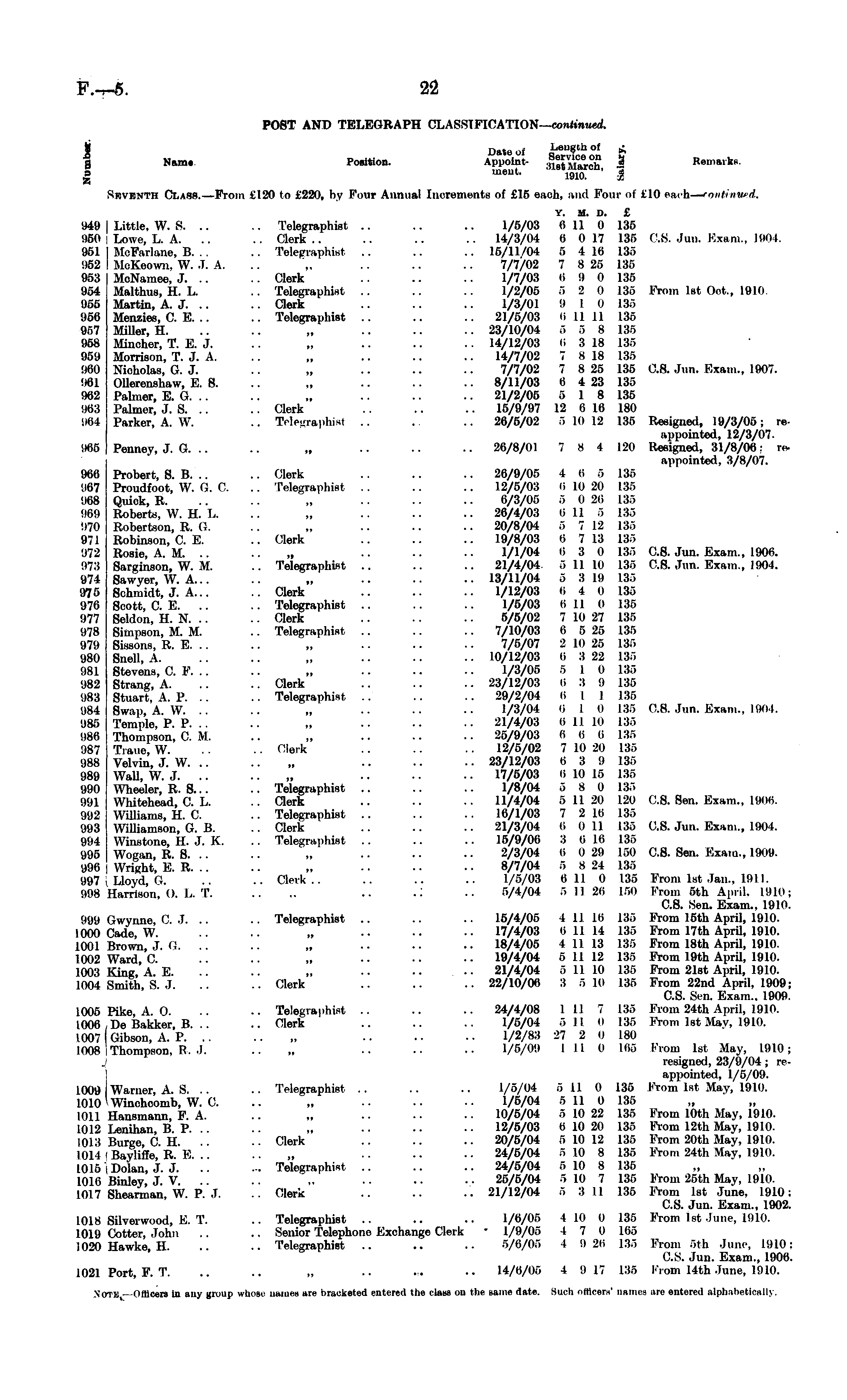 POST AND TELEGRAPH CLASSIFICATION— continued. J Date of i-ieugth of & g Namr Position. Appoint- ®|t™ a e r ch £ Remarks. s incut. ' 1910 ' I Seventh Class.—From £120 to £220, by Four Annual Increments of £15 each, and Four of £10 each— continued. Y. M. D. £ 949 I Little, W. 8. .. .. Telegraphist .. .. .. 1/5/03 (ill 0 135 950 ! Lowe, L. A. .. .. Clerk.. .. .. .. 14/3/04 6 017 135 C.& Jun. Exam., 1904. 951 McFarlane, B. . . .. Telegraphist .. .. .. 15/11/04 5 416 135 !)52 McKeown, W. J. A. „ .. .. .. 7/7/02 7 825 135 953 MoNaraee, J. .. .. Clerk .. .. .. 1/7/03 <i 9 0 135 954 Malthus, H. L. .. Telegraphist .. .. .. 1/2/05 5 2 (I 135 From Ist Oot., 1910. 955 Martin, A. J. .. .. Clerk .. .. .. 1/3/01 9 1 0 135 956 Menzies, C. E. .. .. Telegraphist .. .. .. 21/5/03 (i 11 11 135 957 Miller, H. .. .. ~ .. .. .. 23/10/04 r> G 8 135 958 Mincher, T. E. J. .. „ .. .. .. 14/12/03 l> 318 135 959 Morrison, T. J. A. .. „ .. .. .. 14/7/02 7 818 135 !180 Nicholas, G. J. .. „ .. .. .. 7/7/02 7 825 135 C.S. Jun. Exam., 1907. !161 Ollerenshaw, E. 8. .. „ .. .. .. 8/11/03 6 423 135 962 Palmer, E. G. .. .. „ .. .. .. 21/2/05 5 1 8 135 983 Palmer, J. S Clerk 15/9/97 12 0 16 180 1)64 Parker, A. W. .. Telegraphist .. .. .. 26/5/02 r>lo 12 135 Resigned, 19/3/05; reappointed, 12/3/07. 965 Penney, J. G. .. .. „ .. -. .. 26/8/01 7 8 4 120 Resigned, 31/8/06: reappointed, 3/8/07. 966 Probert, 8. B. .. .. Clerk .. .. .. 26/9/05 4 (i 5 135 !i67 Proudfoot, W. G. C. .. Telegraphist .. .. .. 12/5/03 l> 10 20 135 968 Quick, R. .. .. „ .. .. • ■ 6/3/05 6 020 135 069 Roberts, W. H. L. .. „ .. •• •• 26/4/03 811 r> 135 970 Robertson, R. G. .. „ .. .. •. 20/8/04 5 712 135 971 Robinson, C. E. .. Clerk .. .. .. 19/8/03 8 713 135 972 Rosie, A. M. .. „ .. •• •• 1/1/04 6 3 0 135 C.B. Jun. Exam., 1906. 973 Sarginson, W. M. .. Telegraphist .. .. .. 21/4/04 511 10 135 C.B. Jim. Exam., 1904. 974 Sawyer, W. A... .. „ .. .. .. 13/11/04 5 319 186 975 Schmidt, J. A... .. Clerk .. .. .. 1/12/03 8 4 0 135 976 Scott, C. E. .. .. Telegraphist .. .. .. 1/5/03 l>ll 0 135 977 Seldon, H. N. .. .. Clerk .. .. .. 5/5/02 710 27 135 978 Simpson, M. M. .. Telegraphist .. .. .. 7/10/03 6 525 135 979 Sissons, R. E. .. .. „ .. .. •. 7/5/07 2 1(1 25 135 980 Snell, A. .. .. „ .. •. • • 10/12/03 (i M 22 135 981 Stevens, C. F. .. .. „ .. .. ■• 1/3/05 5 1 0 136 982 Strang, A. .. .. Clerk .. .. .. 23/12/03 8 3 8 135 983 Stuart, A. P. .. .. Telegraphist .. .. .. 29/2/04 l> I I 135 984 Swap, A. W. .. .. „ .. •• •• 1/3/04 ii I 0 135 0.8. Jun. Exam., 1904. 985 Temple, P. P. .. .. „ .. ■• •• 21/4/03 8 1110 136 1186 Thompson, CM. .. „ .. .. • • 25/9/03 8 Ii (> 186 987 Traue, W. . . .. Clerk .. .. .. 12/5/02 710 20 135 988 Velvin, J. W 23/12/03 6 3 9 136 989 Wall, W. J „ 17/5/03 810 15 135 990 Wheeler, R. 8... .. Telegraphist .. .. .. 1/8/04 5 8 0 136 991 Whitehead, C. L. .. Clerk .. .. .. 11/4/04 5 1120 120 C.S. Sen. Exam., 1906. 992 Williams, H. C. .. Telegraphist 16/1/03 7 218 135 993 Williamson, G. B. .. Clerk .. .. .. 21/3/04 6 Oil KSS C.S. Jun. Exam., 1904. 994 Winstone, H. J. K. .. Telegraphist .. .. .. 15/9/06 3 (i Hi 135 995 Wogan, R. S. .. .. „ .. •■ ■■ 2/3/04 (i 029 150 C.S. Sen. Exam., 1909. 996 Wright, E. R. .. .. „ .. • • • • 8/7/04 5 824 135 997 [ Lloyd, G. .. .. Clerk.. .. .. .. 1/5/03 611 0 135 From Ist Jan., I'll I. 998 Harrison, 0. L. T. .... .. .: •• 5/4/04 511 28 160 From sth April. 1910; C.B. Sen. Exam., 1910. 999 Gwynne, C. J. .. .. Telegraphist .. .. .. 15/4/05 411 16 135 From 15th April, 1910. 1000 Cade W .. „ •• •• ■• 17/4/03 t>lll4 135 From 17th April, 1910. 1001 Brown J. (i. .. ■■ „ ■■ ■■ ■• 18/4/05 4 1113 135 From 18th April, 1910. 1002 Ward C. .. .. „ .. •• ■• 19/4/04 5 1112 135 From 19th April, 1910. 1003 King, A. E. .. .. „ .. •• •• 21/4/04 5 1110 135 From 21st April, 1910. 1004 Smith, S. J. .. .. Clerk .. .. .. 22/10/06 :> 510 135 From 22nd April, 1909; C.S. Sen. Exam.. 1909. 1005 Pike, A. 0. .. .. Telegraphist .. .. .. 24/4/08 111 7 135 From 24th April, 1910. 1006 De Bakker, B. .. .. Clerk .. .. .. 1/5/04 oil n 135 From Ist May, 1910. 1007 Gibson, A. P , 1/2/83 27 2 0 180 1008 I Thompson, R. -I. .. .. •• •• 1/5/09 111 0 165 Krom Ist May, 1910; J resigned, 23/9/04 ; reappointed, 1/5/09. 1009 j Warner, A. S. .. .. Telegraphist .. .. .. 1/5/04 511 0 135 From Ist May, 1910. lOio'winchcomb, W. C. .. „ .. .. •• 1/5/04 511 0 135 1011 Hansinann, F. A. .. „ .. •• •• 10/5/04 510 22 135 From 10th May, 1910. 1012 Lenihan B P.. „ .. • • • ■ 12/5/03 610 20 135 From 12th May, 1910. 1013 Burge, C. H. .. .. Clerk .. .. .. 20/5/04 510 12 135 From 20th May, 1910. 1014 (Bayliffe, R. E. .. „ .. .. •• 24/5/04 510 8 135 From 24th May, 1910. 1015'lDolan, J. J. .. - Telegraphist .. .. .. 24/5/04 510 8 135 „ 1016 Binley J V . .. ~ .. .. • • 25/5/04 510 7 135 From 25th May, 1910. 1017 Shearman, W. P. J. .. Clerk .. .. .. 21/12/04 5 311 135 From Ist June, 1910: C.S. Jun. Exam., 1902. 1018 Silverwood, E. T. .. Telegraphist .. .. .. 1/6/06 (Hi 0 135 From Ist June, 1910. 1019 Cotter, John .. .. Senior Telephone Exchange Clerk 1/9/05 4 7 0 165 1020 Hawke, H. .. .. Telegraphist .. .. .. 5/6/05 4 928 135 From sth June, 1910: C.S. Jun. Exam., 1906. 1021 Port, F. T. .. .. „ .. .:. .. 14/6/05 4 917 135 Krom 14th June, 1910. Note,- Officers In any group whose names are bracketed entered the claea on the name date. Such officer*' names are entered alpbabettoally.