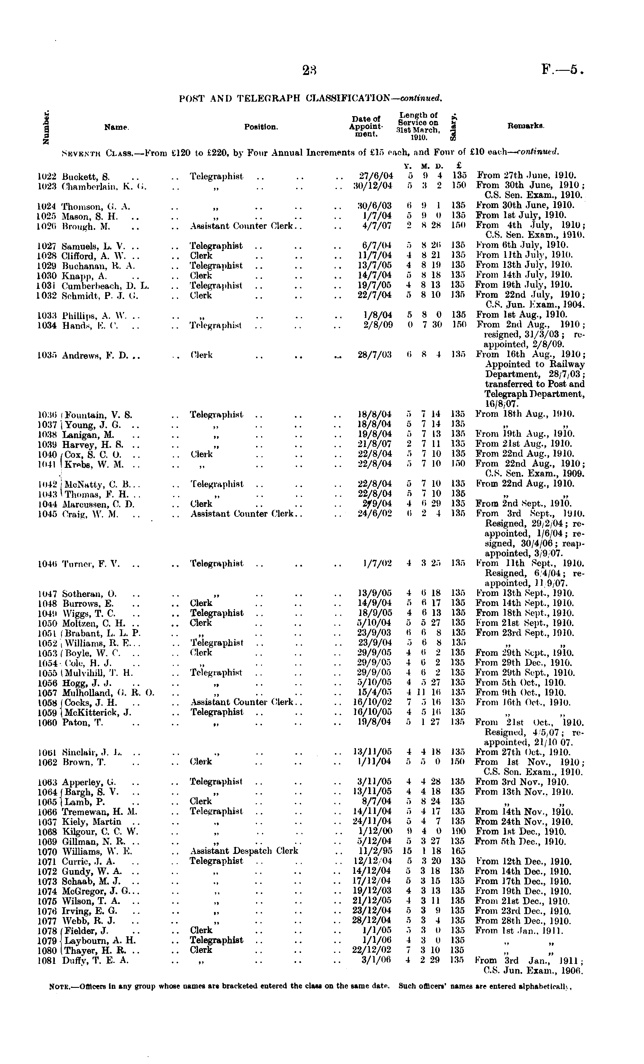 POST AND TELEGRAPH CLASSIFICATION— continued. • Date of length of £ I Name. Poeition. Appoint- I Remarks. a ment. ' IWft • g sk\ bhth Class.—Krom U2O to t220, by Four Annual Increments of £16 eaoh, and Four of UO each— tonUmn i. y. M. d. £ 1022 linckett, S. .. .. Telegraphist .. .. .. 27/6/04 6 9 4 18S From 27th June, 1010. 1023 Chamberlain, K. G. .. „ .. .. .. 30/12/04 r> 3 2 150 From 30th June, 1910; C.S. Sen. Exam., 1910. 1024 Thomson, G. A. .. „ .. .. .. 30/6/03 6 9 I 136 From 30th June, 1910. 1025 Mason, 8. H. .. .. „ .. .. .. 1/7/04 6 9 0 180 From Ist July, 1910. 1020 Brough. M. .. .. Assistant Counter Clerk.. .. 4/7/07 28 28 160 From 4th July, 1910; C.S. Sen. Exam., 1910. 1027 Samuels, L. V. .. .. Telegraphist .. .. .. 6/7/04 5 826 186 From 6th July, 1910. 1028 Clifford, A. W. .. .. Clerk .. .. .. 11/7/04 1 821 135 From 11th July, 1910. 1029 Buchanan. R. A. .. Telegraphist .. .. .. 13/7/05 4 8 1!) 135 From 13th July, 1910. 1030 Knapp, A. .. .. Clerk .. .. .. 14/7/04 6 BIS 186 From 14th July, 1910. 1031 Cumberbeaqh, D. L. .. Telegraphist .. .. .. 19/7/05 4 813 136 From 19th July, 1910. 1032 Schmidt, P. J. G. .. Clerk .. .. .. 22/7/04 6 SlO 186 Krom 22nd .Inly, 1910; C.S. .Inn. I Nam., 1904. 1033 Phillips, A. W. .. .. .. .. .. 1/8/04 5 8 0 135 From let Aug., 1910. 1034 Hands, E. 0, .. .. Telegraphist .. .. .. 2/8/09 0 730 150 From 2nd Aug.. 1910; resigned, 31/3/03; reappointed, 2/8/09. 1035 Andrews, F. D. .. .. Clerk .. .. ... 28/7/03 6 8 1 186 1-Yom 16th Aug., 1910; Appointed to Railway Department, 28/7,03; transferred to Post and Telegraph Department, 16/8,07. 1030 I Fountain, V. 8. .. Telegraphist .. .. .. 18/8/04 ."> 714 136 From 18th Aug.. 1910. 1037 i Young, J. 0. .. .. „ .. .. .. 18/8/04 6 714 136 1038 Lanigan, M. .. .. „ .. .. .. 19/8/04 ."> 713 136 From 19th Aug., 1910. 103!) Harvey, H. S „ 21/8/07 2 711 135 From 21st Aug., 1910. 1040/ Cox, S. C. O. .. .. Clerk .. .. .. 22/8/04 6 710 135 From 22nd Aug., 1910. 1(141 IKi-ros. \V. M. . .. ~ .. .. .. 22/8/04 S 710 L6O From 22nd Aug., 1910; C.S. Sen. Exam., 1909. 1042 MoNatty, C. 11. . .. Telegraphist .. .. .. 22/8/04 6 710 i:i."> Krom 22nd Aug., 1910. 10431 Thomas, F. H. .. .. „ .. .. .. 22/8/04 5 710 135 1044 Maroussen, C. D. .. Clerk .. .. .. 2f9/04 4 829 186 From 2nd Sept., 1910. 1046 Craig, W. M. .. .. Assistant Counter Clerk. . .. 24/6/02 6 2 I 186 From 3rd Sept., 1910. Resigned, 29,2,04; reappointed, 1/6/04; resigned, 30/4/06; reapappointed, :! 9 (17. 1046 Turner, F. V. .. .. Telegraphist .. .. .. 1/7/02 4 326 186 Krom 11th Sept., 1910. Resigned, 6 4/04; reappointed, 11 9,07. 1047 Sotheran, O. .. .. „ .. .. -. 18/9/06 4 i>lB KS."> Krom 13th Sept.. 1910. 1048 Burrows. E. .. .. Clerk .. .. .. 14/9/04 5 817 135 From 14th Sept., 1910. loi'.i SViggs, T. C. .. .. Telegraphist .. .. .. 18/9/05 4 618 135 From 18th Sept., 1910. 1050 Molt/on, C. H. .. .. Clerk .. .. .. 5/10/04 6 527 L 35 Krom 21st Sept., 1910. 1051 (Brabant, L. L. P. „ .. .. .. 23/9/03 8 6 s 185 From 23rd Sept., 1910. 1052 , Williams, R. E... .. Telegraphist .. .. .. 23/9/04 5 6 8 186 1053 (Boyle, W. C. .. .. Clerk .. .. .. 29/9/05 4 (i 2 135 From 29th Sept., 1910. 1064 - Cole, H. J. .. .. .. .. .. 29/9/05 4 0 2 LB6 Krom 29th Dec. 1910. 1066 AlulvihiU, T. H. .. Telegraphist .. .. .. 29/9/05 4 6 2 186 Krom 29th Sept., 1910. 1056 Hogg, .I. .1. .. .. ~ .. .. .. 5/10/05 4 r>27 136 From sth Oct., 1910. 1067 Mufholland, G. R. O. .. „ .. •■ •■ 15/4/05 411 l(i 136 From 9th Oot., 1910. 1058 (Cocks, .I. 11. .. .. Assistant Counter Clerk.. .. 16/10/02 7 ."> Hi 135 From 16th Oct., 1910. 1059 IMoKitteriok, J. .. Telegraphist .. .. .. 10/10/05 4 r>lll 185 1080 Paton, T. .. .. „ .. .. .. 19/8/04 r> 127 186 From 21st Oct.. 1910. Resigned, 4/6/07j reappointed, 21/10 07. 1001 Sinclair, J. L. .. .. ~ .. .. .. 13/11/05 4 4IS 186 Krom 27th Oct., 1910. 1062 Brown. T. .. .. Clerk .. -- .. 1/11/04 r> 5 <> 150 From Ist Nov., 1910; C.S. Sen. Exam., 1910. 1063 Apperley, G. .. .. Telegraphist .. .. .. 3/11/05 4 428 LSS From 3rd Nov., 1910. 1064(Bargh, S. V. .. .. „ .. .. .. 13/11/05 4 418 135 From 13th Nov.. 1910. 10051 Lamb, P Clerk 8/7/04 5 824 135 1066 Tremewiui, H. M. .. Telegraphist .. .. .. 14/11/04 5 417 186 From 14th Nov., 1910. 1037 Kiely, iMartin .. .. ~ .. .. .. 24/11/04 5 4 7 186 From 24th Nov., 1910. 1068 Kilgour, C. C. W. .. ~ .. .. .. 1/12/00 9 4 0 190 From Ist Dec., 1910. 1069 Gillman, X. R. .. .. „ .. .. -. 5/12/04 5 327 136 From sth Deo., 1910. 1070 Williams, W. E. .. Assistant Despatch Clerk .. 11/2/95 15 118 105 1071 Currie, J. A. .. .. Telegraphist .. .. .. 12/12/04 5 320 135 Krom 12th Dec, 1910. 1072 Gundy, W. A. .. .. „ .. .. .. 14/12/04 5 318 135 From 14th Dec, 1910. 1073 Schaab, M. J. .. .. ~ .. .. .. 17/12/04 5 316 136 From 17th Dec, 1910. 1074 McGregor, J. C... .. „ .. .. .. 19/12/03 4 313 185 From 19th Dec, 1910. 1075 Wilson, T. A. .. .. „ .. .. .. 21/12/05 4 311 135 From 21st Dec., 1910. 1076 Irving, E. G. .. .. „ .. .. .. 23/12/04 5 3 9 135 From 23rd Dec, 1910. 1077 Webb, R. J. .. .. „ .. .. .. 28/12/04 6 8 4 135 From 28th Dec, 1910. 1078 (Fielder, J. .. .. Clerk .. .. .. 1/1/05 5 3 0 135 From Ist Jim.. 1911. 1079 Laybourn, A. H. .. Telegraphist .. .. .. 1/1/06 4 8 0 135 1080 iThayer, H. R. .. .. Clerk .. .. .. 22/12/02 7 310 135 1081 Duffy, T. E. A. .. .. .. .. 3/1/06 4 229 135 Krom 3rd Jan., 1911; C.S. Jun. Exam., 190(i. Note. —Officers In any irroup whose names are bracketed entered the class on the same date. Such officers' names are entered alphabet iralh .