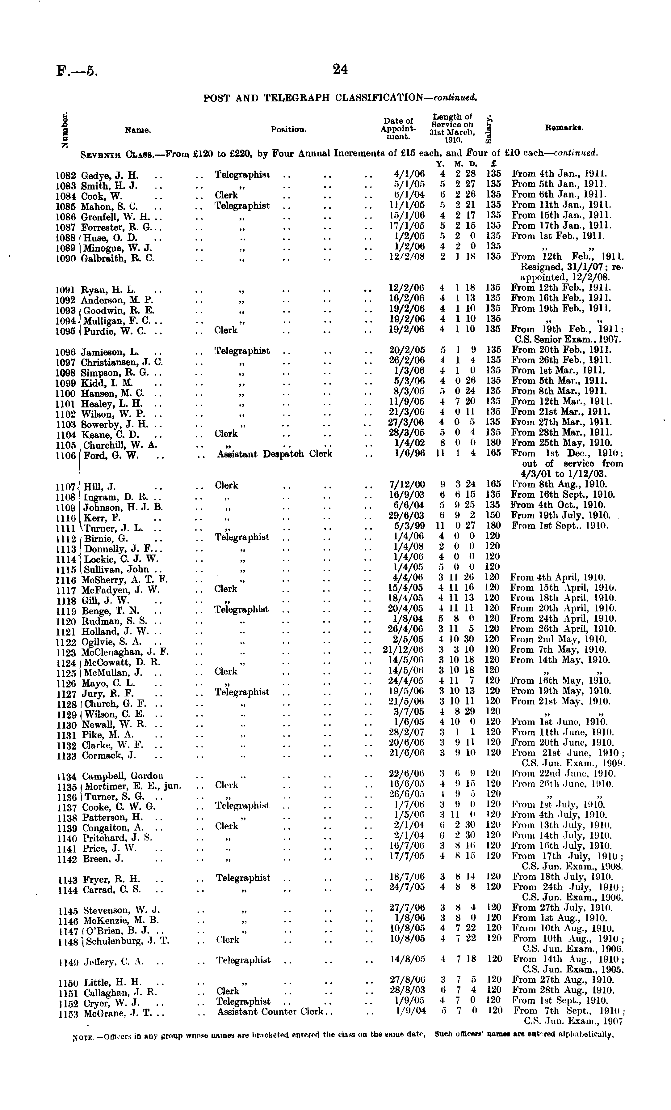 POST AND TELEGRAPH CLASSIFICATION— continued. 'i Dateot Length of £ 1 Name. Position. Appoint- £ Hemarki. D ment. 191n a Seventh Class. From £120 to £220, by Four Annual Increments of £15 each, and Four of £10 each—continued. Y. M. D. £ 1082 Gedye, J. H. .. .. Telegraphist .. .. .. 4/1/06 4 228 135 From 4th Jan., lull. 1083 Smith, H. J „ tyl/05 5 227 135 From sth Jan., 1911. 1084 Cook, W. .. .. Clerk .. .. .. (I/1/04 0 226 135 From 6th Jan., 1911. 1085 Mahon, H. 0. .. .. Telegraphist .. .. .. 11/1/05 5 221 135 From 1 Ith Jan., 1911. 1086 Grenfell, W. H. .. .. „ .. •• •• 15/1/06 4 217 135 From 15th Jan.. 1911. 1087 Forrester, E. G „ 17/1/05 5 215 135 From 17th Jan., 1911. lOBB|Huse, 0. D .. 1/2/05 6 2 0 135 From Ist Feb., 1911. 1089 Minogue, W. J. .. ~ 1/2/06 4 2 0 135 1090 Galbraith, R. C. .. ~ 12/2/08 2 1 18 135 From 12th Feb., 1911. Resigned, 31/1/07; reappointed, 12/2/08. 1091 Rvan H L „ .. .. .. 12/2/00 4I 18 135 From 12th Feb., 1911. 1092 Anderson, M. P. .. „ 16/2/06 4 113 186 From 16th Feb., 1911. 10931 Goodwin, R. E. .. „ 19/2/06 4 110 135 From 19th Feb., 1911. 1094 Mulligan, F. C „ 19/2/06 4 110 135 1095 IPurdie, W. C. .. .. Clerk .. .. .. 19/2/06 4 110 135 From 19th Feb., 1911: C.S. Senior Exam.. 1907. 1096 Jamieson, L. .. .. Telegraphist .. .. .. 20/2/05 5 J it 136 From 20th Feb., 1911. 1097 Christiansen, J. C. .. „ 26/2/06 4 1 4 135 From 26th Feb., 1911. 1098 Simpson, R. G „ 1/3/06 4 1 0 135 From Ist Mar., 1911. 1099 Kidd I M .. „ .. •• •• 5/3/06 4 026 135 From sth Mar., 1911. 1100 Hansen MC „ •■ •• •• 8/3/05 6 024 135 From Bth Mar., 1911. 1101 Healey.VH.' .'. .. „ 11/9/05 4 720 135 From 12th Mar., 1911. 1102 Wilson W P . „ ■• ■■ •• 21/3/00 4 011 135 From 21st Mar., 1911. 1103 Sowerby J H .. „ •• •• ■■ 27/3/06 4 0 6 135 From 27th Mar., 1911. 1104 Keane C. D Clerk 28/3/05 5 0 4 135 From 28th Mar., 1911. 1105 Churchill, W. A. .. 1/4/02 8 0 0 180 From 25th May, 1910. 1106 Ford, G. W. .. .. Assistant Despatoh Clerk .. 1/6/96 11 1 4 166 From Ist Dec, 1910; out of service from 4/3/01 to 1/12/03. 1107 Hill J Clerk .. .. .. 7/12/00 9 324 165 I'rom Bth Aug., 1910. 11081 Ingram DR. .... 16/9/03 (i t> 15 135 From 16th Sept., 1910. 1109 Johnson, H.J. B 6/6/04 6 (125 135 From 4th Oct., 1910. 1110 Kerr F . •• •• •• 29/6/03 6 9 2 150 From 19th July, 1910. 11l VTiirner J L , . •• •• 5/3/99 11 027 180 From Ist Sept.. 1910. Ul2|Birnie,'G.' '.'. .. Telegraphist 1/4/00 40 0 120 1113 I Donnelly, J. F , 1/4/08 2 0 0 120 1114!Lockie,'C. J. W 1/4/06 4 0 0 120 1115 I Sullivan, John .. .. „ .. •• •• 1/4/05 50 0 120 1116 McSherry, A. T. F. .. ~ 4/4/06 3 1120 120 From 4th April, 1910. 1117 McFadyen, J. W. .. Clerk 15/4/05 4 1116 120 From 16th April, 1910. 1118 GiU J'\V „ .. ■• .. 18/4/05 411 13 120 From IBUI April. 1910. 1110 Ben'ue T N .. Telegraphist .. .. .. 20/4/05 4 1111 120 From 20th April, 1910. 1120 Rudm'an, S. S „ 1/8/04 5 8 0 120 From 24th April, 1910. 11<H Holland J W •• •• •• 26/4/00 311 6 120 From 20th April, 1910. 1122 Oeilvie'S 'A '.'. „ .. •• •• 2/5/05 410 30 120 From 2nd May, 1910. 1123 McClenac-han, J. F. .. .. 21/12/06 3 310 120 From 7th May, 1910. 1124|McCowatt, D. R. .. „ 14/5/06 310 18 120 From 14th May. 1910. 1125 I McMullan, J Clerk 14/5/06 310 18 120 1120 Mayo C L .. „ 24/4/05 411 7 120 From 10th May, 1910. 1127 Jury R F Telegraphist .. .. .. 19/5/06 310 13 120 From 19th May. 1910. 1128 (Church'G - F •• •• •• 21/5/00 310 11 120 From 21st May. 1010. 1129 I Wilson,'C.'e.' 3/7/05 4 829 120 mo Newall W R .... 1/6/05 410 0 120 From Ist June, 1910. 1131 Pike M. A. ' '.'. .. •• •• •• •• 28/2/07 3 1 1 120 From 11th June, 1910. 1132 Clarke W F .. .. •■ •• 20/6/06 :'. it II 120 From 20th June, 1910. im Corma'ck J .... 21/6/00 3 910 120 From 21st June. KHO : C.S. Jim. Exam., 1809. 1134 Campbell, Gordon .. .. .. .. •■ 22/0/00 :{ 6 9 120 From 22nd June, 1910. 1135 I:Mortimer, E. E., jun. .. Clerk 16/6/05 4 916 120 Prom 26th June, 1910. 11361 Turner, S. G , 26/6/05 4 9 5 120 1137 Cooke C. W. G. .. Telegraphist .. .. .. 1/7/00 3 9 0 120 Prom let July, 1910. 1138 Patterson, H , 1/5/00 311 0 120 From 4th July, 1910. 1139 Congalton, A Clerk 2/1/04 6 230 120 From 13th July, 1140 Pritehard. J. S. .. „ 2/1/04 6 230 120 From 14th July, 1910. 1141 I'rice J W „ ...... 16/7/00 II 816 120 From Kith July, 1910. 1142 Breen J „ ...... 17/7/05 4 8 l."> L2O Prom ITtli July, 1910; C.S. Jun. Exam., 1908. 1143 Fryer R H .. Telegraphist .. .. .. 18/7/00 3 814 120 From 18th July, 1910. 1144 Carrad, C. S „ 24/7/05 4 8 8 120 From 24th July, 1910; C.S. Jun. Exam., 1906. 1145 Stevenson, W. J. .. „ 27/7/06 3 8 4 120 From 27th July. I ill 11. 1146 McKenzie, M. B. .. „ 1/8/06 3 8 0 120 From Ist Aug., lit 10. 1147 (O'Brien B J „ .... 10/8/05 4 722 120 From 10th Aug., 1910. ll4BlSchuleni>un;. J.T. .. Clerk 10/8/05 4 722 120 From l Oth Aug., 1910; C.S. Jun. Exam.. 1906. I14<) Jellerv C. A .. Telegraphist .. .. .. 14/8/05 4 718 120 From 14th Aug., 1910: " ■ C.S. Jun. Exam., 1905! 1150 Little, H. H „ 27/8/00 3 7 5 120 From 27th Aug., 1910. 1151 Callaghan, J. R. .. Clerk 28/8/03 6 7 4 120 From 28th Aug., 1910. 115' Cryer" WI. .. .. Telegraphist .. .. .. 1/9/05 4 7 0 120 From Ist Sept., 1910. 1153 McGrane J. T. .. .. Assistant Counter Clerk.. .. 1/9/04 6 7 0 120 From 7th Sept.. 1910; C.S. Jun. Exam., 1907 (low.— Offlcera in nny group whoso names are bracketed entered the cla« on the eaiqe date, Such officer* , nuru.i are entered nlpbnboticaily.