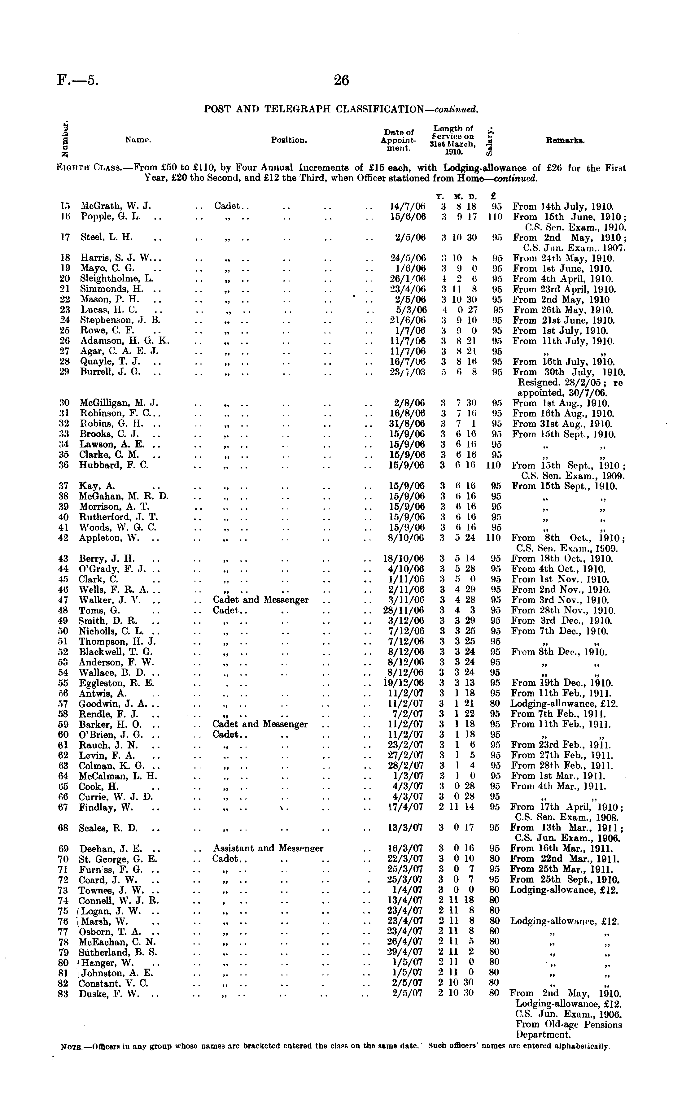 POST AND TELEGRAPH CLASSIFICATION— continued. 1 Date of Length of 3 Nome. Poiition. Appoint- jj Remarks. I ment. lglo " ' d EIGHTH CLASS.—From £50 to £110, by Four Annual Increments of £15 each, with Lodging-allowance of £20 for the First Year, £20 the Second, and £12 the Third, when Officer stationed from Home— continued. Y. M. D. £ 15 McGrath, W. J. .. Cadet.. .. .. .. 14/7/Oti 3 HlB 96 From 14th July, 1910. Iβ Popple, G. L. .. .. .. .. 15/6/06 3 it 17 lit) From 15th June, 1910; C.B. Sen. Exam., 1910. 17 Steel. L. H. .. .. „ .. . . .. .. 2/5/06 310 30 96 From 2nd May, 1910; C.S. Jim. Exam., 1907. 18 Harris, S. J. W... .. „ .. .. .. .. 24/5/06 I! 1(1 8 96 From 24th May, 1910. I.l Mayo. C. G. .. .. .. .. 1/6/06 It 9 0 9. r ) From Ist June, 1910. 20 Sleightholme, L. .. „ .. .. .. .. 26/1/00 4 2 0 96 From 4th April, 1910. 21 Siramonds, H. .. .. „ .. .. .. .. 23/4/00 311 8 96 From 23rd April, 1910. 22 Mason, P. H. .. .. .. ' .. 2/5/06 310 30 96 From 2nd May, 1910 23 Lucas, H. C. .. .. „ .. .. .. .. 5/3/06 4 027 96 From 26th May, 1910. 24 Stephenson, J. B. .. .. .. 21/6/06 3 010 96 From 21st June, 1910. 25 Rowe, 0. F. .. .. .. .. 1/7/06 3 8 0 96 From Ist July, 1910. 26 Adamson, H. G. X .. .. .. 11/7/06 3 821 90 From 11th July, 1910. 27 Agar, C. A. E. J. .. .. .. 11/7/06 3 821 96 28 Quayle, T. J. .. .. .. .. 16/7/06 3 BHi 96 From 16th July, 1910. 29 Burrell, J. G. .. .. „ .. .. .. .. 23/7/03 6 8 8 95 From 30th July, 1910. Resigned. 28/2/05 ; re appointed, 30/7/06. 30 McGilligan, M. J. .. .. .. 2/8/06 3 730 95 From Ist Aug., 1910. 31 Robinson, F. C... .. .. .. 16/8/06 3 7lβ 96 From 16th Aug., 1910. 32 Robins, G. H. .. .. .. .. 31/8/06 3 7 I 96 From 31st Aug., 1910. 33 Brooks, C. J. .. .. „ .. .. .. .. 15/9/06 3 010 96 From loth Sept., 1910. 34 Lawson, A. E. .. .. .. .. 15/9/06 3 010 95 35 Clarke, CM... .. „ .. .. .. .. 15/9/06 3 6lβ 96 36 Hubbard, F. C. .. .. .. 15/9/06 3 6lβ 110 From 15th Sept., 1910 ; C.S. Sen. Exam., 1909. 37 Kay, A. .. .. .. .. 15/9/06 3 010 96 From 15th Sept., 1910. 38 McGahan, M. R. D .. .. .. 15/9/06 3 t> Iβ 96 39 Morrison, A. T. .. .. .. 15/9/06 3 Blβ 96 40 Rutherford, J. T. .. „ .. .. .. .. 15/9/06 3 6lβ 95 41 Woods, W. G. C. .. .. .. 15/9/06 3 6lβ 96 42 Appleton, W. .. .. .. .. 8/10/00 3 524 110 From Bth Oct., 1910; C.S. Sen. Exam., IGO9. 43 Berry, J. H. .. . . „.. .. . . .. 18/10/06 3 514 96 From 18th Oct., 1910. 44 O'Grady, F. J. .. .. .. .. 4/10/06 3 528 95 From 4th Oct., 1910. 45 Clark, C. .. .. .. .. 1/11/06 3 5 0 95 From Ist Nov.. 1910. 46 Wells, F. R. A. .. .. „ .. .. .. .. 2/11/06 3 429 95 From 2nd Nov., 1910. 47 Walker, J. V. .. .. Cadet and Messenger .. .. 3/11/06 3 428 95 From 3rd Nov., 1910. 48 Toms, G. .. .. Cadet.. .. .. .. 28/11/06 3 4 3 95 From 28th Nov., 1910. 49 Smith, D. R. .. .. .. .. 3/12/06 3 329 95 From 3rd Dec, 1910. 50 Nicholls, C. L. .. .. .. .. 7/12/06 3 3 2.") 96 From 7th Dec, 1910. 51 Thompson, H. J. .. .. .. 7/12/06 3 325 96 52 Blackwell, T. G. .. „ .. .. .. .. 8/12/06 3 324 95 From Bth Dec. 1910. 53 Anderson, F. W. .. .. .. 8/12/06 3 324 95 54 Wallace, B. D. .. .. .. .. 8/12/06 3 324 95 55 Eggleston, R. E. . .. .. 19/12/06 3 313 95 From 19th Dec, 1910. r>6 Antwis, A. .. .. .. .. 11/2/07 3 118 95 From 11th Feb., 1911. 57 Goodwin, J. A. .. .. .. .. 11/2/07 3 121 80 Lodging-allowance, £12. 58 Rendle, F. J. „ .. .. .. .. 7/2/07 3 122 95 From 7th Feb., 191 I. 59 Barker, H. 0. .. .. Cadet and Messenger .. .. 11/2/07 3 118 95 From 11th Feb., 1911. 60 O'Brien, J. G. .. .. Cadet.. .. .. .. 11/2/07 3 118 95 61 Rauch, J. N. .. .. .. .. 23/2/07 3 1 6 95 From 23rd Feb., 1911. 62 Levin, F. A. .. . .. .. 27/2/07 3 15 95 From 27th Feb., 1911. 63 Colman. K. G. .. .. .. .. 28/2/07 3 1 4 96 From 28tl\ Feb., 1911. 64 McCalman, L. H. .. „ .. .. .. .. 1/3/07 3 I 0 95 From Ist Mar., 1911. 155 Cook, H. .. .. .. .. 4/3/07 3 028 95 From 4th Mar., 1911. 06 Currie, W. J. D. . . . . .. 4/3/07 3 028 95 67 Findlay, W. .. .. „ .. \. .. .. 17/4/07 211 14 96 From 17th April, 1910; C.S. Sen. Exam., 1908. 68 Scales, R. D. .. .. „ .. .. .. .. 13/3/07 3 017 95 From 13th Mar., 1911; C.S. Jun. Exam., 1906. 69 Deehan, J. E. .. .. Assistant and Messeneer .. 16/3/07 3 016 95 From 10th Mar., 1911. 70 St. George, G. E. .. Cadet.. .. .. .. 22/3/07 3 010 80 From 22nd Mar., 1911. 71 Furnss, F. G. .. .. „ .. .. .. . 25/3/07 3 0 7 95 From 25th Mar., 1911. 72 Coard, J. W. .. . - „ .. .. .. . 25/3/07 3 0 7 95 From 25th Sept., 1910. 73 Townes, J. W. .. .. „ .. .. .. .. 1/4/07 3 0 0 80 Lodging-allov.ance, £12. 74 Connell, W. J. R. .. ~ .. .. .. .. 13/4/07 2 1118 80 75 (Logan, J. W. .. .. .. .. 23/4/07 211 8 80 76 t Marsh, W. .. .. „ .. .. .. .. 23/4/07 211 8 80 Lodging-allowance, £12. 77 Osborn, T. A. .. .. „ .. .. .. .. 23/4/07 211 8 80 78 McEachan, C. N. 26/4/07 211 5 80 79 Sutherland, B. S. 29/4/07 211 2 80 80 (Hanger, W 1/5/07 211 0 80 81 i Johnston, A. E. .. .. .. 1/5/07 211 0 80 82 Constant. V. C. .. , .. 2/5/07 210 30 80 SI) Duske, F. W. .. .. „ -. .. .. .. 2/5/07 210 30 80 From 2nd May, 1910. Lodging-allowance, £12. C.S. Jun. Exam., 1900. From Olcl-n{_'c Pensions Department. Nora. —Officers in any group whose names are bracketed entered the class on the same date. Such officers' names are entered alpliabelically.