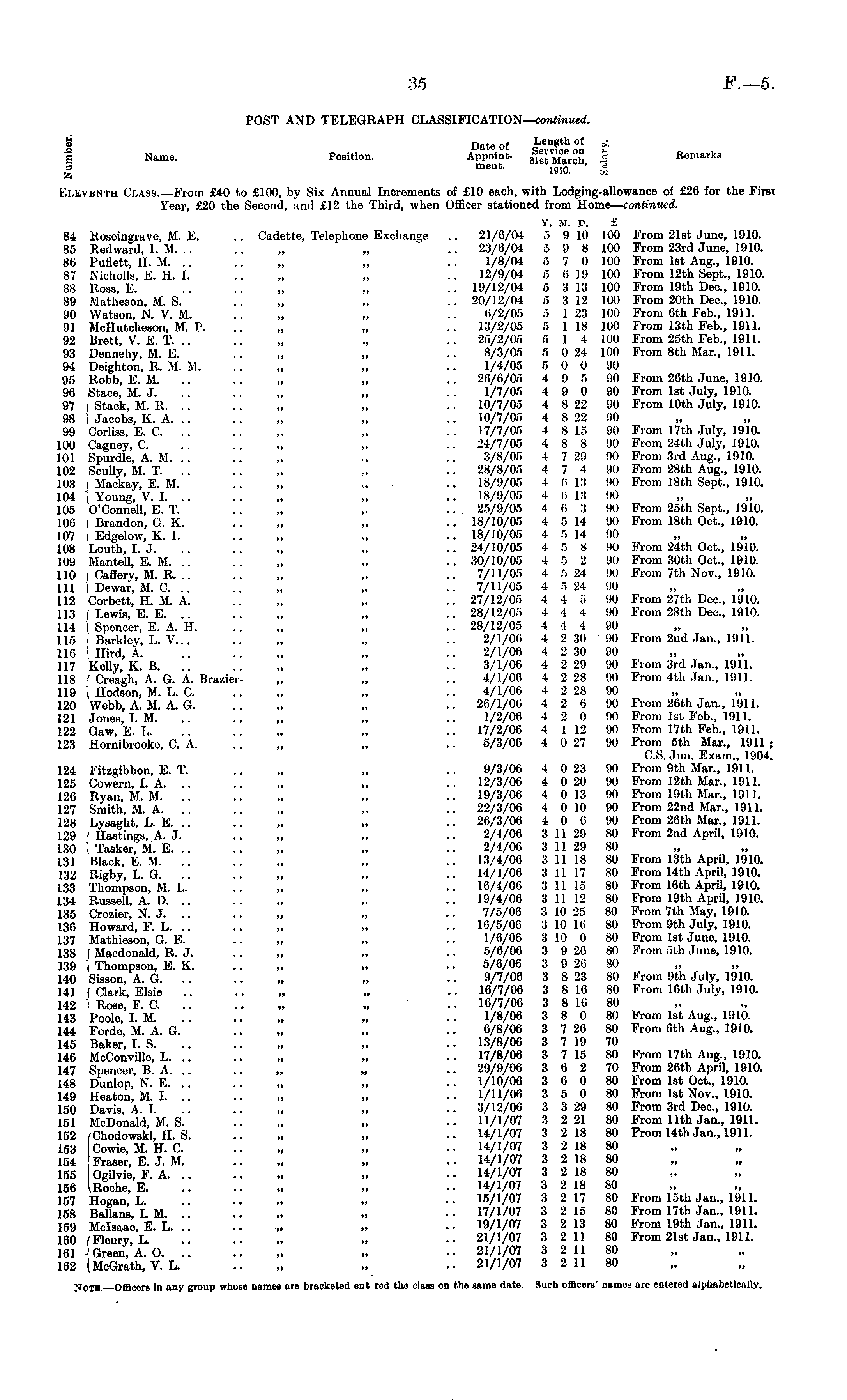 POST AND TELEGRAPH CLASSIFICATION— continued. » Date of Length of & 1 Name. Position. Appoint- o^m 0 ™? £ Remarks 3 meat. im • g Eleventh Class.—From £40 to £100, by Six Annual Increments of £10 each, with Lodging-allowance of £26 for the First year, £20 the Second, and £12 the Third, when Officer stationed from Home— continued. v. M. i>. £ 84 Roseingrave, M. E. .. Cadette, Telephone Exchange .. 21/6/04 5 910 100 From 21st June, 1910. 85 Redward, 1. M. . . .. „ „ .. 23/6/04 5 9 8 100 From 23rd June, 1910. 86 Pußett, H. M. .. .. „ „ .. 1/8/04 5 7 0 100 From Ist Aug., 1910. 87 Nicholls, E. H. I. „ „ .. 12/9/04 5 Gl9 100 From 12th Sept., 1910. 88 Ross, E. .. .. „ „ .. 19/12/04 5 313 100 From 19th Dec, 1910. 89 Matheson, M. S. .. „ „ .. 20/12/04 5 312 100 From 20th Dec, 1910. 90 Watson, N. V. M. . „ .. 0/2/05 5 123 100 From 6th Feb., 1911. 91 McHutcheson, M. P. .. „ .. 13/2/05 5 118 100 From 13th Feb., 1911. 92 Brett, V. E. T. .. .. „ „ .. 25/2/05 5 1 4 100 From 25th Feb., 1911. 93 Dennehy, M. E. .. „ „ .. 8/3/05 5 024 100 From Bth Mar., 1911. 94 Deighton, R. M. .\I „ .. 1/4/05 5 0 0 90 95 Robb, E. M. .. .. „ „ .. 20/6/05 4 9 5 90 From 26th June, 1910. 96 Stace, M. J. .. .. „ „ .. 1/7/05 4 9 0 90 From Ist July, 1910. 97 I Stack, M. R. .. .. „ „ .. 10/7/05 4 822 90 From 10th July, 1910. 98 I Jacobs, K. A. .. .. „ „ .. 10/7/05 4 822 90 99 Corliss, E. C. .. .. „ „ .. 17/7/05 4 815 90 From 17th July, 1910. 100 Cagney, C. .. .... „ .. 24/7/05 4 8 8 90 From 24th July, 1910. 101 Spurdle, A. M. .. .. ~ .. 3/8/05 4 729 90 From 3rd Aug., 1910. 102 Scully, M. T. .. .. .. .. .. 28/8/05 4 7 4 90 From 28th Aug., 1910. LO3 Mackay, E. M. „ „ .. 18/9/05 I 6L3 90 From 18th Sept., 1910. 104 i Young, V. I „ ~ .. 18/9/05 4 613 90 105 O'Connell, E. T. . . .. 25/9/05 I 6 3 90 From 25th Sept., 1910. 106 I Brandon, G. K. .. „ .. .. 18/10/05 I 6 U 90 From 18th Oct., 1910. 107 I Edgelow, K. I. .. „ .. 18/10/05 4 514 90 108 Louth, I. J. .. ~ „ .. 24/10/05 4 5 8 90 Prom 24th Oct., 1910. 109 Mantel], E. M. „ „ .. :iO/10/05 4 5 2 90 From 30th Oct., 1910. 110 i Gaffery, M. R. .. „ .. 7/11/05 4 524 90 From 7th Nov., 1910. 111 (Dewar, M. C „ .. 7/11/05 4 524 90 112 Corbett, H. M. A. „ „ .. 27/12/05 4 4 5 90 From 27th Dec, 1910. 113 I Lewis, E. E. .. .. „ .. 28/12/05 4 4 4 90 From 28th Dec, 1910. 114 1 Spencer, E. A. H „ .. 28/12/05 4 4 4 90 115 I Barkley L. V. „ „ .. 2/1/06 4 230 90 From 2nd Jan., 1911. 116 I Hird, A , „ .. 2/1/06 4 230 90 117 Kelly, K. B. .. .. „ .. 3/1/06 4 229 90 From 3rd Jan., 1911. 118 [ Creagh, A. G. A. Brazier- „ „ .. 4/1/00 42 28 90 From 4th Jan., 1911. 119 1 Hodson, M. L. C „ .. 4/1/06 4 228 90 120 Webb, A. M. A. G. .. „ .. 26/1/00 4 2 6 90 From 26th Jan., 1911. 121 Jones, I. M. .. „ „ .. 1/2/06 4 2 0 90 From Ist Feb., 1911. 122 Gaw, E. L. .. .. „ .. 17/2/06 4 112 90 From 17th Feb., 1911. 123 Hornibrooke, C. A. „ .. 5/3/06 4 027 90 From sth Mar., 1911 ; C.S. J;m. Exam., 1904. 124 Fitzgibbon, E. T. „ „ .. 9/3/06 4 023 90 From 9th Mar., 1911. 125 Cowern, I. A. .. .. „ .. 12/3/06 4 020 90 From 12th Mar., 1911. 126 Ryan M M „ „ .. 19/3/06 4 013 90 From 19th Mar., 1911. 127 Smith, M. A. .. .. „ .. 22/3/06 4 010 90 From 22nd Mar., 1911. 128 Lysaght, L. E. .. „ „ .. 26/3/06 40 0 90 From 26th Mar., 1911. 129 I Hastings, A. J. .. „ .. 2/4/06 3 1129 80 From 2nd April, 1910. 130 I Tasker, M. E „ .. 2/4/06 311 29 80 131 Black E. M. .. „ .. 13/4/06 3 1118 80 From 13th April, 1910. 132 Rigby, L. G. .. .. „ .. 14/4/06 3 1117 80 From 14th April, 1910. 133 Thompson, M. L. .. „ .. 16/4/06 3 1115 80 From 16th April, 1910. 134 Russell, A. D. .. „ .. 19/4/06 3 1112 80 From 19th April, 1910. 135 Crozier, N. J. „ „ .. 7/5/06 310 25 80 From 7th May, 1910. 136 Howard F. L .. „ „ .. 16/5/06 310 16 80 From 9th July, 1910. 137 Mathieson, G. E. .. „ „ .. 1/6/06 310 0 80 From Ist June, 1910. 138 I Macdonald, R. J. .. „ ~ ■. 5/6/06 3 926 80 From sth June, 1910. 139 I Thompson, E. X „ .. 5/6/06 3 !) 20 80 140 Sisson 4 G .. „ „ • • 9/7/06 3 823 80 From 9th July, 1910. 141 ( Clark, Elsie „ .. 16/7/06 3 816 80 From 16th July, 1910. 142 I Rose, F. C , „ .. 16/7/06 3 816 80 143 Poole, I. M. .. .. „ „ .. 1/8/06 3 8 0 80 From Ist Aug., 1910. 144 Forde, M. A. G. .. „ ~ . ■ 6/8/06 3 726 80 From 6th Aug., 1910. 145 Baker, I. S „ .. 13/8/06 3 719 70 146 McConville, L „ .. 17/8/06 3 715 80 From 17th Aug., 1910. 147 Spencer B A „ „ .. 29/9/06 3 6 2 70 From 26th April, 1910. 148 Dunlop N E .. „ „ .. 1/10/06 36 0 80 From Ist Oct., 1910. 149 Heaton MI. .. „ „ .. 1/11/06 3 5 0 80 From Ist Nov., 1910. 150 Davis A I „ „ .. 3/12/06 3 329 80 From 3rd Dec, 1910. 151 McDonald, M. S. .. „ ~ •■ 11/1/07 3 221 80 From 11th Jan., 1911. 152 Chodowski, H. S „ .. 14/1/07 3 218 80 From 14th Jan., 1911. 153 Cowie, M. H. C. .. „ ~ • • 14/1/07 3 218 80 154 Fraser, E. J. M. .. „ „ . ■ 14/1/07 32 18 80 155 Ogilvie, F. A „ .. 14/1/07 3 218 80 156 Roche, E „ .. 14/1/07 3 218 80 157 Hogan L .. „ .. 15/1/07 3 217 80 From 15th Jan., 1911. 158 Ballans, I. M „ .. 17/1/07 3 215 80 From 17th Jan., 1911. 159 Mclsaac, E. L „ .. 19/1/07 3 213 80 From 19th Jan., 1911. 160 rFleury L „ ~ •• 21/1/07 3 211 80 From 21st Jan., 1911. 161 Green,'A.'O. '.. .. „ ■■ 21/1/07 3 211 80 162 (McGrath, V. L. „ „ .. 21/1/07 3 211 80 Note. Officers in any group whose names are bracketed cut red the class on the same date. Such officers' names are entered alphabetically.