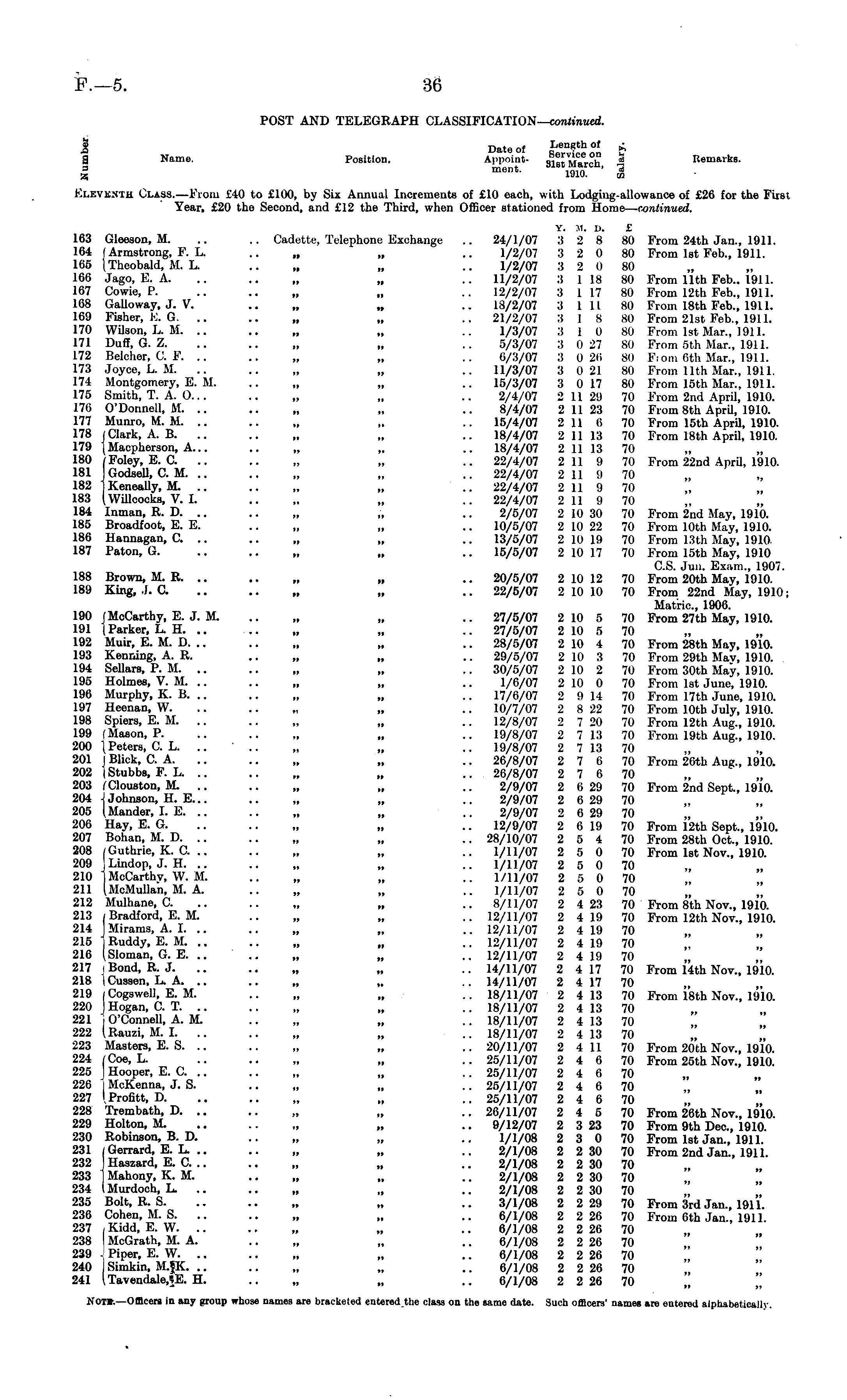 POST AND TELEGRAPH CLASSIFICATION— continued. jj Date of Length of £ a Name. Position. Appoint- 3 is™M C a e r °£ 3 Remarks. 3 ment. 1910 ■ a Eleventh Class.—From £40 to f 100, by Six Annual Increments of £10 each, with Lodging-allowance of £26 for the First Year, £20 the Second, and £12 the Third, when Officer stationed from Home— continued. y. M. i>. £ 163 Gleeson, M. .. .. Cadette, Telephone Exchange .. 24/1/07 3 2 8 80 From 24th Jan., 1911. 164 ( Armstrong, F. L. .. „ .. 1/2/07 3 2 0 80 From Ist Feb., 1911. 165 (Theobald, M. L. .. „ „ .. 1/2/07 3 2 0 80 166 Jago, E. A. .. .. „ .. 11/2/07 3 118 80 From 11th Feb.. 1911. 167 Cowie, P. .. .. „ .. 12/2/07 3 117 80 From 12th Feb., 1911. 168 Galloway, J. V. .. „ .. 18/2/07 3 111 80 From 18th Feb., 1911. 169 Fisher, K. G. .. .. „ .. 21/2/07 3 18 80 From 21st Feb., 1911. 170 Wilson, L. M. .. .. „ .. 1/3/07 3 10 80 From Ist Mar., 1911. 171 Duff, G. Z. .. .. „ .. 5/3/07 3 027 80 From sth Mar., 1911. 172 Belcher, C. F. .. .. „ „ .. 6/3/07 3 026 80 Fiom 6th Mar., 1911. 173 Joyce, L. M. .. .. „ .. 11/3/07 3 <> HI 80 From 11th Mar., 1911. 174 Montgomery, E. M „ .. 15/3/07 3 017 80 From 15th Mar., 1911. 175 Smith, T. A. 0... .. „ .. 2/4/07 2 1129 70 From 2nd April, 1910. 176 O'Donnell, M. .. .. „ „ .. 8/4/07 2 1123 70 From Bth April, 1910. 177 Munro, M. M. .. .. „ .. 15/4/07 211 (i 70 From 15th April, 1910. 178 (Clark, A. B. .. .. „ „ .. 18/4/07 2 1113 70 From 18th April, 1910. 179 (Macpherson, A... .. „ .. 18/4/07 2 1113 70 180 (Foley, E. C. .. .. „ .. 22/4/07 211 9 70 From 22nd April, 1910. 181 JGodsell, C. M. .. .. „ .. 22/4/07 211 9 70 182 Keneally, M. „ .. 22/4/07 2 119 70 183 (WMcocks, V. I. .. „ .. 22/4/07 211 9 70 184 Inman, R. D. .. .. „ „ .. 2/5/07 210 30 70 From 2nd May, 1910. 185 Broadfoot, E. E. .. „ „ .. 10/5/07 210 22 70 From 10th May, 1910. 186 Hannagan, C. .. .. „ „ .. 13/5/07 210 19 70 From 13th May, 1910 187 Paton, G. .. .. „ „ .. 15/5/07 210 17 70 From 15th May, 1910 C.S. Juu. Exam., 1907. 188 Brown, M. R. .. .. „ „ .. 20/5/07 210 12 70 From 20th May, 1910. 189 King, J. C. .. .... „ .. 22/5/07 210 10 70 From 22nd May, 1910; Mathc, 1906. 190 jMcCarthy, E. J. M. .. „ „ .. 27/5/07 210 5 70 From 27th May, 1910. 191 1 Parker, L. H. .. .. „ .. 27/5/07 210 6 70 192 Muir, E. M. D. .. .. „ „ .. 28/5/07 210 4 70 From 28th May, 1910. 193 Kenning, A. R. .. „ .. 29/5/07 210 3 70 From 29th May, 1910. 194 Sellars, P. M. .. .. „ .. 30/5/07 210 2 70 From 30th May, 1910. 195 Holmes, V. M. .. .. „ „ .. 1/6/07 210 0 70 From let June, 1910. 196 Murphy, K. B. .. .. „ „ .. 17/6/07 2 914 70 From 17th June, 1910. 197 Heenan, W. .. .. „ „ .. 10/7/07 2 822 70 From 10th July, 1910. 198 Spiers, E. M „ .. 12/8/07 2 720 70 From 12th Aug., 1910. 199 (Mason, P. .. .. „ .. 19/8/07 2 713 70 From 19th Aug., 1910. 200 I Peters, C. L. .... „ „ .. 19/8/07 2 713 70 201 I Blick, C. A „ .. 26/8/07 2 7 6 70 From 26th Aug., 1910. 202 I Stubbs, F. L. .. .. „ „ .. 26/8/07 2 7 6 70 203 (Clouston, M. .. .. „ .. 2/9/07 2 029 70 From 2nd Sept., 1910. 204 -j Johnson, H. E... .. „ „ .. 2/9/07 26 29 70 205 Ulander, I. E. .. .. „ „ .. 2/9/07 2 629 70 206 Hay, E. G. .. .. „ „ .. 12/9/07 2 619 70 From 12th Sept., 1910. 207 Bohan, M. D. .. .. „ „ .. 28/10/07 2 5 4 70 From 28th Oct., 1910. 208 Guthrie, K. C. .. .. „ .. 1/11/07 2 5 0 70 From Ist Nov., 1910. 209 Lindop, J. H. .. .. „ „ .. 1/11/07 2 5 0 70 210 ' McCarthy, W. M. .. „ .. 1/11/07 2 5 0 70 211 McMullan, M. A. .. „ .. 1/11/07 2 5 0 70 „ „ 212 Mulhane, C. .. .. „ „ .. 8/11/07 2 423 70 ' From Bth Nov., 1910. 213 J Bradford, E. M. .. „ .. 12/11/07 24 19 70 From 12th Nov., 1910. 214 jMirams, A. I. .. .. „ „ .. 12/11/07 2 419 70 215 ) Ruddy, E. M „ .. 12/11/07 2 419 70 ' 216 iSloman, G. E. .. .. „ .. 12/11/07 2 419 70 217 i Bond, R. J. .. .. „ .. 14/11/07 2 417 70 From 14th Nov., 1910. 218 iCussen, L. A. .. .. „ .. 14/11/07 2 417 70 219 Cogswell, E. M. .. „ .. 18/11/07 2 413 70 From 18th Nov., 1910. 220 JHogan, C. T. .. .. „ .. 18/11/07 2 413 70 221 j O'Connell, A. M. .. „ .. 18/11/07 2 413 70 222 (Rauzi, M. I. .. .. „ „ .. 18/11/07 2 413 70 223 Masters, E. S. .. .. „ „ .. 20/11/07 2 411 70 From 20th Nov., 1910. 224 (Coe, L. .. .. „ .. 25/11/07 2 4 6 70 From 25th Nov., 1910. 225 ] Hooper, E. C. .. .. „ .. 25/11/07 2 4 6 70 226 ': McKenna, J. S. .. „ „ .. 25/11/07 2 4 6 70 227 iProfitt, D. .. .. „ .. 25/11/07 24 6 70 228 Trembath, D. .. .. „ .. 26/11/07 2 4 5 70 From 26th Nov., 1910. 229 Holton, M. .. „ „ .. 9/12/07 2 323 70 From 9th Dec, 1910. 230 Robinson, B. D. .. „ .. 1/1/08 2 3 0 70 From Ist Jan., 1911 231 I Gerrard, E. L. .. .. „ .. 2/1/08 22 30 70 From 2nd Jan., 1911. 232 Haszard, E. C. .. .. „ „ .. 2/1/08 2 230 70 233 j Mahony, K. M. .. „ „ .. 2/1/08 2 230 70 234 I Murdoch, L. .. .. „ „ .. 2/1/08 2 230 70 235 Bolt, R. S „ .. 3/1/08 22 29 70 From 3rd Jan., 1911. 236 Cohen, M. S. .. .. „ .. 6/1/08 22 26 70 From 6th Jan., 1911 237 Kidd, E. VV. .. .. „ „ .. 6/1/08 2 226 70 238 McGrath, M. A. .. „ „ .. 6/1/08 2 226 70 239 J Piper, E. W. .. .. „ „ .. 6/1/08 22 26 70 240 I Simkin, M.|K. .. .. „ „ .. 6/1/08 2 226 70 241 lTavendale,lE. H. .. „ „ .. 6/1/08 22 26 70 Noti. —Officers in any group whose names are bracketed entered the class on the same date. Such officers' names are entered alphabetically.