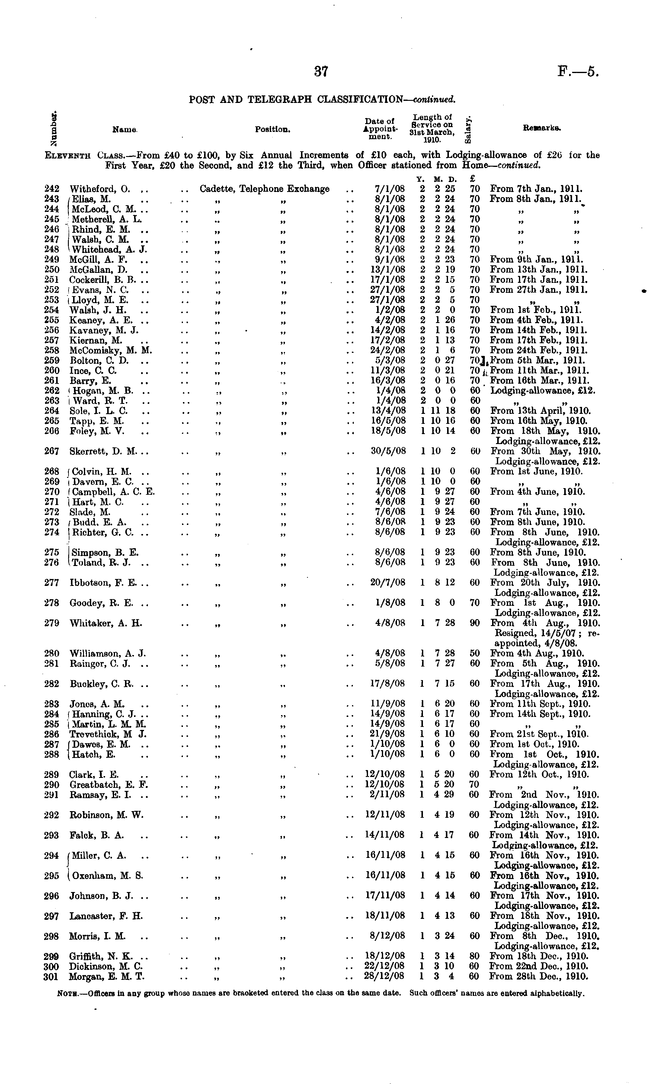 POST AND TELEGRAPH CLASSIFICATION— continued. S Date of Length of £ 1 Name Position. Appoint- % Remarks. c ' meut - 1910. ' & Elbvekth Class.—From £40 to £100, by Six Annual Increments of £10 each, with Lodging-allowance of £20 lor the First Year, £20 the Second, and £12 the Third, when Officer stationed from Home— continued. y. M. d. £ 242 Witheford, 0. ~ .. Cadette, Telephone Exchange .. 7/1/08 2 225 70 From 7th Jan., 1911. 243 /Elias, M. .. .. „ „ .. 8/1/08 2 224 70 From Bth Jan., 1911. 244 McLeod, C. M. .. .. „ .. 8/1/08 2 224 70 245 MethereU, A. L. .... „ .. 8/1/08 2 224 70 24<> Rhind, E. M „ „ .. 8/1/08 2 224 70 247 I Walsh, C. M. .. . „ .. 8/1/08 2 224 70 248 > Whitehead, A. J. .. „ .. 8/1/08 2 224 70 249 McGill, A. F. .. .... „ .. 9/1/08 2 223 70 From 9th Jan., 1911. 250 McGaUan, D. .. .. „ „ .. 13/1/08 2 219 70 From 13th Jan., 1911. 251 Cockerill, B. B. .. .... „ .. 17/1/08 2 215 70 From 17th Jan., 1911. 252 I Evans, N. G .. .. „ „ .. 27/1/08 2 2 5 70 From 27 th Jan., 1911. 253 I Lloyd, M. E. .. .. „ „ .. 27/1/08 2 2 5 70 254 Walsh, J. H. .. .. „ .. 1/2/08 2 2 0 70 From Ist Feb., 1911. 255 Keaney, A. E. .. .. ~ .. 4/2/08 2 126 70 From 4th Feb., 1911. 256 Kavaney, M. J. .. ~ • „ .. 14/2/08 2 116 70 From 14th Feb., 1911. 257 Kiernan, M. .. .... „ .. 17/2/08 2 113 70 From 17th Feb., 1911. 258 McComUky, M. M ~ .. 24/2/08 2 1 6 70 From 24th Feb., 1911. 259 Bolton, C. D. .. .. „ „ .. 5/3/08 2 027 70J,From sth Mar., 1911. 200 lnce, C. C. .. .... „ .. 11/3/08 2 021 70 { . From 11th Mar., 1911. 261 Barry, E. .. . . „ .. 16/3/08 2 016 70 From 16th Mar., 1911. 262 i Hogiin, M. B. .. .. .. .. 1/4/08 2 0 0 60' Lodging-allowance, £12. 263 i Ward, R. T. .. .. ~ „ .. 1/4/08 2 0 0 60 264 Sole, I. L. C. .. .... „ .. 13/4/08 11118 60 From 13th April, 1910. 265 Tupp, E. M. .. .... „ .. 16/5/08 110 16 60 From 16th May, 1910. 266 Foley, M. V. .. .. „ „ .. 18/5/08 110 14 60 From 18th May, 1910. Lodging-allowance, £12. 267 Skerrett, D. M. .. .. „ „ .. 30/5/08 110 2 60 From 30th May, 1910. Lodging-allowance, £12. 268 iColvin, H. M. .. .. „ „ .. 1/6/08 110 0 60 From Ist June, 1910. 269 1 Davern, E. C. .. .. „ „ .. 1/6/08 110 0 60 270 [Campbell, A. C. E „ .. 4/6/08 1 927 60 From 4th June, 1910. 271 "(Hart, M. C. .. .. „ .. 4/6/08 1 927 60 272 Slade, M. .. .. „ ~ .. 7/6/08 1 924 60 From 7th June, 1910. 273 fßudd. E. A. .. .. „ .. 8/6/08 1 923 60 From Bth Juno, 1910. 274 I Richter, G. C. .. .. „ „ .. 8/6/08 1 923 60 From Bth June, 1910. Lodging-allowance, £12. 275 Simpson, B. E. .. „ „ .. 8/6/08 1 923 60 From Bth June, 1910. 276 Toland, R. J. .. .. „ „ .. 8/6/08 1 923 60 From Bth June, 1910. Lodgine-allowance, £12. 277 Ibbotson, F. E. .. .. „ „ .. 20/7/08 1 812 60 From 20th July, 1910. Lodging-allowance, £12. 278 Goodey, R. R. .. .. „ „ .. 1/8/08 1 8 0 70 From Ist Aug., 1910. Lodging-allowanco, £12. 279 Whitaker, A. H. .. „ „ .. 4/8/08 1 728 90 From 4th Aug., 1910. Resigned, 14/5/07 ; reappointed, 4/8/08. 280 Williamson, A. J. .. „ „ .. 4/8/08 1 728 50 From 4th Aug., 1910. 281 Raingor, C. J. .. .. „ „ .. 5/8/08 1 727 60 From sth Aug., 1910. Lodging-allowanco, £12. 282 Buckley, C. R. .. .. „ „ .. 17/8/08 1 715 60 From 17th Aug., 1910. Lodging-allowance, £12. 283 Jones, A. M. .. .. „ „ .. 11/9/08 1 620 60 From 11th Sept., 1910. 284 (Harming, C. J. .. . • „ ~ .. 14/9/08 16 17 60 From 14th Sept., 1910. 285 I Martin, L. M. M. „ „ .. 14/9/08 1 617 60 286 Trovethick, MJ. .. „ .. .. 21/9/08 1 610 60 From 21st Sept., 1010. 287 (Dawes, E. M. .. .... „ .. 1/10/08 1 6 0 60 From Ist Oct., 1910. 288 JHatoh, E. .. .... „ .. 1/10/08 1 6 0 60 From Ist Oct., 1910. Lodging-allowance, £12. 289 Clark, I. E. .. „ „ .. 12/10/08 1 520 60 From 12th Oct., 1910. 290 Greatbatch, E. F. .. „ „ .. 12/10/08 1 520 70 291 Ramsay, E. I. .. .. „ .. 2/11/08 1 429 60 From 2nd Nov., 1910. Lodging-allowance, £12. 292 Robinson, M. W. .. „ .. 12/11/08 1 419 60 From 12th Nov., 1910. Lodging-allowance, £12. 293 Falck, B. A. .. .. „ .. 14/11/08 1 417 60 From 14th Nov., 1910. Lodging-allowance, £12. 294 (Miller, C. A. .. „ „ .. 16/11/08 1 415 60 From 16th Nov., 1910. j Lodging-allowance, £12. 295 ( Oxenham, M. 8. .. „ .. 16/11/08 1 415 60 From 16th Nov., 1910. Lodging-allowance, £12. 296 Johnson, B. J. .. .. „ .. 17/11/08 1 414 60 From 17th Nov., 1910. Lodging-allowance, £12. 297 Lancaster, F. H. „ „ .. 18/11/08 1 413 60 From 18th Nov., 1910. Lodging-allowance, £12. 298 Morris, I. M. .. „ „ .. 8/12/08 1 324 60 From Bth Dec, 1910. Lodging-allowance, £12. 299 Griffith, N. K. .. .. „ „ .. 18/12/08 1 314 80 From 18th Dec, 1910. 300 Dickinson, M. C. .. „ „ .. 22/12/08 1 310 60 From 22nd Dec, 1910. 301 Morgan, E. M. T. .. „ „ .. 28/12/08 1 3 4 60 From 28th Dec, 1910. Note.—Officers in any group whose names are braoketed entered the class on the same date. Such officers' names are entered alphabetically.