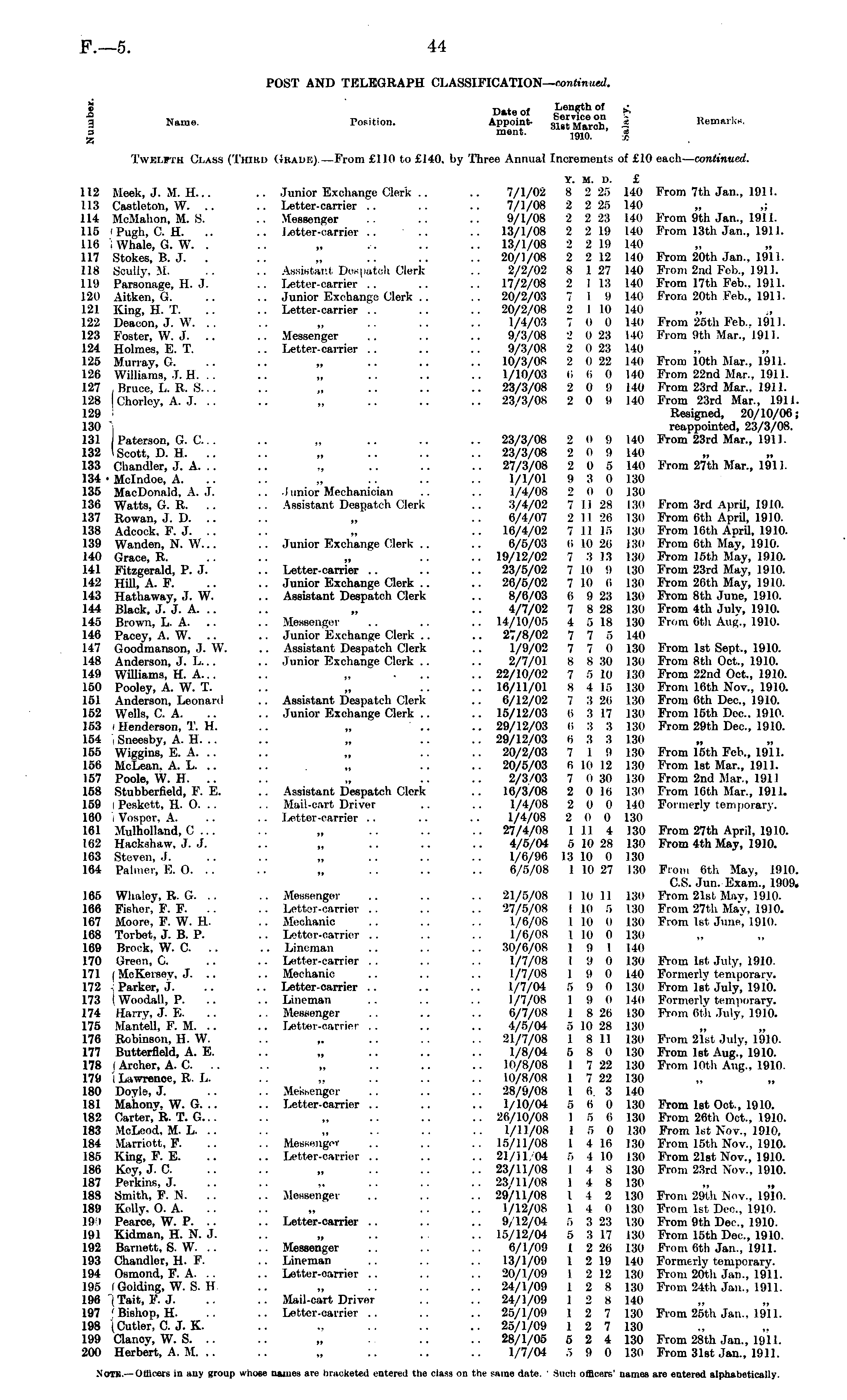 POST AND TELEGRAPH CLASSIFICATION— continued. j> D»teof Length of £ I Nriuh. Position. Appoint- mftMMoh $ Remarks. a ment. ' 1910 ' * I w ki.fi h Class (Third Qradb). —From £110 to £140. by Three Annual Increments of £10 each— continued. Y. M. D. £ 112 Meek, J. M. H... .. Junior Exchange Clerk .. .. 7/1/02 S 2 2fi 140 From 7th Jan., 1911. 113 Castletoh, W. .. .. Letter-carrier .. .. .. 7/1/08 2 225 140 114 McMahon, M. S. .. Messenger .. .. .. 9/1/08 2 223 140 From 9th Jan., 1911. 115 iPugh, C. H. .. .. Letter-oarrier .. .. .. 13/1/08 2 219 140 From 13th Jan., 1911. 116 (Whale, G. W. . .. „ ~ .. .. 13/1/08 2 219 140 117 Stokes, B. J. . .. „ .. .. .. 20/1/08 2 212 140 From 20th Jan., 1911. 118 Scully, M. .. .. Assistant Deepatoh Clerk .. 2/2/02 8 127 140 From 2nd Fob., 1911. 119 Parsonage, H. J. .. Letter-carrier .. .. .. 17/2/08 2 113 140 From 17th Feb.. 1911. 120 Aitken, G. .. .. Junior Exchange Clerk .. .. 20/2/03 7 1 9 140 From 20th Feb., 1911. 121 King, H. T. .. .. Letter-carrier .. .. .. 20/2/08 21 10 140 122 Deacon, J. W. .. .. „ .. .. .. 1/4/03 7 II 0 140 From 25th Feb.. 1911. 123 Foster, W. J. .. .. Messenger .. .. .. 9/3/08 2 023 140 From 9th Mar., J 9ll. 124 Holmes, E. T. .. Letter-carrier .. .. .. 9/3/08 2 023 140 „ „ 125 Murray, G. .. .. „ .. .. .. 10/3/0R 2 022 140 From 10th Mar., 1911. 126 Williams, J. H. .. .. „ .. .. .. 1/10/03 6 6 0 140 From 22nd Mar., 1911. 127 Bruce. L. R. 5... .. „ .. .. .. 23/3/08 2 0 i) 140 From 23rd Mar.. 1911. 128 I Chorlcy, A. J. .. .. „ .. .. .. 23/3/08 2 0 H 140 From 23rd Mar., 1911. 129 i Resigned, 20/10/06; 130 reappointed, 23/3/08. 131 Paterson, G. C... .. „ .. .. .. 23/3/08 2 0 9 140 From 23rd M»r., 1911. 132 Scott, D. H. .. .. „ .. .. .. 23/3/08 2 0 9 140 133 Chandler, J. A. .. .. ~ .. .. .. 27/3/08 2 0 5 140 From 27th Mar., 1911. 134 • Mclndoe, A. .. „ .. .. .. 1/1/01 9 3 0 130 135 Mac Donald, A. .1. .. 1 unior Mechanician .. .. 1/4/08 2 0 0 130 136 Watts, G. R. .. .. Assistant Despatch Clerk .. 3/4/02 7 1128 130 From 3rd April, 1910. 137 Rowan, J. D. .... „ .. 6/4/07 211 26 130 From 6th April, 1910. 138 Adcock, F. J. .... „ .. 16/4/02 711 16 130 From 16th April, 1910. 139 Wanden, N. Vi... .. Junior Exchange Clerk .. .. 6/5/03 II 10 20 130 From 6th May, 1910. 140 Grace, R. .. .. „ .. .. 19/12/02 7 :? 13 130 From 15th May, 1910. 141 Fitzgerald, P. J. .. Letter-carrier .. .. .. 23/5/02 710 •> 130 From 23rd May, 1910. 142 Hill, A. F. .. .. Junior Exchange Clerk .. .. 26/5/02 710 6 130 From 26th May, 1910. 143 Hathaway, J. W. .. Assistant Despatch Clerk .. 8/6/03 (i !) 23 130 From Bth June, 1910. 144 Black, J. J. A. .. .. „ .. 4/7/02 7 828 130 From 4th July, 1910. 145 Brown, L. A. .. .. Messenger .. .. .. 14/10/05 4 ."> is 130 From Oth Aug., 1910. 146 Pacey, A. W. .. .. Junior Exchange Clerk .. .. 27/8/02 7 7 f> 140 147 Goodmanson, J. W. .. Assistant Despatch Clerk .. 1/9/02 7 7 0 130 From Ist Sept., 1910. 148 Anderson, J. L... .. Junior Exchange Clerk .. .. 2/7/01 8 830 130 From Bth Oct., 1910. 149 Williams, H. A... .. „ ... .. 22/10/02 7 510 L3O From 22nd Oct., 1910. 150 Pooley, A. W. T. .. „ .. .. 16/11/01 8 415 130 From 16th Nov., 1910. 151 Anderson, Leonon I .. Assistant Despatch Clerk .. 6/12/02 7 320 130 From Oth Dec, 1910. 152 Wells, C. A. .. .. Junior Exchange Clerk .. .. 15/12/03 (> 317 130 From 15th Dec. 1910. 153 i Henderson, T. H. .. „ .. .. 29/12/03 (i :! 3 130 From 29th Dec, 1910. 154 , Sneesby, A. H. .. .. „ .. .. 29/12/03 t> :! :\ 130 155 Wiggins, E. A. .. .. „ .. .. 20/2/03 7 1 9 130 From 15th Feb., 1911. 156 McLean. A. L. .. .. . „ .. .. 20/5/03 RlO 12 130 From Ist Mar., 1911. 157 Poole, W. H. .. .. „ .. .. 2/3/03 7 030 180 From 2nd Mar., 1911 158 Stubberfield, F. E. .. Assistant Despatch Clerk .. 16/3/08 2 0 ll> 130 From 16th Mar., 1911. 159 i Peskett, H. O. .. .. Mail-cart Driver .. .. 1/4/08 2 0 0 140 Formerly temporary. 160 i Vospcr. A. .. .. Letter-oarrier .. .. .. 1/4/08 2 0 0 130 161 }[ u lholland, C ... .. „ .. .. .. 27/4/08 111 4 130 From 27th April, 1910. 162 Hackshaw, J. J. .. „ .. .. .. 4/5/04 510 28 130 From 4th May, 1910. 163 Steven. .I. .. .. „ .. .. .. 1/6/96 13 10 0 130 164 Palmer, K. O. .. .. „ .. .. .. 6/5/08 110 27 130 From 6th May, 1910. C.S. Jun. Exam., 1909. 165 Whaloy, R. G. .. .. Messenger .. .. .. 21/5/08 110 11 130 From 21st May. 1910. 166 Fieher, P. P. .. .. Letter-carrier .. .. .. 27/5/08 110 5 130 From 27th May, 1910. 167 Moore. F. W. H. .. Mechanic .. .. .. 1/6/08 I )0 o 130 From let June, 1910. 168 Torbot. J. B. P. .. Letter-oarrier .. .. .. 1/6/08 110 0 130 169 Brook. W. C. .. .. Lineman .. .. .. 30/6/08 1 9 1 140 170 Green, C. .. .. Letter-carrier .. .. .. 1/7/08 1 9 0 130 From Ist July, 1910. 171 ( McKersey, J. .. .. Mechanic .. .. .. 1/7/08 1 9 0 140 Formerly temporary. 172 i Parker, j. .. .. Letter-carrier .. .. .. 1/7/04 59 0 130 From Ist July, 1910. 173 I Woodall, P. .. .. Lineman .. .. .. 1/7/08 1 <l 0 140 Formerly temporary. 174 Harry, J. E. .. .. Messenger .. .. .. 6/7/08 1 826 130 From 6th July, 1910. 175 Mantell, F. M. .. .. Utter-carrier .. .. .. 4/5/04 510 28 130 „ „ 176 Robinson, H. W. .. ~ .. .. .. 21/7/08 1 811 130 From 21st July, 1910. 177 Butterfield, A. E. .. „ .. .. .. 1/8/04 5 8 0 130 From Ist Aug., 1910. 178 (Archer, A. C. .. .. „ .. .. .. 10/8/08 I 722 130 From 10th Aug., 1910. 179 I Lawrence, R. L. .. „ .. .. .. 10/8/08 1 722 130 180 Doyte, J. .. .. Mei*enger .. .. .. 28/9/08 1 6. 3 140 181 Mahony. W. G. .. .. Letter-carrier .. .. .. 1/10/04 5 6 0 130 From Ist Oct., 1910. 182 Carter,"R. T. G... .. „ .. .. .. 26/10/08 1 r> 6 130 From 26th Oct., 1910. 183 VlcLeod, M. L. .. .. „ .. .. .. 1/11/08 I r> 0 130 From let Nov., 1910, 184 Marriott, P. .. .. Messenger .. .. .. 15/11/08 I 4Hi 130 From 15th Nov., 1910. 185 King, F. E. .. .. Letter-carrier .. .. .. 21/11/04 5 410 130 From 21st Nov., 1910. 186 Key, J. C. .. .. „ .. .. .. 23/11/08 I 4 8 130 From 23rd Nov., 1910. 187 Perkins, J. .. ..