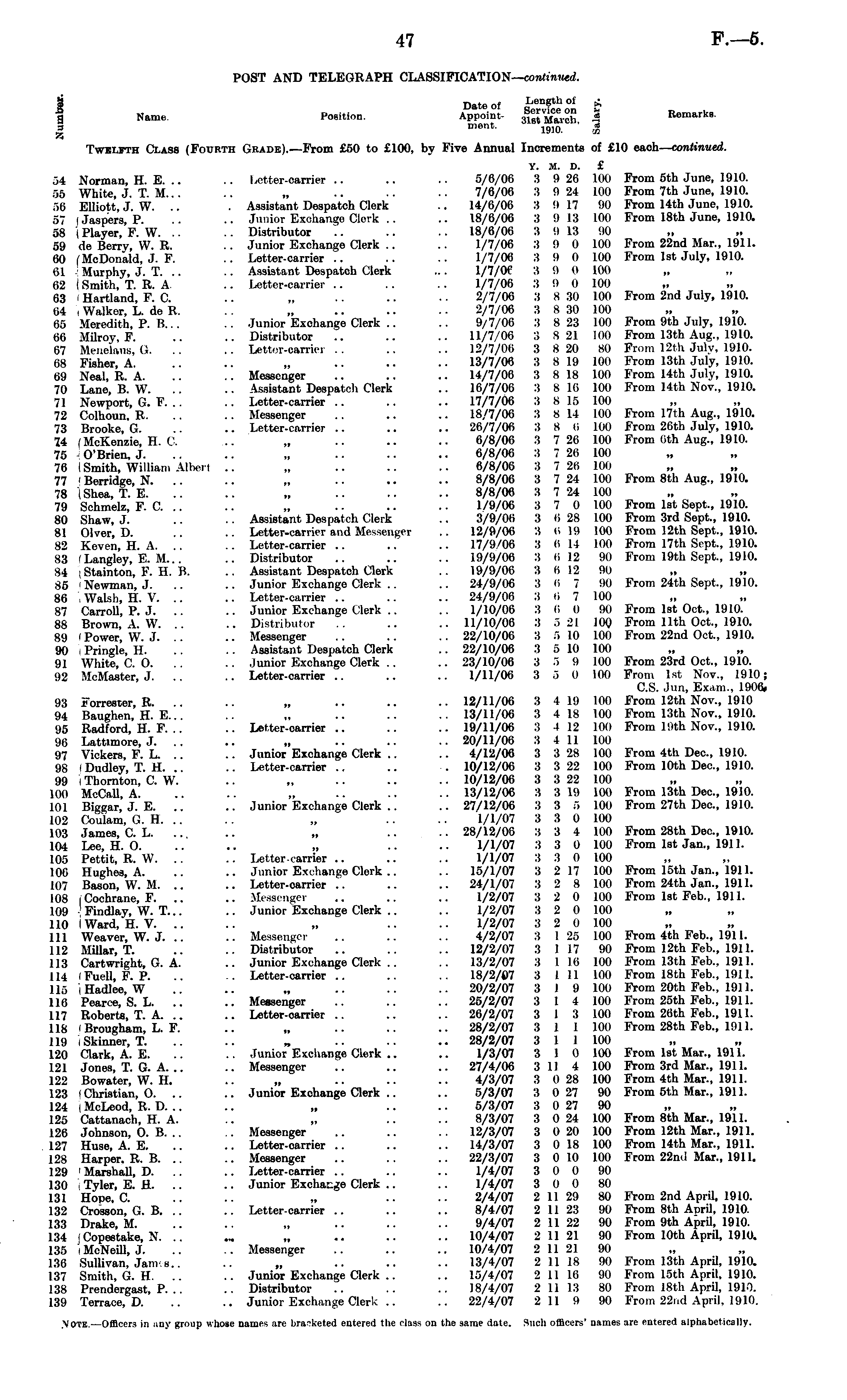 POST AND TELEGRAPH CLASSIFICATION— continued. jj Date of Length of £ g Name. Poeition. Appoint- J5 Remarks. a ment. lg]o ' s Twelfth Class (Fourth Gkadb).—From £60 to £100, by Five Annual Increments of £10 eaoh— continued. y. M. D. £ 54 Norman, H. E. .. .. Letter-carrier .. .. .. 5/6/06 3 926 100 From sth June, 1910. 55 White, J. T. M... .. „ .. .. .. 7/6/06 3 024 100 From 7th June, 1910. 56 Elliott, J. W. .. . Assistant Despatch Clerk .. 14/6/06 3 !> 17 90 From 14th June, 1910. 57 l Jaspers, P. .. .. Junior Exohango Clerk .. .. 18/6/06 3 i) 13 100 From 18th June, 1910. 58 I Player, F. W. .. .. Distributor ".. .. .. 18/6/06 3 () 13 90 59 de Berry, W. R. .. Junior Exchange Clerk .. .. 1/7/06 3 9 0 100 From 22nd Mar., 1911. 60 (McDonald, J. F. .. Letter-carrier .. .. .. 1/7/06 3 it 0 100 From Ist July, 1910. 61 'Murphy, J. T. .. .. Assistant Despatch Clerk ... 1/7/0 C 3 9 0 100 62 I Smith, T. R. A. .. Letter-carrier .. .. .. 1/7/06 :) !) 0 100 63 I Hartland, F. C. .. „ .. .. • • 2/7/06 3 830 100 From 2nd July, 1910. 64 i Walker, L. de R. .. „ .. .. .. 2/7/06 3 830 100 65 Meredith, P. 8... .. Junior Exchange Clerk .. .. 9/7/06 3 823 100 From 9th July, 1910. 66 Milroy, F. .. .. Distributor .. .. .. 11/7/06 3 821 100 From 13th Aug., 1910. 67 Menelane,G. .. .. Lettor-carrier .. .. .. 12/7/00 3 820 80 From 12th July, 1910. 68 Fisher, A. .. .. „ .. .. .. 13/7/06 3 819 100 From 13th July, 1910. 69 Neal, R. A. .. .. Messenger .. .. .. 14/7/06 3 818 100 From 14th July, 1910. 70 Lane, B. W. .. .. Assistant Despatch Clerk .. 16/7/06 3 816 100 From 14th Nov., 1910. 71 Newport, G. F. .. .. Letter-carrier .. .. .. 17/7/06 :S Sl6 100 72 Colhoun. R. .. .. Messenger .. .. .. 18/7/06 3 814 100 From 17th Aug., 1910. 73 Brooke, G. .. .. Letter-carrier .. .. .. 26/7/06 3 8 8 100 From 26th July, 1910. 74 (McKenzie, H. f. .. „ .. .. .. 6/8/06 3 726 100 From (ith Aug., 1910. 75 - O'Brien, J. .. „ .. .. .. 6/8/06 :i 726 100 76 I Smith, William Albert .. „ .. .. .. 6/8/06 3 726 100 77 'Berridge, N. .. .. „ .. .. .. 8/8/06 3 724 100 From Bth Aug., 1910. 78 (Shea, T. E 8/8/06 3 724 100 79 Schmelz, F. C. .. .. „ .. .. .. 1/9/06 3 7 0 100 From Ist Sept., 1910. 80 Shaw, J. .. .. Assistant Despatch Clerk .. 3/9/06 3 628 100 From 3rd Sept., 1910. 81 Olver, D. .. .. Letter-carrier and Messenger .. 12/9/06 3 H 1!» 100 From 12th Sept., 1910. 82 Keven, H. A. .. .. Letter-carrier .. .. .. 17/9/06 3 814 100 From 17th Sept., 1910. 83 (Langley, E. M... .. Distributor .. .. .. 19/9/06 :S ti 12 90 From 19th Sept., 1910. 84 (Stainton, F. H. B. .. Assistant Despatch Clerk .. 19/9/06 3 612 90 „ „ 85 i Newman, J. .. .. Junior Exchange Clerk .. .. 24/9/06 3 8 7 90 From 24th Sept., 1910. 86 I Walsh, H. V. .. .. Letter-carrier .. .. .. 24/9/06 :( 8 7 100 87 Carroll, P. J. .. .. Junior Exchange Clerk .. .. 1/10/06 :i ti 0 90 From Ist Oct., 1910. 88 Brown, A. W. .. .. Distributor .. .. .. 11/10/06 :t 521 100 From 11th Oct., 1910. 89 i Power, W. J. .. .. Messenger .. .. .. 22/10/06 3 510 100 From 22nd Oct., 1910. 90 I Pringle, H. .. .. Assistant Despatch Clerk .. 22/10/06 :t 510 100 „ „ 91 White, CO. .. .. Junior Exchange Clerk .. .. 23/10/06 3 5 9 100 From 23rd Oct., 1910. 92 McMaster, J. .. .. Letter-carrier .. .. .. 1/11/06 3 5 0 100 From Ist Nov., 1910; C.S. .lun, Exam., 1906. 93 Forrester, R. .. .. „ .. .. .. 12/11/06 3 419 100 From 12th Nov., 1910 94 Baughen, H. E... .. „ .. .. .. 13/11/06 3 418 100 From 13th Nov., 1910. 95 Radford, H. F. .. .. Letter-carrier .. .. .. 19/11/06 3 412 100 From llrth Nov., 1910. 96 Lattimore, J „ 20/11/06 3 411 100 97 Vickers, F. L. .. .. Junior Exchange Clerk .. .. 4/12/06 3 328 100 From 4th Dec, 1910. 98 I Dudley, T. H. .. .. Letter-carrier .. .. •. 10/12/06 3 322 100 From 10th Dec, 1910. 99 I Thornton, C. W. .. „ 10/12/06 3 322 100 100 McCall, A. .. .. „ .. .. .. 13/12/06 3 319 100 From 13th Dec, 1910. 101 Biggar, J. E. .. .. Junior Exchange Clerk .. .. 27/12/06 :i 3 6 100 From 27th Dec, 1910. 102 Coulam, G. H „ .. .. 1/1/07 3 3 0 100 103 James, C. L. .. „ .. .. 28/12/06 I) 3 4 100 From 28th Dec, 1910. 104 Lee, H. O. .. .. „ .. .. 1/1/07 3 3 0 100 From Ist Jan., 1911. 105 Pettit, R. W. .. .. Letter-carrier.. .. .. 1/1/07 3 3 0 100 106 Hughes, A. .. .. Junior Exchange Clerk .. .. 15/1/07 3 217 100 From 15th Jan., 1911. 107 Bason, W. M. .. .. Letter-carrier .. .. .. 24/1/07 3 2 8 100 From 24th Jan., 1911. 108 (Cochrane, F. .. .. Messenger .. .. .. 1/2/07 32 0 100 From Ist Feb., 1911. 109 ■ Findlay, W. T... .. Junior Exchange Clerk .. .. 1/2/07 3 2 0 100 „ 110 iWard, H. V. .. .. „ .. .. 1/2/07 3 2 0 100 111 Weaver, W. J. .. .. Messenger .. .. .. 4/2/07 3 125 100 From 4th Feb., 1911. 112 Millar, T. .. .. Distributor .. .. .. 12/2/07 3 117 90 From 12th Feb., 1911. 113 Cartwright, G. A. .. Junior Exchange Clerk .. .. 13/2/07 3 116 100 From 13th Feb., 1911. 114 iFuell, F. P. .. .. Letter-carrier .. .. .. 18/2/07 3 111 100 From 18th Feb., 1911. 115 iHadlee, W .. .. „ .. .. .. 20/2/07 3 1 9 100 From 20th Feb., 1911. 116 Pearce, S. L. .. .. Messenger .. .. .. 25/2/07 3 1 4 100 From 25th Feb., 1911. 117 Roberts, T. A. .. .. Letter-carrier .. .. .. 26/2/07 3 1 3 100 From 26th Feb., 1911. 118 I Brougham, L. F. .. „ .. .. .. 28/2/07 3 I 1 100 From 28th Feb., 1911. 119 i Skinner, T. .. .. „ .. .. .. 28/2/07 3 I 1 100 120 Clark, A. E. .. .. Junior Exchange Clerk .. .. 1/3/07 3 1 0 100 From Ist Mar., 1911. 121 Jones, T. G. A. .. .. Messenger .. .. .. 27/4/06 311 4 100 From 3rd Mar., 1911. 122 Bowater, W. H. .. „ .. .. .. 4/3/07 3 028 100 From 4th Mar., 1911. 123 (Christian, O. .. .. Junior Exchange Clerk .. .. 5/3/07 3 027 90 From sth Mar., 1911. 124 I McLeod, R. D. .. .. „ .. .. 5/3/07 3 027 90 125 Cattanach, H. A. .. „ .. .. 8/3/07 3 024 100 From Bth Mar., 1911. 126 Johnson, O. B. .. .. Messenger .. .. .. 12/3/07 3 020 100 From 12th Mar., 1911. 127 Huse, A. E. .. .. Letter-carrier .. .. .. 14/3/07 3 018 100 From 14th Mar., 1911. 128 Harper.
