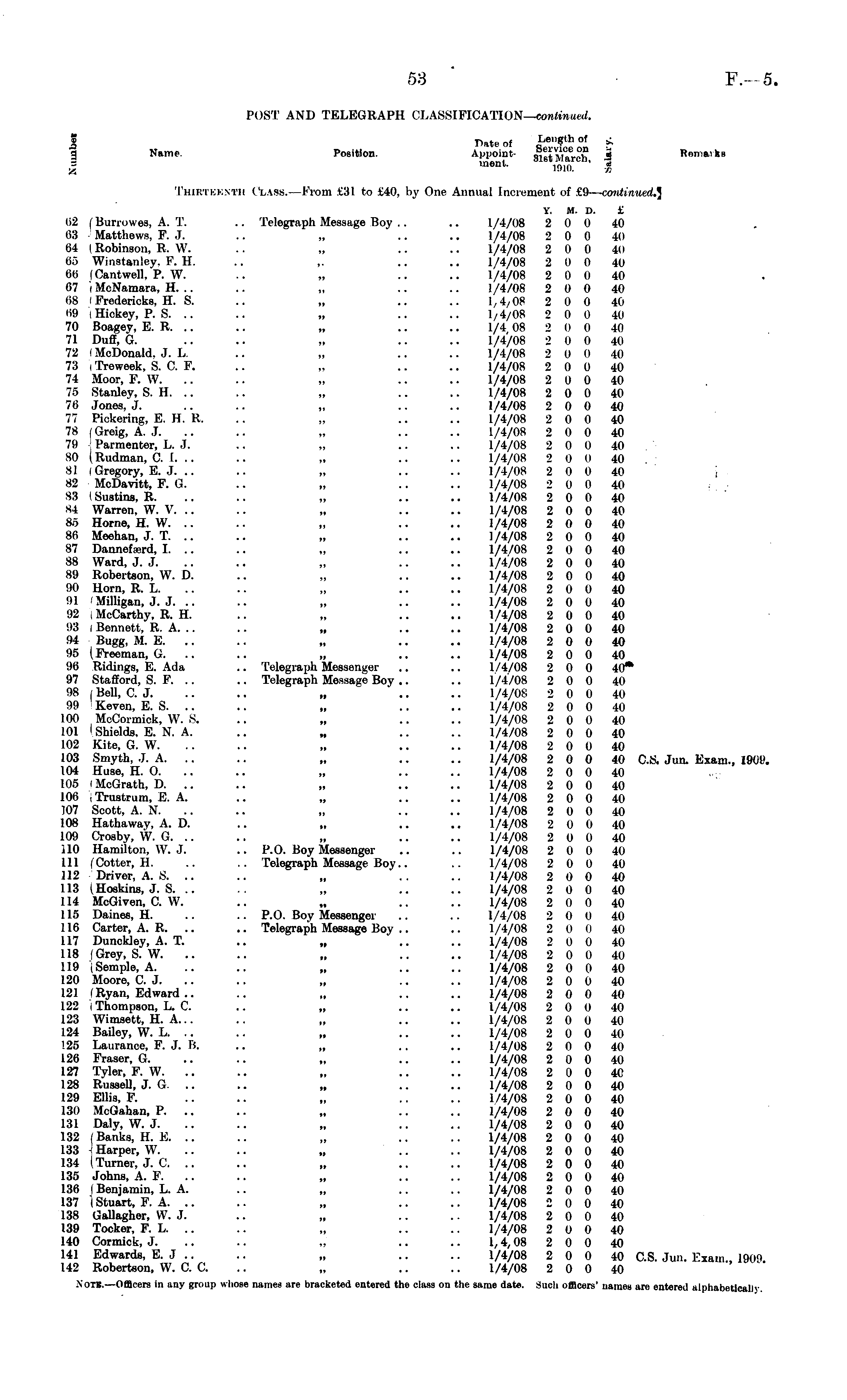 POST AND TELEGRAPH CLASSIFICATION— continued. v Pate of Length of £ I Name. Position. Appoint- s^ v ,J c a e r °£ jj Remarks I ment - 10L0. ' -i. Thirtkbntb Class.- From tir-Sl to £40, by One Annual Increment of £9— coiditmed.] y. M. D. £ t>2 i Bun-owes, A. T. .. Telegraph Message Boy .. .. 1/4/08 2 0 0 40 63 Matthews, F. J. .. „ .. .. 1/4/08 2 0 0 40 64 I Robinson, R. W. .. „ .. .. 1/4/08 2 0 0 40 65 Winstanley. F. H. .. ~ .. .. 1/4/08 2 0 0 40 66 (Cantwell, P. W. .. „ .. .. 1/4/08 2 0 0 40 67 1 McNamara, H. .. .. „ .. .. 1/4/08 2 0 0 40 68 I Fredericks, H. S. .. „ .. .. 1,4/08 2 0 0 40 69 iHickey, P. S. .. .. „ .. .. 1/4/08 2 0 0 40 70 Boagey, E. R. .. .. „ .. .. 1/4 08 2 0 0 40 71 Duff, G. .. .. „ .. .. 1/4/08 2 0 0 40 72 I McDonald, J. L. .. „ .. .. 1/4/08 2 0 0 40 73 I Treweek, S. C. F. .. „ .. .. 1/4/08 2 0 0 40 74 Moor, P. W. .. .. „ .. .. 1/4/08 2 0 0 40 75 Stanley, S. H. .. .. „ .. .. 1/4/08 2 0 0 40 76 Jones, J. .. .. „ .. .. 1/4/08 2 0 0 40 77 Pickering, E. H. R. .. „ .. .. 1/4/08 2 0 0 40 78 ( Greig, A. J. .. „ .. .. 1/4/08 2 0 0 40 79 - Parmenter, L. J. .. „ .. .. 1/4/08 2 0 0 40 80 I Rudman, C. 1. .. .. „ .. .. 1/4/08 20 0 40 SI I Gregory, E. J. .. .. „ .. .. 1/4/08 2 0 0 40 , 82 McDavitt, F. G. .. „ .. .. 1/4/08 2 0 0 40 83 I Sustins, R. .. „ .. .. 1/4/08 2 0 0 40 84 Warren, W. V. .. .. „ .. .. 1/4/08 2 0 0 40 85 Home, H. W. .. .. „ .. .. 1/4/08 2 0 0 40 86 Meehan, J. T. .. .. „ .. .. 1/4/08 2 0 0 40 87 Dannefferd, I. .. .. „ .. .. 1/4/08 2 0 0 40 88 Ward, J. J. .. „ .. .. 1/4/08 2 0 0 40 89 Robertson, W. D. .. „ .. .. 1/4/08 2 0 0 40 90 Horn, R. L. .. „ .. .. 1/4/08 2 0 0 40 91 (Milligan, J. J. .. .. „ .. .. 1/4/08 2 0 0 40 92 i McCarthy, R. H. .. „ .. .. 1/4/08 2 0 0 40 93 i Bennett, R. A. .. .. „ .. .. 1/4/08 2 0 0 40 94 Bugg, M. E. .. .. „ .. .. 1/4/08 2 0 0 40 95 (Freeman, G. .. .. „ .. .. 1/4/08 2 0 0 40 96 Ridings, E. Ada .. Telegraph Messenger .. .. 1/4/08 2 0 0 40* 97 Stafford, S. P. .. .. Telegraph Message Boy .. .. 1/4/08 2 0 0 40 98 I Bell, C. J. .. .. „ .. .. 1/4/08 2 0 0 40 99 Keven, E. S. .. .. „ .. .. 1/4/08 2 0 0 40 100 McCormick, W. S. .. „ .. .. 1/4/08 2 0 0 40 101 I Shields, E. N. A. .. „ .. .. 1/4/08 2 0 0 40 102 Kite, G. W. .. .. „ .. .. 1/4/08 2 0 0 40 103 Smyth, J. A „ .. .. 1/4/08 2 0 0 40 C.S. Jun. Exam., 1909. 104 Huse, H. O. .. .. „ .. .. 1/4/08 2 0 0 40 I 1 IB McGrath, D. .. .. „ .. .. 1/4/08 2 0 0 40 106 , Trustriim, E. A. .. „ .. .. 1/4/08 2 0 0 40 107 Scott, A. N. .. .. „ .. .. 1/4/08 2 0 0 40 108 Hathaway, A. D. .. „ .. .. 1/4/08 2 0 0 40 109 Crosby, W. G. .. .. „ .. .. 1/4/08 2 0 0 40 110 Hamilton, W. J. .. P.O. Boy Messenger .. .. 1/4/08 2 0 0 40 111 (Cotter, H. .. .. Telegraph Message Boy.. .. 1/4/08 2 0 0 40 112 Driver, A. S. .. .. „ .. .. 1/4/08 2 0 0 40 113 (Hoskins, J. S. .. .. „ .. .. 1/4/08 2 0 0 40 114 McGiven, C. W. .. „ .. .. 1/4/08 2 0 0 40 115 Dames, H. .. .. P.O. Boy Messenger .. .. 1/4/08 2 0 0 40 116 Carter, A. R. .. .. Telegraph Message Boy .. .. 1/4/08 2 0 0 40 117 Dunckley, A. T. .. „ .. .. 1/4/08 2 0 0 40 118 i Grey, S. W. .. .. „ .. .. 1/4/08 2 0 0 40 119 iSeraple, A. .. .. „ .. .. 1/4/08 2 0 0 40 120 Moore, C. J. .. .. „ .. .. 1/4/08 2 0 0 40 121 (Ryan, Edward .. .. „ .. .. 1/4/08 2 0 0 40 122 i Thompson, L. C. .. „ .. .. 1/4/08 2 0 0 40 123 Wimaett, H. A... .. „ .. .. 1/4/08 2 0 0 40 124 Bailey, W. L. .. .. „ .. .. 1/4/08 2 0 0 40 125 Laurance, F. J. B. „ .. .. 1/4/08 2 0 0 40 126 Fraser, G. .. .. „ .. .. 1/4/08 2 0 0 40 127 Tyler, F. W. .. .. „ .. .. 1/4/08 2 0 0 40 128 Russell, J. G. .. .. „ .. .. 1/4/08 2 0 0 40 129 Ellis, F. .. .. „ .. .. 1/4/08 2 0 0 40 130 McGahan, P. .. .. „ .. .. 1/4/08 2 0 0 40 131 Daly, W. J. .. .. „ .. .. 1/4/08 2 0 0 40 132 (Banks, H. E. .. .. „ .. .. 1/4/08 2 0 0 40 133 \ Harper, W. .. .. „ .. .. 1/4/08 20 0 40 134 (Turner, J. C. .. .. „ .. .. 1/4/08 2 0 0 40 135 Johns, A. P. .. „ .. .. 1/4/08 2 0 0 40 136 I Benjamin, L. A. .. „ .. .. 1/4/08 2 0 0 40 137 I Stuart, F. A. .. .. „ .. .. 1/4/08 2 0 0 40 138 Gallagher, W. J. .. „ .. .. 1/4/08 2 0 0 40 139 Tocker, F. L. .. .. „ .. .. 1/4/08 2 0 0 40 140 Cormick, J. .. .. .. .. .. 1,4,08 2 0 0 40 141 Edwards, E. J .. .. „ .. .. 1/4/08 2 0 0 40 C.S. Jun. Exam., 1909. 142 Robertson, W. C. C. .. „ .. .. 1/4/08 2 0 0 40 Xotb.—Officers in any group whose names are bracketed entered the class on the same date. Such officers' uames are entered alphabetically