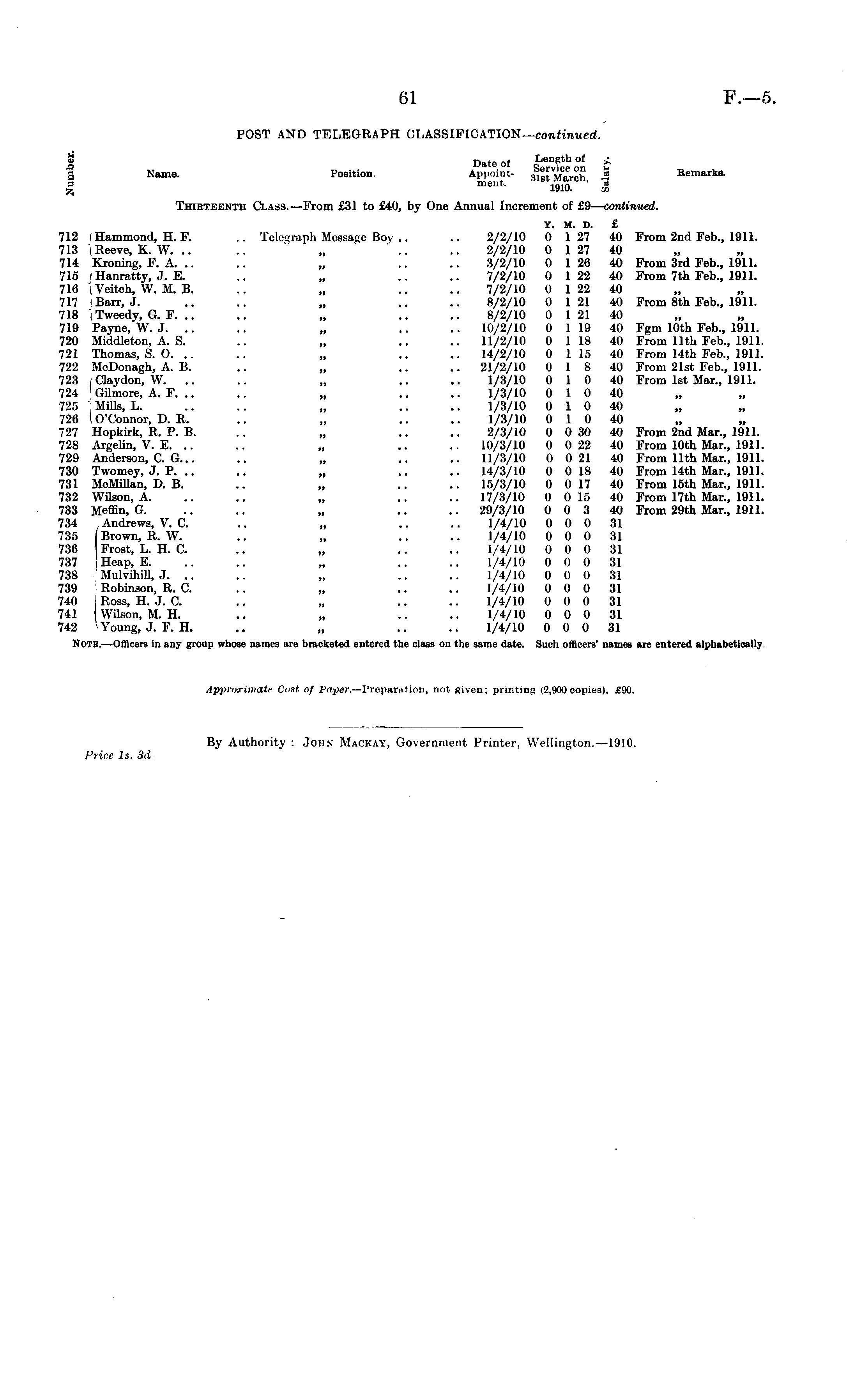 POST AND TELEGRAPH OLASSIFICATION—contmued. * Date of Length of £ Name. Position Appoint- * Remarks. 3 me.it. ' 191Q • d Thirteenth Class.—From £31 to £40, by One Annual Increment of £9— continued. Y. M. D. £ 712 i Hammond, H. F. .. Telegraph Message Boy .. .. 2/2/10 0 127 40 From 2nd Feb., 1911. 713 (Reeve, K. W. .. .. „ .. .. 2/2/10 0 127 40 714 Kroning, F. A. .. .. „ .. .. 3/2/10 0 126 40 From 3rd Feb., 1911. 715 i Hanratty, J. E. .. „ .. .. 7/2/10 0 122 40 From 7th Feb., 1911. 716 i Veitch, W. M. B. .. „ .. .. 7/2/10 0 122 40 717 ' Barr, J. .. .. „ .. .. 8/2/10 0 121 40 From Bth Feb., 1911. 718 i Tweedy, G. F. .. .. „ .. .. 8/2/10 0 121 40 719 Payne, W. J. .. .. „ .. .. 10/2/10 0 119 40 Fgm 10th Feb., 1911. 720 Middleton, A. S. .. „ .. .. 11/2/10 0 118 40 From 11th Feb., 1911. 721 Thomas, S. O. .. .. „ .. .. 14/2/10 0 115 40 From 14th Feb., 1911. 722 McDonagh, A. B. .. „ .. .. 21/2/10 0 1 8 40 From 21st Feb., 1911. 723 /Claydon, W. .. .. „ .. .. 1/3/10 0 1 0 40 From Ist Mar., 1911. 724 ' Gilmore, A. F. .. .. „ .. .. 1/3/10 0 1 0 40 725 I Mills, L. .. .. „ .. .. 1/3/10 0 1 0 40 726 I O'Connor, D. R. .. „ .. .. 1/3/10 0 1 0 40 „ „ 727 Hopkirk, R. P. B. .. „ .. .. 2/3/10 0 030 40 From 2nd Mar., 1911. 728 Argelin, V. E. .. .. „ .. .. 10/3/10 0 022 40 From 10th Mar., 1911. 729 Anderson, C. G... .. „ .. .. 11/3/10 0 021 40 From 11th Mar., 1911. 730 Twomey, J. P. .. .. „ .. .. 14/3/10 0 018 40 From 14th Mar., 1911. 731 McMillan, D. B. .. „ .. .. 15/3/10 0 017 40 From 15th Mar., 1911. 732 Wilson, A. .. .. „ .. .. 17/3/10 0 015 40 From 17th Mar., 1911. 733 Meffin, G. .. .. „ .. .. 29/3/10 0 0 3 40 From 29th Mar., 1911. 734 Andrews, V. C. .. „ .. .. 1/4/10 0 0 0 31 735 Brown, R. W. .. „ .. .. 1/4/10 0 0 0 31 736 Frost, L. H. C. .. „ .. .. 1/4/10 0 0 0 31 737 ! Heap, E. .. .. „ .. .. 1/4/10 0 0 0 31 738 Mulvihill, J. .. .. „ .. .. 1/4/10 0 0 0 31 739 i Robinson, R, C. .. „ .. .. 1/4/10 0 0 0 31 740 Ross, H. J. C. .. „ .. .. 1/4/10 0 0 0 31 741 Wilson, M. H. .. „ .. .. 1/4/10 0 0 0 31 742 Young, J. F. H. .. „ .. .. 1/4/10 0 0 0 31 Note. —Officers in any group whose names are bracketed entered the class on the same date. Such officers' names are entered alphabetically
