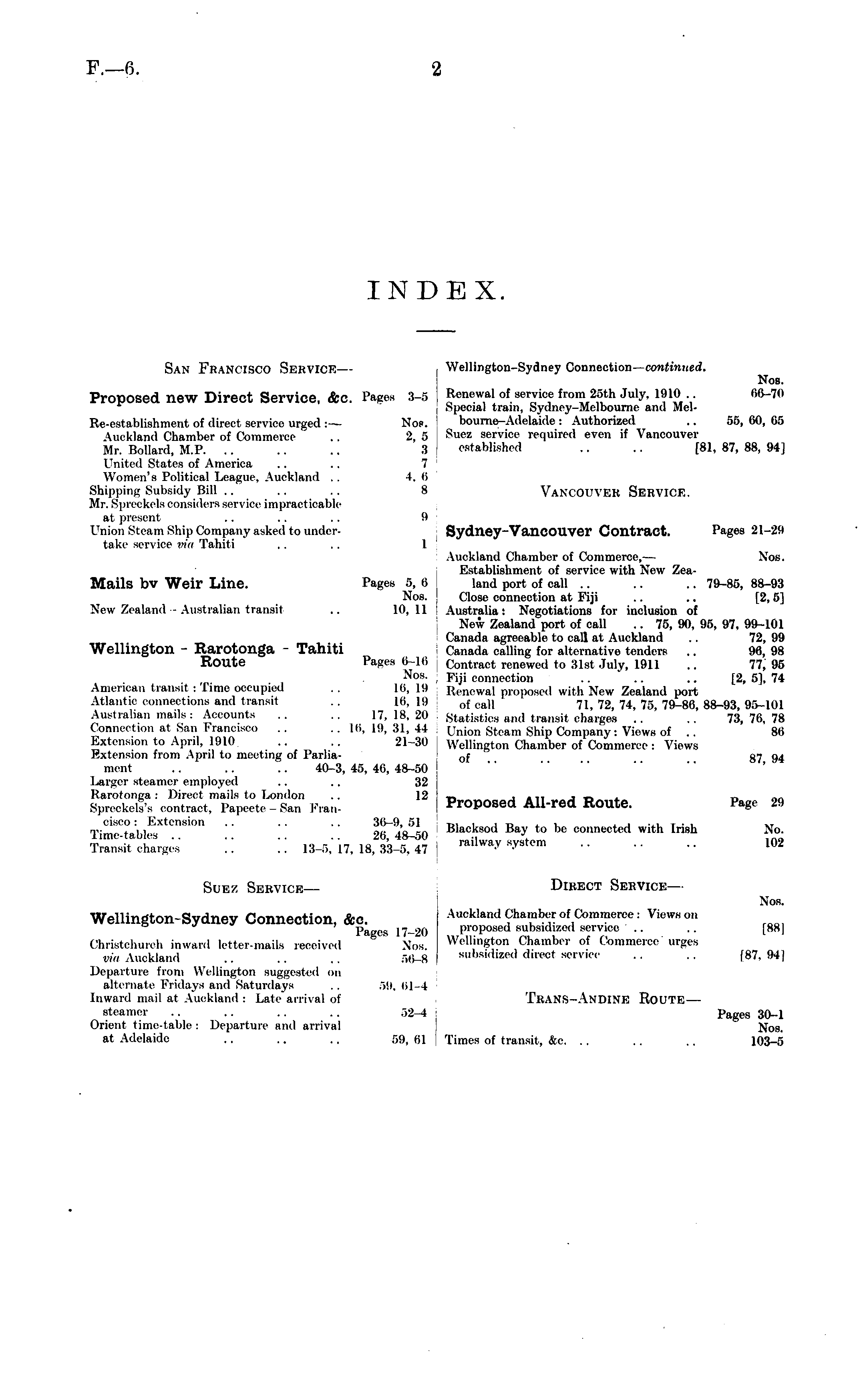 Wellington-Sydney Connection— continued. Nos. Renewal of .service from 26th July. 1910 . . 66-70 Special train, Sydney-Melbourne ami Melbourne—Adelaide : Authorized .. 55, 60, 65 Suez service required even if Vancouver established .. .. [81, 87, 88, 94] Vancouver Service. Sydney-Vancouver Contract. Pages 21-29 Auckland Chamber of Commerce, — Nos. Establishment of service with New Zealand port of call . . .. .. 79-85, 88-93 Close connection at Fiji .. .. [2,5] Australia: Negotiations for inclusion of New Zealand port of call .. 75, 90. 95, 97. 99-101 Canada agreeable to call at Auckland .. 72, 99 Canada calling for alternative tenders .. 96, 98 Contract renewed to 31st July, 1911 .. 77, 95 Fiji connection .. .. .. [2, s], 74 Renewal proposed with New Zealand port of call 71, 72, 74, 75, 79-86, 88-93, 95-101 Statistie.s and transit ohargee .. .. 73, 76, 78 Union Steam Ship Company: Views of 86 Wellington Chamber of Commerce : Views of .. .. .. .. .. 87, 94 Proposed All-red Route. Page 29 Blaoksod Bay to be connected with Irish No. railway system .. .. .. 102 Direct Service— Nos. Auckland Chamber of Commerce: Views on proposed subsidized service • .. .. [88] Wellington Chamber of Commerce urges subsidized direct service .. .. |87. 94| Trans-Andine Route— Pages 30-1 Nos. Times of transit, &c. .. .. .. 103-5