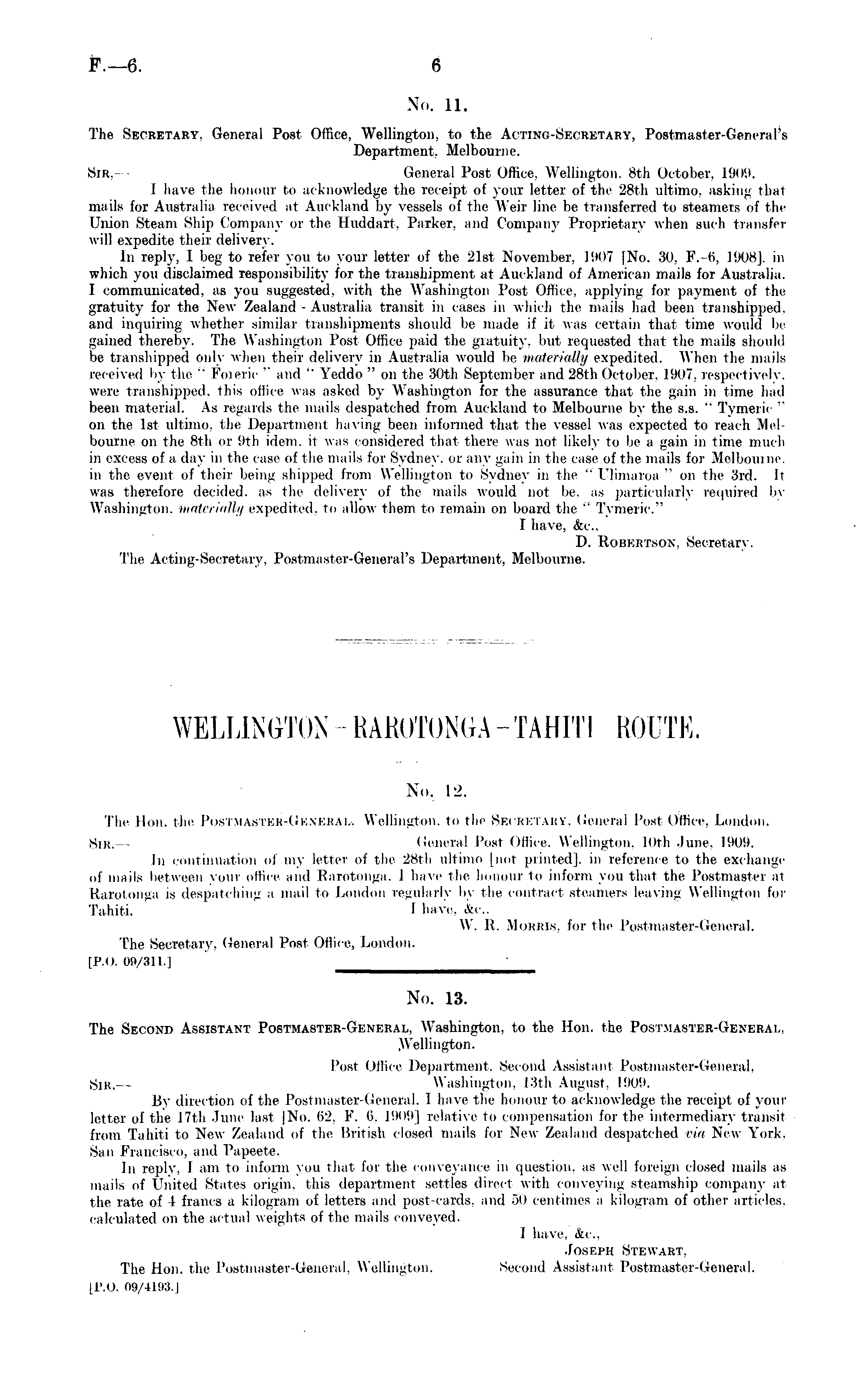WELLINGTON RAROTONGA - TAHITI ROUTE. No, 12. The Hon. the Postmaster-General* Wellington, to the Secretary, General Post Oftflce, London. Sir,— General Posi Office, Wellington, lOth June, l'.ioit. In continuation of my letter of the 28tli ultimo [not printed], in reference to the exchange of mails between your office and Rarotonga, 1 have the honour to inform you that the Postmaster ai Rarotonga is despatching a mail to London regularly by the contract steamers leaving Wellington for Tahiti. I have, &c, \Y. I!. Morris, for the Postmaster-General. The Secretary. General Post Office, London. [P.O. 09/311.] '