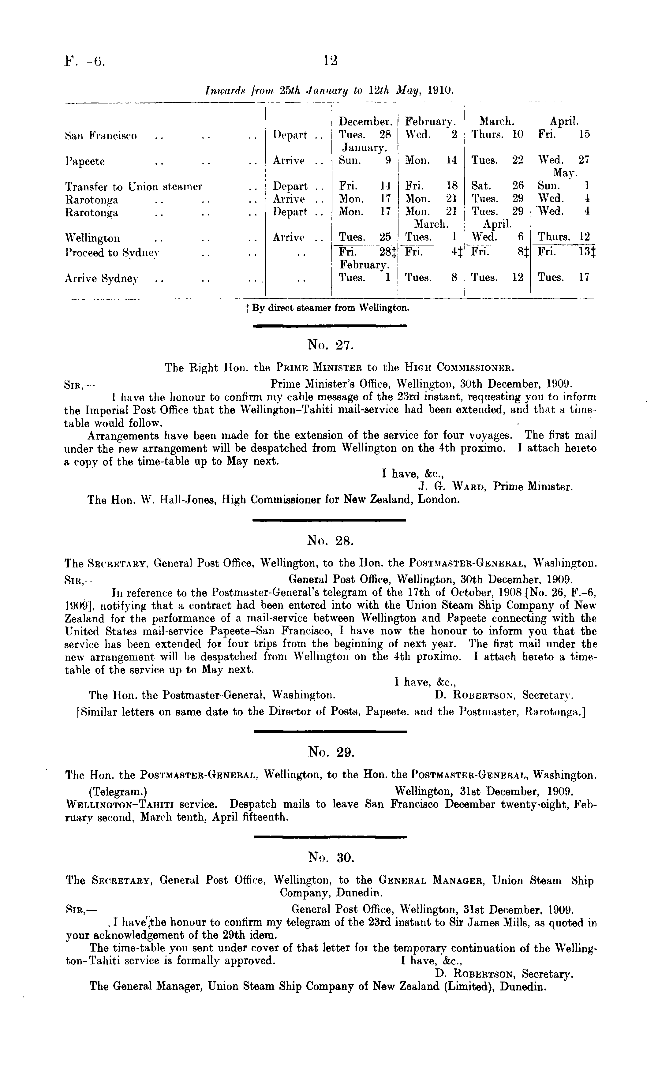 No. 28. The Secretary, General Post Office, Wellington, to the Hon. the Postmaster-General, Washington. Sir,— General Post Office, Wellington, 30th December, 1909. In reference to the Postmaster-General's telegram of the 17th of October, 1908 (No. 26, F.-6, 1909], notifying that a contract had been entered into with the Union Steam Ship Company of New Zealand for the performance of a mail-service between Wellington and Papeete connecting with the United States mail-service Papeete-San Francisco, I have now the honour to inform you that the service has been extended for four trips from the beginning of next year. The first mail under the new arrangement will be despatched from Wellington on the 4th proximo. I attach heieto a timetable of the service up to May next. I have, &c, The Hon. the Postmaster-General, Washington. D. Robertson, Secretary. [Similar letters on same date to the Director of Posts, Papeete, and the Postmaster, Rarotonga.)