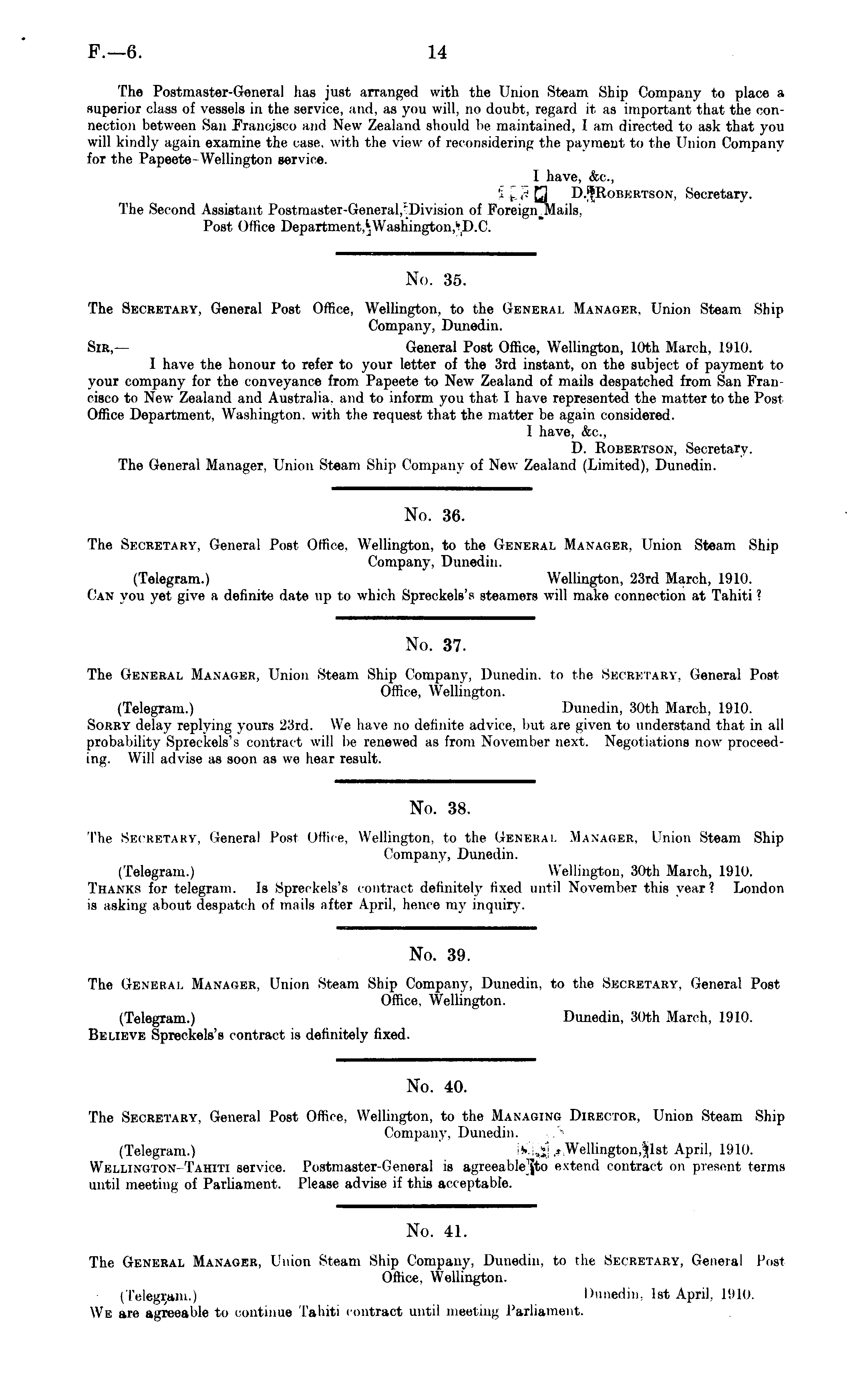 No. 41. The General Manager, Union Steam Ship Company, Dunedin, to the Secretary, General Post Office. Wellington. (Telegram.) Dunedin. Ist April, 1910. We are agreeable to continue Tahiti contract until meeting Parliament.