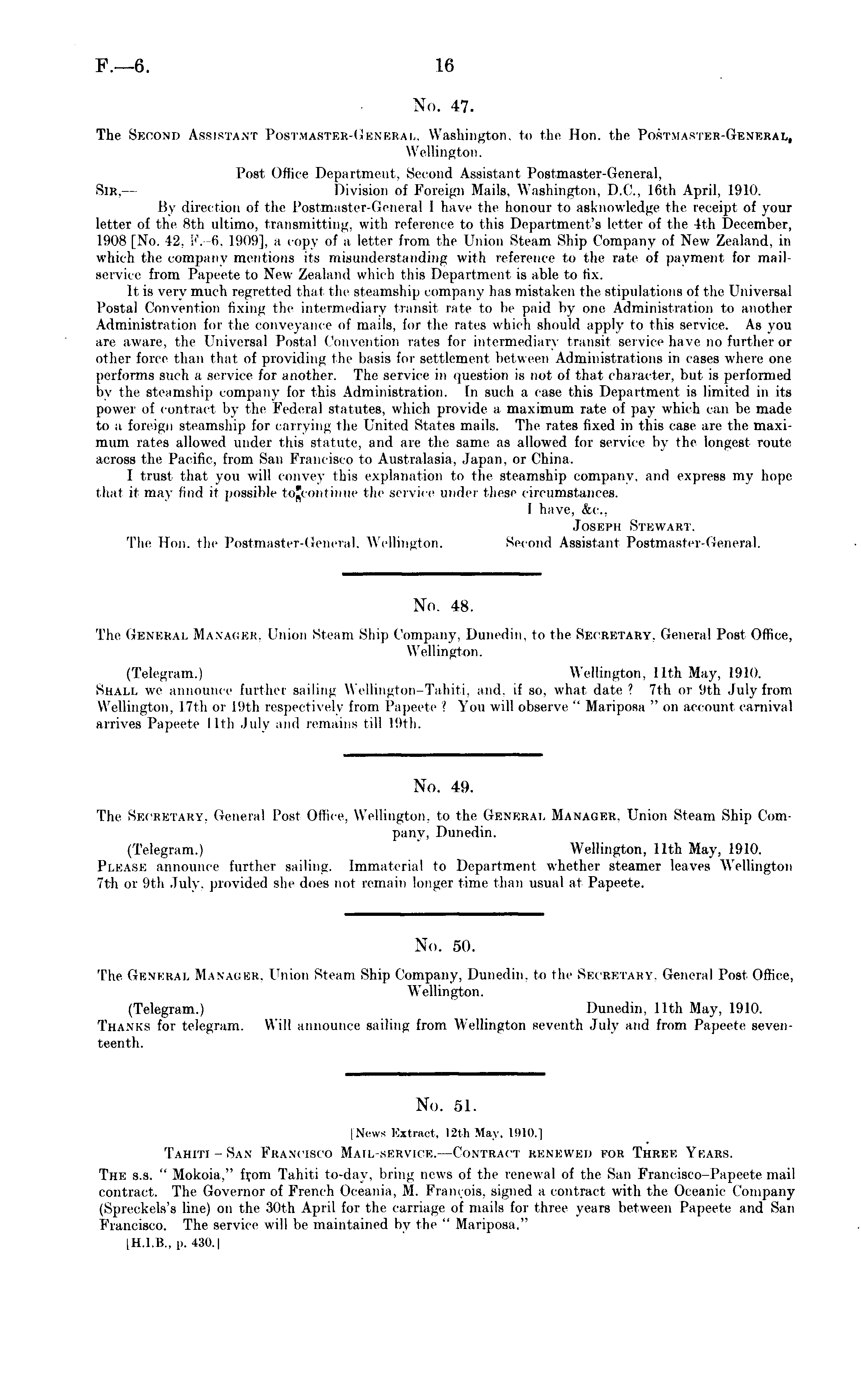 The Second Assistant Postmaster-General, Washington, to the Hon. the Postmaster-General, Wellington. Post Office Department, Second Assistant Postmaster-General, Sir, — Division of Foreign Mails, Washington, D.C., 16th April, 1910. By direction of the Postmaster-General I have the honour to asknowledge the receipt of your letter of the Bth ultimo, transmitting, with reference to this Department's letter of the 4th December, 1908 [No. 42, F.-6, 1909], a copy of a letter from the Union Steam Ship Company of New Zealand, in which the company mentions its misunderstanding with reference to the rate of payment for mailservice from Papeete to New Zealand which this Department is able to fix. It is very much regretted that the steamship company has mistaken the stipulations of the Universal Postal Convention fixing the intermediary transit rate to be paid by one Administration to another Administration for the conveyance of mails, for the rates which should apply to this service. As you are aware, the Universal Postal Convention rates for intermediary transit service have no further or other force than that of providing the basis for settlement between Administrations in cases where one performs such a service for another. The service in question is not of that character, but is performed by the steamship company for this Administration. In such a ease this Department is limited in its power of contract by the Federal statutes, which provide a maximum rate of pay which can be made to a foreign steamship for carrying the United States mails. The rates fixed in this case are the maximum rates allowed under this statute, and are the same as allowed for service by the longest route across the Pacific, from San Francisco to Australasia, Japan, or China. I trust that you will convey this explanation to the steamship company, and express my hope that it may find it possible tojcontinue the service under these circumstances. I have, &c, Joseph Stewart, The Hon. the Postmaster-General, Wellington. Second Assistant Postmaster-General.