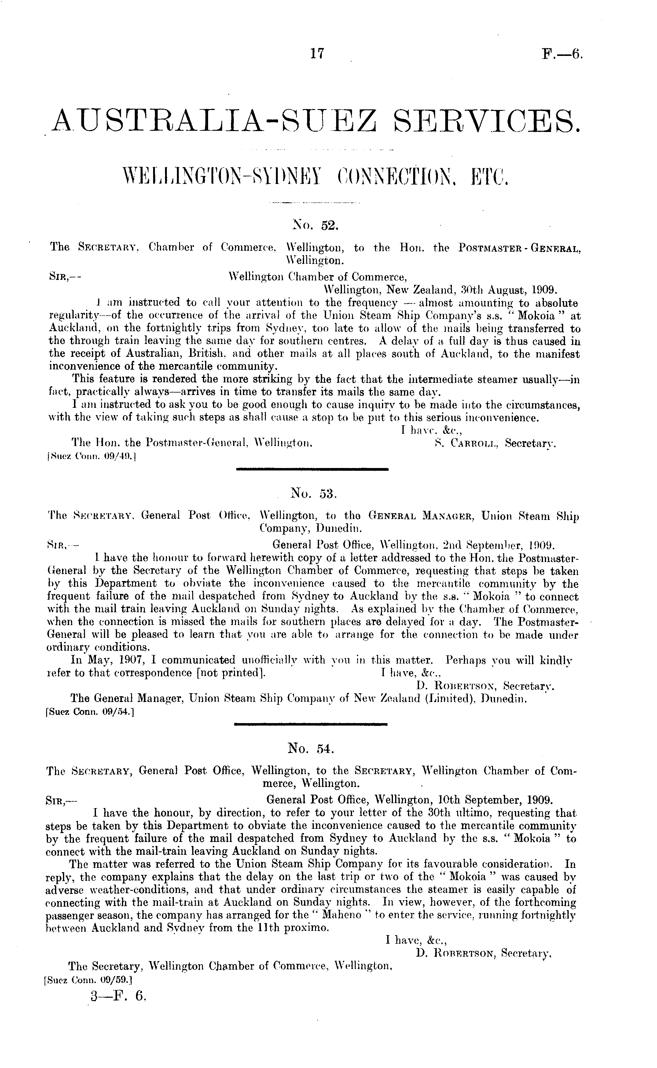 . No. 53. The Secretary, General Posl Office, Wellington, to the General Manager, Union Steam Ship (bmpany, Dunedin. Sin, General Post Office, Wellington, 2nd September, 1909. 1 have the honour to forward herewith copy of a letter addressed to the Hon. the PostmasterGeneral by the Secretary of the Wellington Chamber of Commerce, requesting that steps be taken by this Department to obviate the inconvenience caused to the mercantile community by the frequent failure of the mail despatched from Sydney to Auckland by the s.s. " Mokoia " to connect with the mail train leaving Auckland on Sunday nights. As explained by the Chamber of Commerce, when the connection is missed the mails for southern places are delayed for a day. The PostmasterGeneral will be pleased to learn that you are able to arrange for the connection to be made under ordinary conditions. In May, 1907, I communicated unofficially with you in this matter. Perhaps you will kindly refer to that correspondence [not printed]. I have, &c, D. Robertson, Secretary. The General Manager, Union Steam Ship Company of New Zealand (Limited). Dunedin. [Suez Conn. 09/54.]
