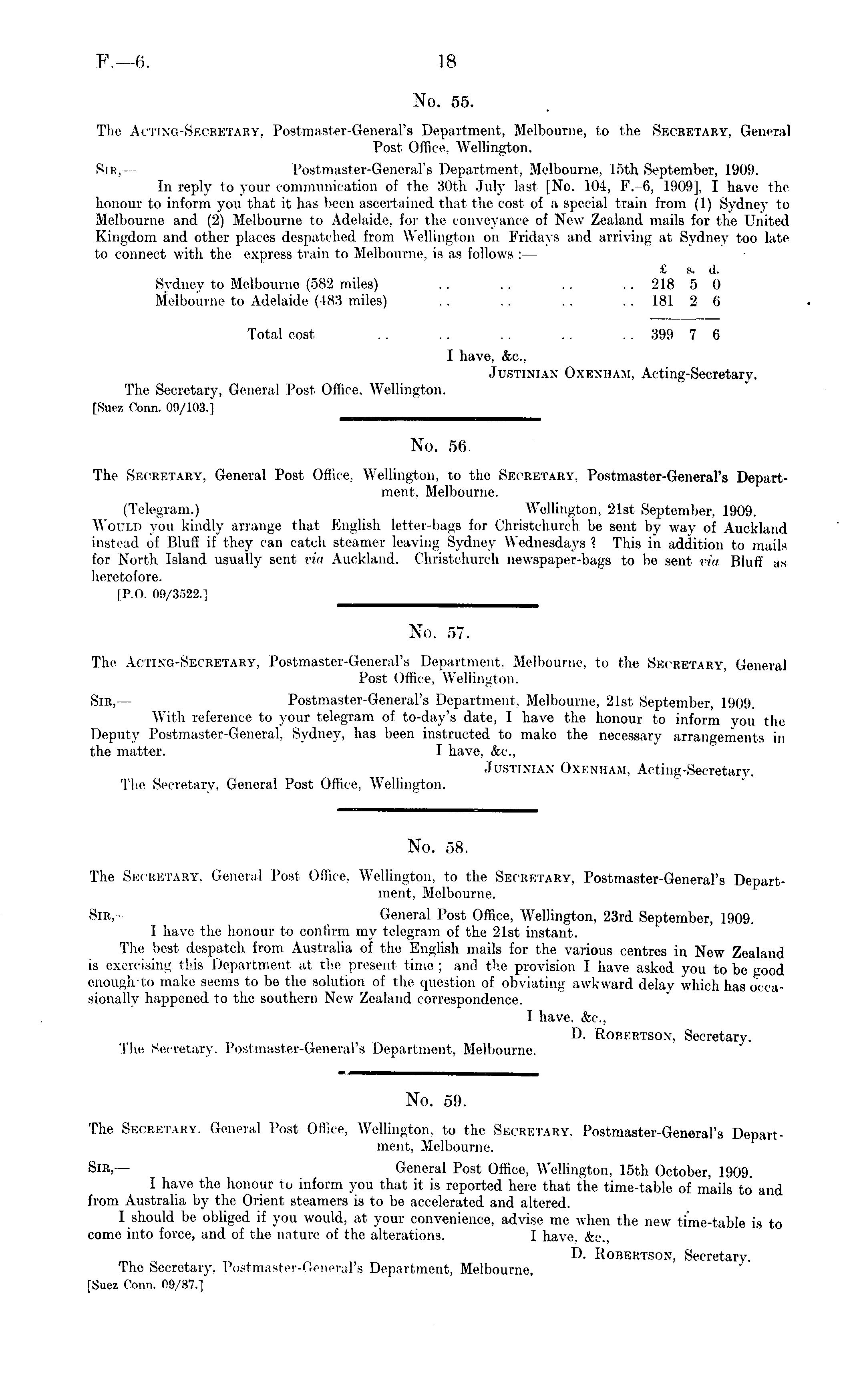 No. 57. The Acting-Secretary, Postmaster-General's Department. Melbourne, to the Secretary, General Post Office, Wellington. Sir, — Postmaster-General's Department. Melbourne, 21st September, 1909. With reference to your telegram of to-day's date, I have the honour to inform you the Deputy Postmaster-General, Sydney, has been instructed to make the necessary arrangements in the matter. I have. &c. Justinian Oxenham, Acting-Secretary. The Secretary, General Post Office, Wellington.