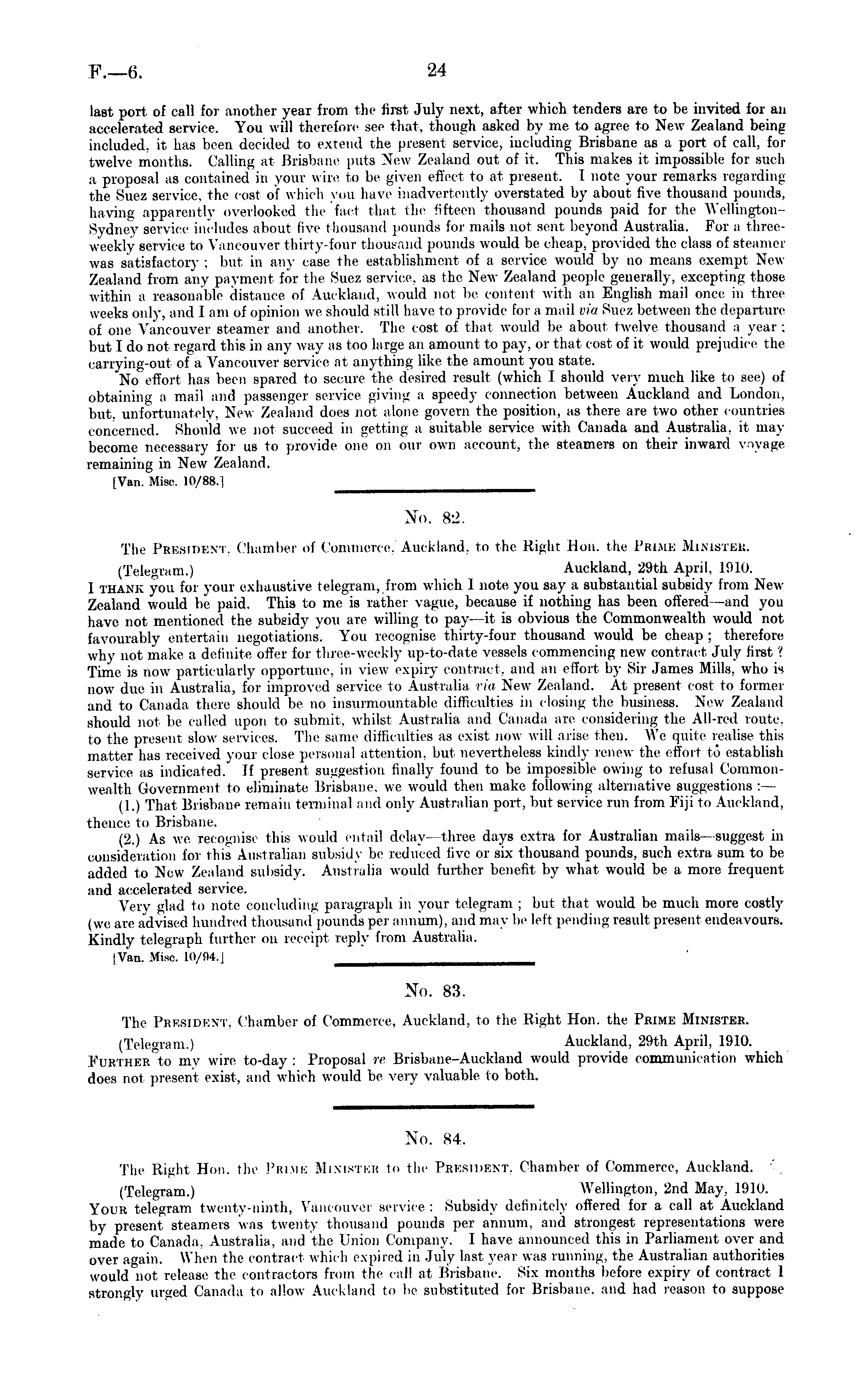 No. 82. The President, Chamber of Commerce, Auckland, to the Right Hon. the Prime Minister. (Telegram.) Auckland, 29th April, 1910. I thank you for your exhaustive telegram, from which 1 note you say a substantial subsidy from New Zealand would be paid. This to me is rather vague, because if nothing has been offered —and you have not mentioned the subsidy you are willing to pay —it is obvious the Commonwealth would not favourably entertain negotiations. You recognise thirty-four thousand would be cheap; therefore why not make a definite offer for three-weekly up-to-date vessels commencing new contract July first ? Time is now particularly opportune, in view expiry contract, and an effort by Sir James Mills, who is now due in Australia, for improved service to Australia via New Zealand. At present cost to former and to Canada there should be no insurmountable difficulties in closing the business. New Zealand should not be called upon to submit, whilst Australia and Canada are considering the All-red route, to the present slow services. The same difficulties as exist now will arise then. We quite realise this matter has received your close persona] attention, but nevertheless kindly renew the effort to establish service as indicated. If present suggestion finally found to be impossible owing to refusal Commonwealth Government to eliminate Brisbane, we would then make following alternative suggestions: — (1.) That Brisbane remain terminal and only Australian port, but service run from Fiji to Auckland, thence to Brisbane. (2.) As we recognise this would entail delay —three days extra for Australian mails —suggest in consideration for this Australian subsidy be reduced five or six thousand pounds, such extra sum to be added to New Zealand subsidy. Australia would further benefit by what would be a more frequent and accelerated service. Very glad to note concluding paragraph in your telegram ; but that would be much more costly (we are advised hundred thousand pounds per annum), and may be left pending result present endeavours. Kindly telegraph further on receipt reply from Australia. | Van. Misc. 10/94. J _____________________