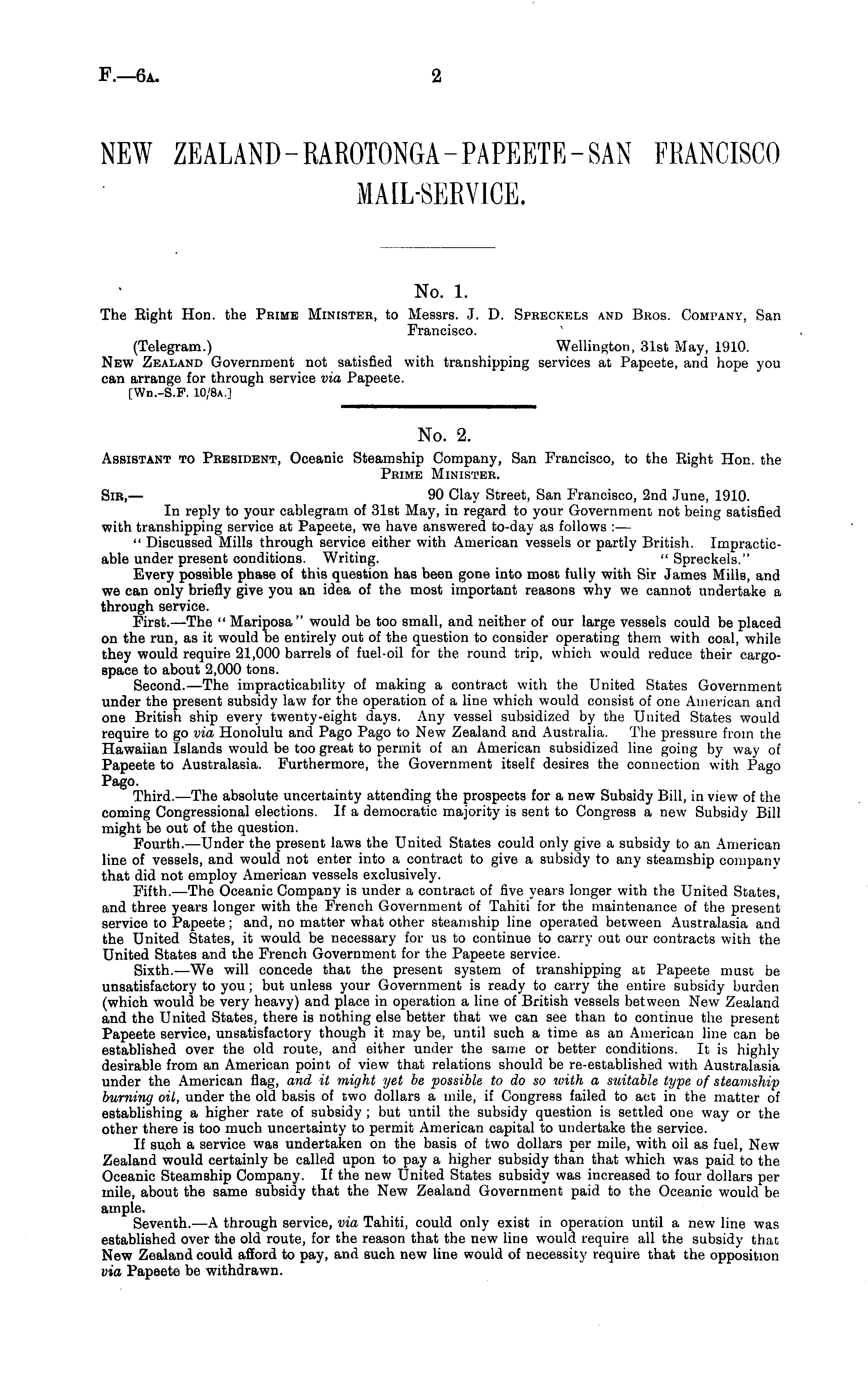 NEW ZEALAND-RAROTONGA-PAPEETE-SAN FRANCISCO MAIL-SERVICE. No. 1. The Eight Hon. the Prime Minister, to Messrs. J. D. Spheckels and Bbos. Company, San Francisco. (Telegram.) Wellington, 31st May, 1910. New Zealand Government not satisfied with transhipping services at Papeete, and hope you can arrange for through service via Papeete. [Wn.-S.F. 10/Ba.] No. 2. Assistant to President, Oceanic Steamship Company, San Francisco, to the Right Hon. the Prime Minister. Sib, — 90 Clay Street, San Francisco, 2nd June, 1910. In reply to your cablegram of 31st May, in regard to your Government not being satisfied with transhipping service at Papeete, we have answered to-day as follows :— " Discussed Mills through service either with American vessels or partly British. Impracticable under present conditions. Writing. " Spreckels." Every possible phase of this question has been gone into most fully with Sir James Mills, and we can only briefly give you an idea of the most important reasons why we cannot undertake a through service. First. —The "Mariposa" would be too small, and neither of our large vessels could be placed on the run, as it would be entirely out of the question to consider operating them with coal, while they would require 21,000 barrels of fuel-oil for the round trip, which would reduce their cargospace to about 2,000 tons. Second.—The impracticability of making a contract with the United States Government under the present subsidy law for the operation of a line which would consist of one American and one British ship every twenty-eight days. Any vessel subsidized by the United States would require to go via Honolulu and Pago Pago to New Zealand and Australia. The pressure from the Hawaiian Islands would be too great to permit of an American subsidized line going by way of Papeete to Australasia. Furthermore, the Government itself desires the connection with Pago Pago. Third. —The absolute uncertainty attending the prospects for a new Subsidy Bill, in view of the coming Congressional elections. If a democratic majority is sent to Congress a new Subsidy Bill might be out of the question. Fourth.—Under the present laws the United States could only give a subsidy to an American line of vessels, and would not enter into a contract to give a subsidy to any steamship company that did not employ American vessels exclusively. Fifth. —The Oceanic Company is under a contract of five years longer with the United States, and three years longer with the French Government of Tahiti for the maintenance of the present service to Papeete; and, no matter what other steamship line operated between Australasia and the United States, it would be necessary for us to continue to carry out our contracts with the United States and the French Government for the Papeete service. Sixth. —We will concede that the present system of transhipping at Papeete must be unsatisfactory to you; but unless your Government is ready to carry the entire subsidy burden (which would be very heavy) and place in operation a line of British vessels between New Zealand and the United States, there is nothing else better that we can see than to continue the present Papeete service, unsatisfactory though it may be, until such a time as an American line can be established over the old route, and either under the same or better conditions. It is highly desirable from an American point of view that relations should be re-established with Australasia under the American flag, and it might yet be possible to do so with a suitable type of steamship burning oil, under the old basis of two dollars a mile, if Congress failed to act in the matter of establishing a higher rate of subsidy ; but until the subsidy question is settled one way or the other there is too much uncertainty to permit American capital to undertake the service. If such a service was undertaken on the basis of two dollars per mile, with oil as fuel, New Zealand would certainly be called upon to pay a higher subsidy than that which was paid to the Oceanic Steamship Company. If the new United States subsidy was increased to four dollars per mile, about the same subsidy that the New Zealand Government paid to the Oceanic would be ample. Seventh.—A through service, via Tahiti, could only exist in operation until a new line was established over the old route, for the reason that the new line would require all the subsidy that New Zealand could afford to pay, and such new line would of necessity require that the opposition via Papeete be withdrawn.