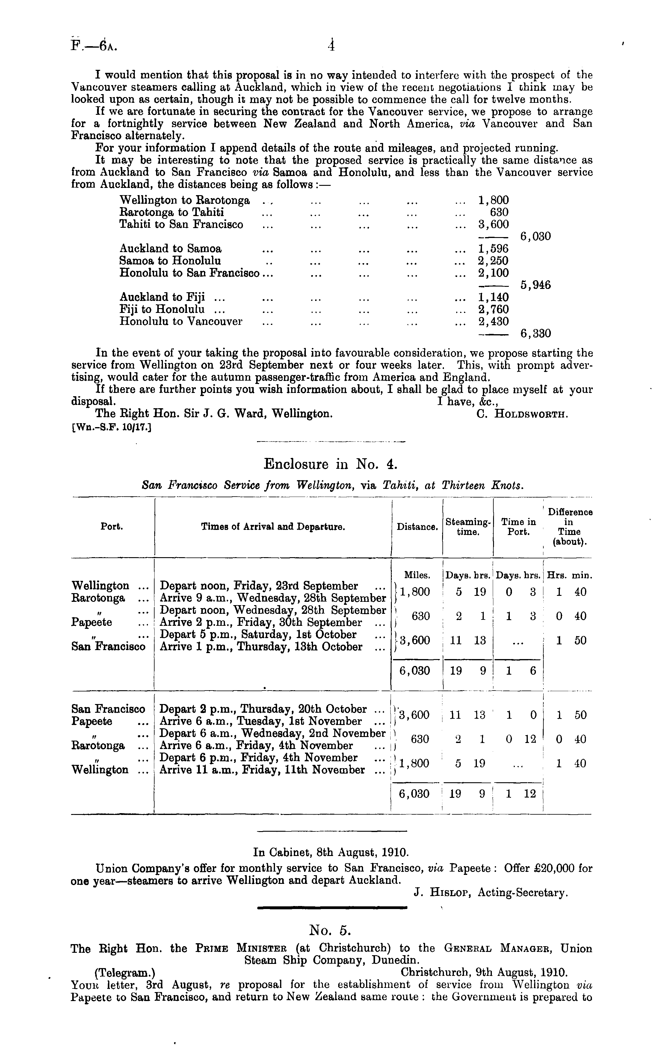 Enclosure in No. 4. San Francisco Service from Wellington, via Tahiti, at Thirteen Knots.