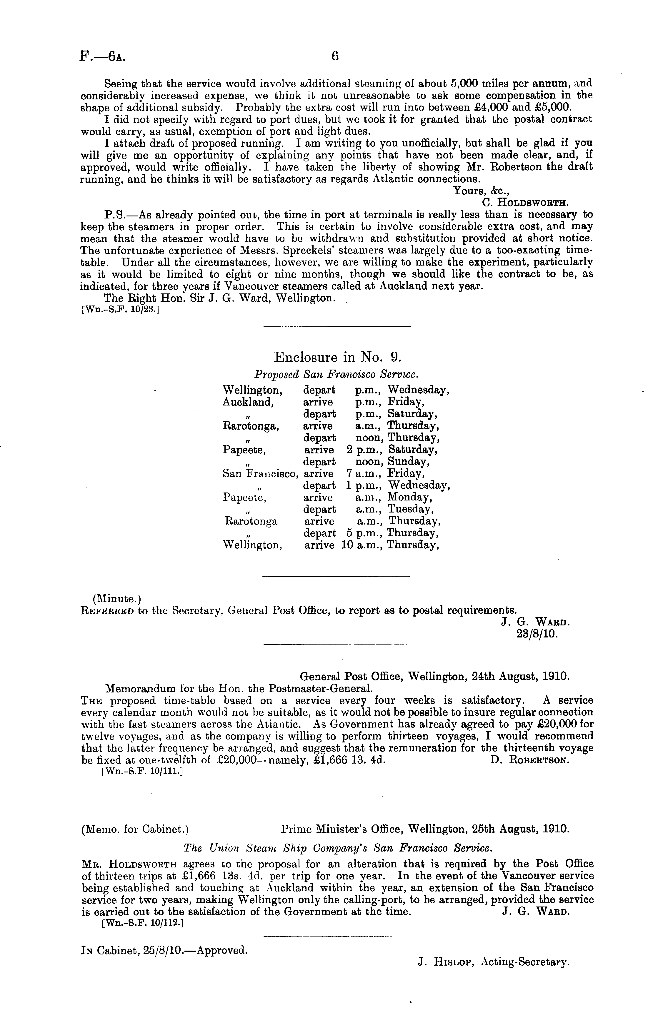 Seeing that the service would involve additional steaming of about 5,000 miles per annum, and considerably increased expense, we think it not unreasonable to ask some compensation in the shape of additional subsidy. Probably the extra cost will run into between £4,000 and £5,000. I did not specify with regard to port dues, but we took it for granted that the postal contract would carry, as usual, exemption of port and light dues. I attach draft of proposed running. lam writing to you unofficially, but shall be glad if you will give me an opportunity of explaining any points that have not been made clear, and, if approved, would write officially. I have taken the liberty of showing Mr. Eobertson the draft running, and he thinks it will be satisfactory as regards Atlantic connections. Yours, &c, C. HOLDSWOBTH. P.S.—As already pointed out, the time in port at terminals is really less than is necessary to keep the steamers in proper order. This is certain to involve considerable extra cost, and may mean that the steamer would have to be withdrawn and substitution provided at short notice. The unfortunate experience of Messrs. Spreckels' steamers was largely due to a too-exacting timetable. Under all the circumstances, however, we are willing to make the experiment, particularly as it would be limited to eight or nine months, though we should like the contract to be, as indicated, for three years if Vancouver steamers called at Auckland next year. The Eight Hon. Sir J. G. Ward, Wellington. [Wn.-S.P. 10/23.] Enclosure in No. 9. Proposed San Francisco Service. Wellington, depart p.m., Wednesday, Auckland, arrive p.m., Friday, „ depart p.m., Saturday, Earotonga, arrive a.m., Thursday, „ depart noon, Thursday, Papeete, arrive 2 p.m., Saturday, „ depart noon, Sunday, San Francisco, arrive 7 a.m., Friday, > „ depart 1 p.m., Wednesday, Papeete, arrive a.m., Monday, „ depart a.m., Tuesday, Earotonga arrive a.m., Thursday, depart 5 p.m., Thursday, Wellington, arrive 10 a.m., Thursday, (Minute.) Beferked to the Secretary, General Post Office, to report as to postal requirements. J. G. Wakd. 23/8/10. General Post Office, Wellington, 24th August, 1910. Memorandum for the Hon. the Postmaster-General. The proposed time-table based on a service every four weeks is satisfactory. A service every calendar month would not be suitable, as it would not be possible to insure regular connection with the fast steamers across the Atlantic. As Government has already agreed to pay £20,000 for twelve voyages, and as the company is willing to perform thirteen voyages, I would recommend that the latter frequency be arranged, and suggest that the remuneration for the thirteenth voyage be fixed at one-twelfth of £20,000—namely, £1,666 13. 4d. D. Eobertson. [Wn.-S.P. 10/111.] (Memo, for Cabinet.) Prime Minister's Office, Wellington, 25th August, 1910. The Union Steam Ship Company's San Francisco Service. Mr. HoliDsworth agrees to the proposal for an alteration that is required by the Post Office of thirteen trips at £1,666 13s. id. per trip for one year. In the event of the Vancouver service being established and touching at Auckland within the year, an extension of the San Francisco service for two years, making Wellington only the calling-port, to be arranged, provided the service is carried out to the satisfaction of the Government at the time. J. G. Ward. [Wn.-S.F. 10/112.] In Cabinet, 25/8/10. —Approved. J. Hislop, Acting-Secretary.