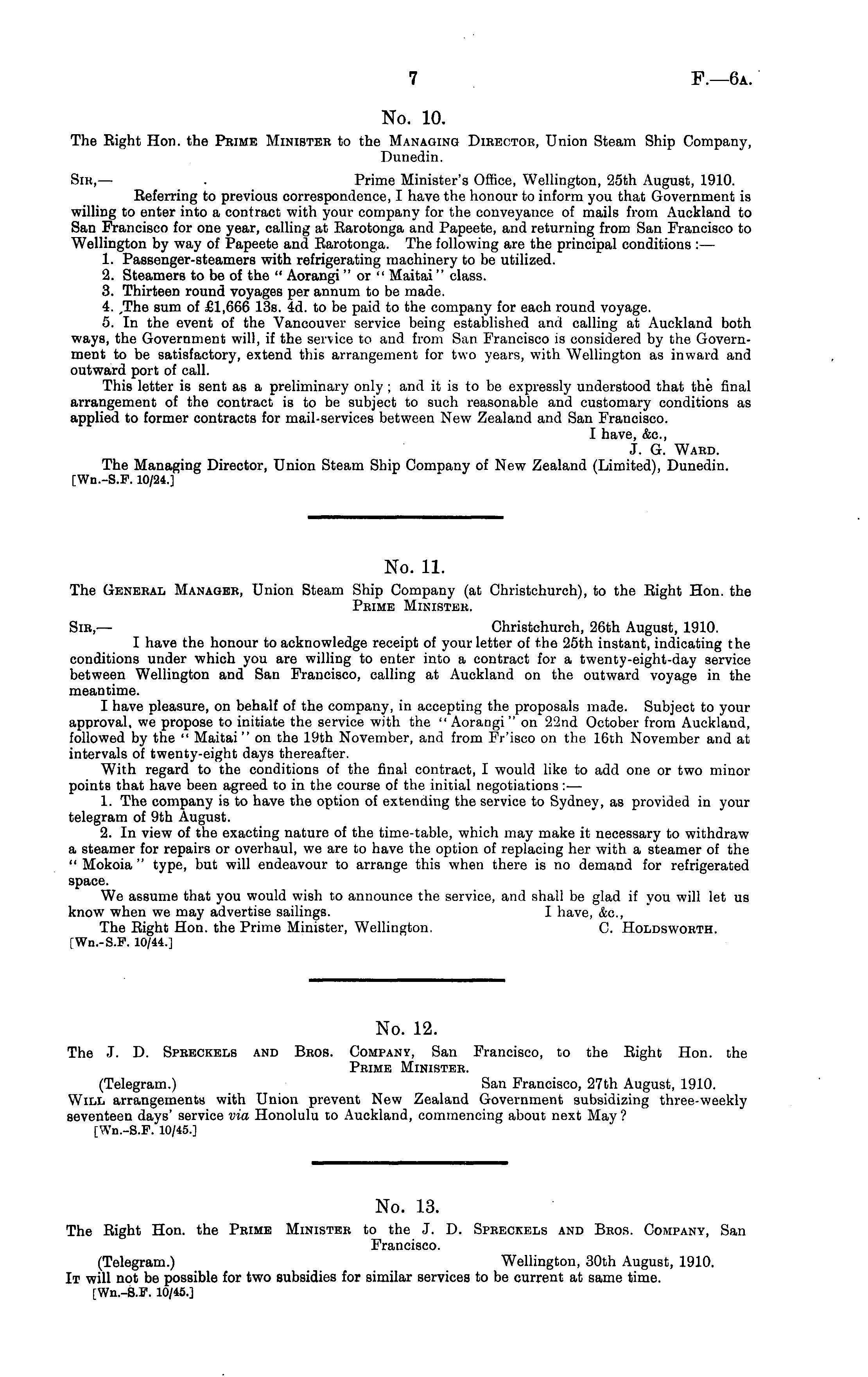 No. 10. The Right Hon. the Peime Minister to the Managing Director, Union Steam Ship Company, Dunedin. Sir, — . Prime Minister's Office, Wellington, 25th August, 1910. Referring to previous correspondence, I have the honour to inform you that Government is willing to enter into a contract with your company for the conveyance of mails from Auckland to San Francisco for one year, calling at Rarotonga and Papeete, and returning from San Francisco to Wellington by way of Papeete and Rarotonga. The following are the principal conditions : — 1. Passenger-steamers with refrigerating machinery to be utilized. 2. Steamers to be of the " Aorangi " or " Maitai " class. 3. Thirteen round voyages per annum to be made. 4. ,The sum of £1,666 13s. 4d. to be paid to the company for each round voyage. 5. In the event of the Vancouver service being established and calling at Auckland both ways, the Government will, if the service to and from San Francisco is considered by the Government to be satisfactory, extend this arrangement for two years, with Wellington as inward and outward port of call. This letter is sent as a preliminary only ; and it is to be expressly understood that the final arrangement of the contract is to be subject to such reasonable and customary conditions as applied to former contracts for mail-services between New Zealand and San Francisco. I have, &c, J. G. Ward. The Managing Director, Union Steam Ship Company of New Zealand (Limited), Dunedin. [Wn.-S.F. 10/24.] No. 11. The General Manager, Union Steam Ship Company (at Christchurch), to the Right Hon. the Prime Minister. Sir, — Christchurch, 26th August, 1910. I have the honour to acknowledge receipt of your letter of the 25th instant, indicating the conditions under which you are willing to enter into a contract for a twenty-eight-day service between Wellington and San Francisco, calling at Auckland on the outward voyage in the meantime. I have pleasure, on behalf of the company, in accepting the proposals made. Subject to your approval, we propose to initiate the service with the "Aorangi" on 22nd October from Auckland, followed by the " Maitai " on the 19th November, and from Frisco on the 16th November and at intervals of twenty-eight days thereafter. With regard to the conditions of the final contract, I would like to add one or two minor points that have been agreed to in the course of the initial negotiations : — 1. The company is to have the option of extending the service to Sydney, as provided in your telegram of 9th August. 2. In view of the exacting nature of the time-table, which may make it necessary to withdraw a steamer for repairs or overhaul, we are to have the option of replacing her with a steamer of the " Mokoia " type, but will endeavour to arrange this when there is no demand for refrigerated space. We assume that you would wish to announce the service, and shall be glad if you will let us know when we may advertise sailings. I have, &c, The Right Hon. the Prime Minister, Wellington. C. Holdsworth. [Wn.-S.P. 10/44.] No. 12. The J. D. Spreckels and Bros. Company, San Francisco, to the Right Hon. the Prime Minister. (Telegram.) San Francisco, 27th August, 1910. Will arrangements with Union prevent New Zealand Government subsidizing three-weekly seventeen days' service via Honolulu to Auckland, commencing about next May ? [Wn.-S.P. 10/45.] No. 13. The Right Hon. the Prime Minister to the J. D. Spreckels and Bros. Company, San Francisco. (Telegram.) Wellington, 30th August, 1910. It will not be possible for two subsidies for similar services to be current at same time. [Wn.-S.F. 10/45.]