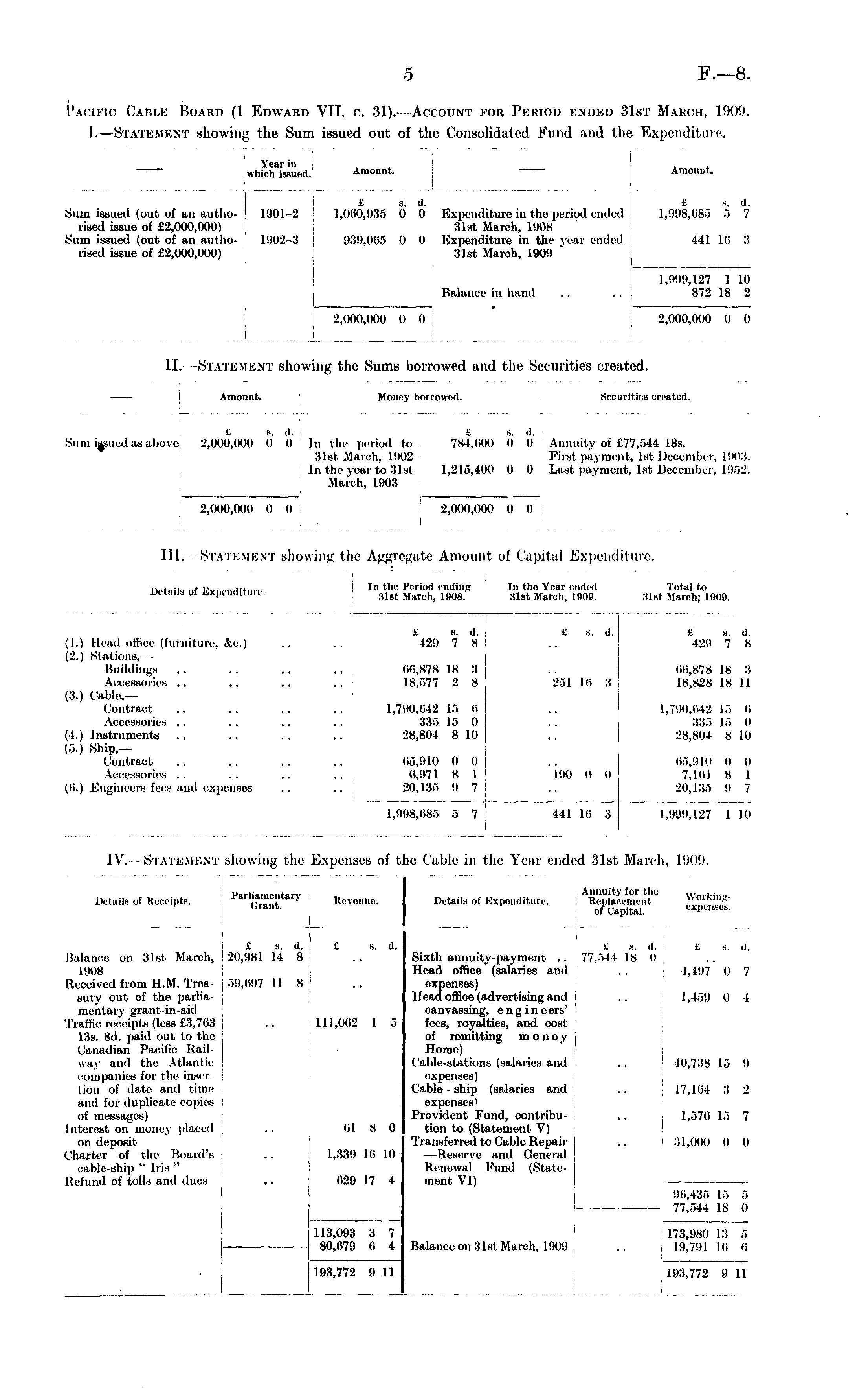 Pacific Cable Board (1 Edward VII, c. 31). — Account for Period ended 31st March, 1909. I.—Statement showing the Sum issued out of the Consolidated Fund and the Expenditure.