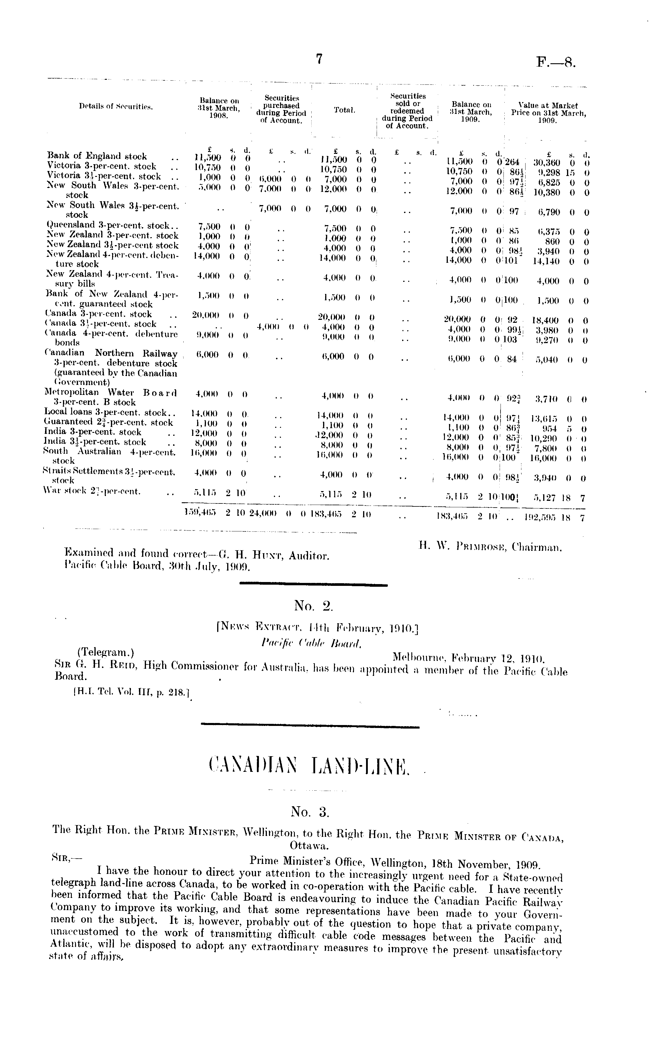 Examined and found correct G. H. Hunt, Auditor. "' Pbimbose - Chairman. Pacific Cable Board; 30th July, 1909, No. 2. [News Extract, I Ith February, 1910.] Pacific ('iililc Board SIR , ;; ,, '-' „■ v p t X Melbourne, February 12, 1910. Sard Commissioner for Australia, has been appointed a member of the Pacific Cable [H.I. Tc|. Vol. lir, p. 218.] CANADIAN LAND-LINK . No. 3. The Right Hon. the Prime Minister, Wellington, to the Right Hon. the Pmme Minister of Canada Ottawa. 8lB >— Prime Minister's Office, Wellington, 18th November, 1009 i . hi T y the honou ' *o direct your attention to the increasingly orgeni need for a elegraph land-lme across Canada, to be worked in co-operation with the Pacific cable. I have iv.rntlv been informed that the Pacific Cable Board is endeavouring to bduce the Canadian Pacific Sv Company to improve ita.working, and that some representations have been made to your Government on the subject. It is, however, probably out of the question to hope that a private company unaccustomed to the work difficult ,-able code messagesbetweeJ SKPacS* and Atkntic w>ll be disposed to adopt any extraordinary measures to improve the present unsaSacSy