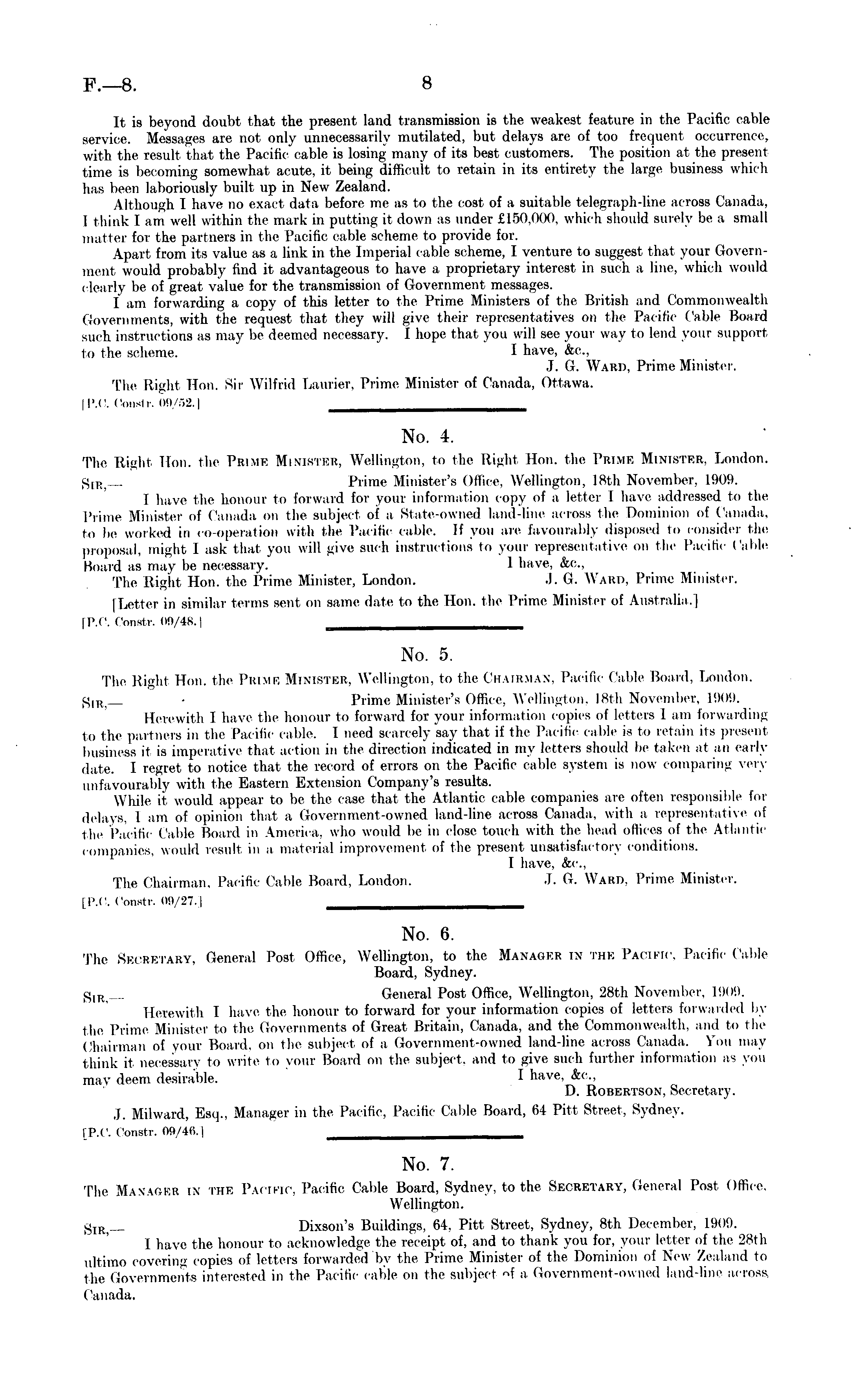 It is beyond doubt that the present land transmission is the weakest feature in the Pacific cable service. Messages are not only unnecessarily mutilated, but delays are of too frequent occurrence, with the result that the Pacific cable is losing many of its best customers. The position at the present time is becoming somewhat acute, it being difficult to retain in its entirety the large business which has been laboriously built up in New Zealand. Although I have no exaci data before me as to the cost of a suitable telegraph-line across Canada. 1 think 1 am well within the mark in putting it down as under £160,000, which should surely be a small matter for the partners in the Pacific cable scheme to provide for. \part from its value as a link in the Imperial (able scheme, I venture to suggest that your Government would probably find it advantageous to have a proprietary interest in such a line, which would clearly be of great value for the transmission of Government messages. I am forwarding a copy of this letter to the Prime Ministers of the British and Commonwealth Governments, with the request that they will give their representatives on the Pacific Cable Board such instructions as may be deemed necessary. 1 hope that you will see your way to lend your support to bhe scheme. I have, &c, J. G. Ward, Prime Minister. The Right Hon. Sir Wilfrid Laurier, Prime Minister of Canada, Ottawa. fP.C. Conetr. 09/52.] ________^_^_____ No. 4. The Right Hon. the I'himk Minister, Wellington, to the Right Hon. the Prime Minister. London. Si,,. Prime Minister's Office, Wellington, 18th November, 1909. I have the honour to forward for your information copy of a letter I have addressed to the Prime Minister of Canada on the subject of a State-owned land-line across the Dominion of Canada. to be worked in co-operation with the Pacific cable. If you are favourably disposed to consider the proposal, might 1 ask that you will give such instructions to your representative on the Pacific Cable Board as may lie necessary. ' have, &c, The RigW lion, (he Prime Minister. London. J. G. W.\ltl>. Prime Minister. [Letter in similar terms sent on same date to the Hon. the Prime Minister of Australia,.] [P.C. Conetr. 09/48.] .^^—— No. 5. The Righi Hon. the Prime Minister, Wellington, to the Chairman. Pacific Cable Board. London. ft IR; _ ■ Prime Minister's Office. Wellington, 18th November, 1909. Herewith 1 have the honour to forward for your information copies of letters I am forwarding to the partners in the Pacific cable. I need scarcely say that if the Pacific cable is to retain its present business it is imperative that action in the direction indicated in my letters should be taken at an early date. 1 regret to notice that the record of errors on the Pacific cable system is now comparing very unfavourably with the Eastern Extension Company's results. While il would appear to be the case that the Atlantic cable companies are often responsible for delays, I am of opinion that a Government-owned land-line across Canada, witli a representative of the Pacific Cable Hoard in America,, who would be in close touch with the head offices of the Atlantic companies, would result in a material improvement of the present unsatisfactory conditions. I have, Sec., The Chairman. Pacific Cable Hoard. London. J. G. Ward, Prime Minister. [P.C. Conetr. 09/27.] _____^_^________ No. 6. The Secretary, General Post Office, Wellington, to the Manager in the Pacific, Pacific Cable Board, Sydney. S, R) __ General Post Office, Wellington, 28th November. I D 0 ,.). Herewith I have the honour to forward for your information copies of letters forwarded by the Prime Minister to the Governments of Great Britain, Canada, and the Commonwealth, and to the Chairman of your Hoard, on the subject of a Government-owned land-line across Canada. You may think it necessary to write to your Board on the subject, and to give such further information as you may deem desirable. I have. &c. D. Robertson, Secretary. J. Milward, Esq., Manager in the Pacific. Pacific Cable Board, 64 Pitt Street. Sydney. [P.C. Conetr. 09/46.] __^____^^__^—. No. 7. The Manages in the Pacific, Pacific Cable Board, Sydney, to the Secretary, General Post Oflice, Wellington. g lß __ Dixson's Buildings, 64, Pitt Street, Sydney, Bth December, 1909. I have the honour to acknowledge the receipt of, and to thank you for, your letter of the 28th ultimo covering copies of letters forwarded by the Prime Minister of the Dominion of New Zealand to the Governments interested in the Pacific Cable on the subject ■>{ a Covernment-ow ned land-line across Canada.