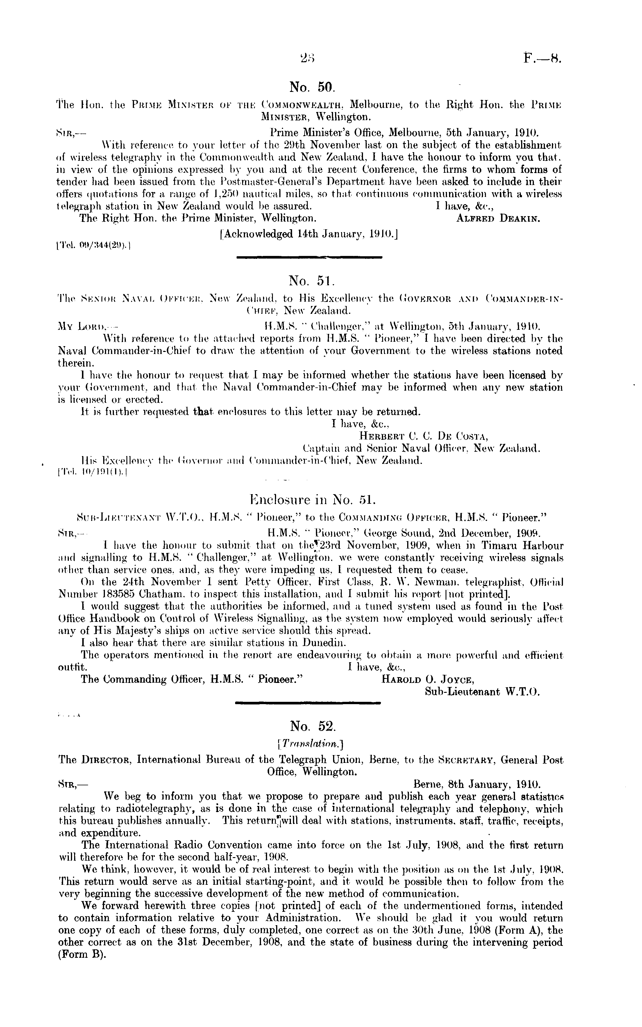 No. 50. The linn, the Prime Minister of the Commonwealth, Melbourne, to the Uight Hon. the Prime Minister, Wellington. Sir, — Prime Minister's Office, Melbourne, sth January, 1910. With reference to your letter of the 29th November last on the subject of the establishment of wireless telegraphy in the Commonwealth and New Zealand. 1 have the honour to inform you that, in view of the opinions expressed by you and at the recent Conference, the firms to whom forms of tender had been issued from the Postmaster-General's Department have been asked to include in their offers quotations for ;i range of 1,250 nautical miles, so that continuous' communication with a wireless telegraph etation in New Zealand would be assured. I have, &c, The Rif.'lit Hon. the Prime Minister, Wellington. Alfred Deakin. I Acknowledged 14th January, 19J0.J [Tel. 09 '344(20).] No. 51. The Senior Naval Officer, New Zealand, to His Excellency the Governor and Commander-in- ( Ihtef, New Zealand. .My Lord, 11.M.5. " Challenger," ai Wellington, sth January, 1910. With reference to the attached reports from 11.M.5. " Pioneer," 1 have, been directed by the Naval Commander-in-Chief to draw the attention of youi Government to the wireless stations noted therein. I have the honour to request that I may be informed whether the stations have been licensed by your Government, and that the Naval Commander-in-Chief may b< l informed when any new station is licensed oi erected. It is further requested that enclosures to this letter may be returned. I have, &c, Herbert C. C. De Costa, Captain and Senior Naval Officer. New Zealand. 11 1> Excellency the Governor and Commander-in-Chief, New Zealand. [Tel. 10 191(1).] Enclosure in No. 51. Bub-Lieutenant W.T.0., 11.M.5. " Pioneer," to the Commanding Officer, 11..M.5. " Pioneer." Sir, 11..M.5. " Pioneer." George Sound, 2nd December, 1909. I have the honour to submit that on thej23rd November, 1909, when in Timaru Harbour and signalling to H.M.S. " Challenger," at Wellington, we were constantly receiving wireless signals oilier than service ones, and, as they were impeding us. I requested them to cease. On the 24th November I. sent Petty Officer. First (lass. R. \Y. Newman, telegraphist, Official Number 183585 Chatham, to inspect this installation, and I submit bis report [not printed]. 1 would suggest that the authorities be informed, and a tuned system used as found in the Post Office Handbook on Control of Wireless Signalling, as the system now employed would seriously affect any of His Majesty's ships on active service should this spread. I also hear that there are similar stations in Duiiedin. The operators mentioned in the report are endeavouring to obtain a more powerful and efficient outfit. I have, &c, The Commanding Officer, H.M.S. " Pioneer." Harold O. Joyce, Sub-Lieutenant W.T.I). . No. 52. [Translation.] The, Director, International Bureau of the Telegraph Union, Berne, to the SECRETARY, General Post Office, Wellington. Str,— Berne, Bth January. 1910. We beg to inform you that we propose to prepare and publish each year general statistics relating to radiotelegraphy, as is done in the case of international telegraphy and telephony, which this bureau publishes annually. This return'Jwill deal with stations, instruments, start', traffic, receipts, and expenditure. The International Radio Convention came into force on the Ist July, 1908, and the first return will therefore be for the second half-year, 1908. We think, however, it would be of real interest to begin with the position as on the Ist July. 1908. This return would serve as an initial starting-point, and it would be possible then to follow from the very beginning the successive development of the new method of communication. We forward herewith three copies [not printed] of each of the undermentioned forms, intended to contain information relative to your Administration. We should be glad it you would return one copy of each of these forms, duly completed, one correct as on the 30th June. 11)08 (Form A), the other correct as on the 31st December, 1908, and the state of business during the intervening period (Form B).