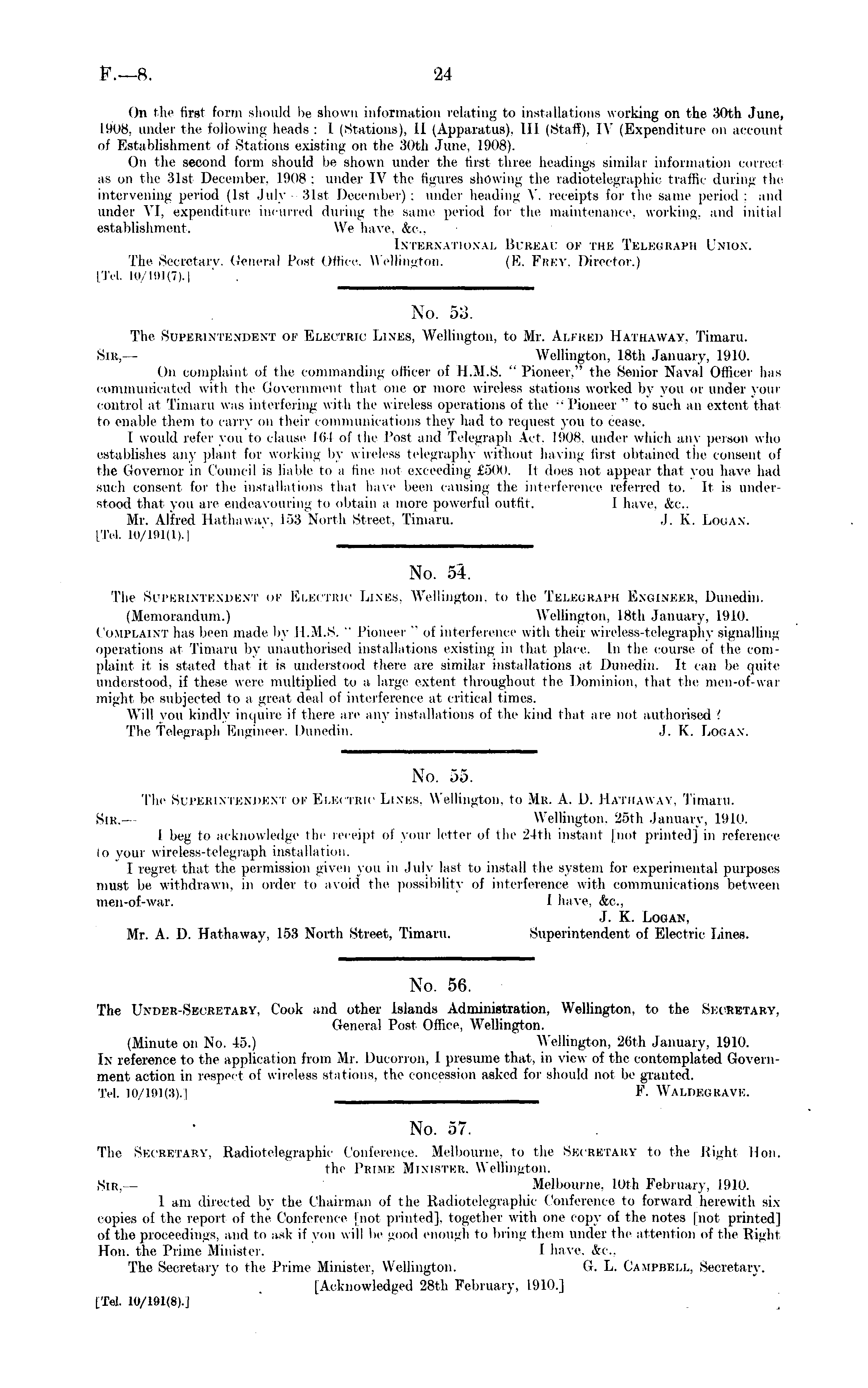 On tin , first form should We shown information relating to installations working on the 30th June, 1908. under the following beads : 1 (Stations), 11 (Apparatus), 111 (Staff), IV (Expenditure on account of Establishment of Stations existing on the 30th June. 1908). On the second form should be shown under the first three headings similar information correct as on the 31st December, 1908; under IV the figures showing the radiotelegraphic traffic during the intervening period (Ist July 31st December); under heading V. receipts for the same period: and under VI. expenditure incurred during the same period for fche maintenance, working, and initial establishment. We have, &C., International Bureau ok the Telegraph Union. The Secretary, General Post Office, Wellington. (E. Prey, Director.) [Tel. 10/191(7).] No. 53. The Superintendent of Electric Lines, Wellington, to Mr. Alfred Hathaway, Timaru. Siu,— Wellington, 18th January, 1910. On complaint of the commanding officer of 11..M.5. " Pioneer," the Senior Naval Officer has communicated with the Government that one or more wireless stations worked by you or under your control at Timaru was interfering with the wireless operations of the " Pioneer " to such an extent that to enable them to carry on their Communications they had to request you to cease. I would refer you to clause Kil of the Post and Telegraph Act. I9OH. under which any person who establishes any plant for working by wireless telegraphy without having first obtained the consent of the Governor in Council is liable to a fine not exceeding £500. It does not appear that you have had such consent for the installations that have been causing the interference referred to. It is understood that you are endeavouring to obtain a more powerful outfit. I have, &c., Mr. Alfred Hathaway, 153 North Street, Timaru. ,1. K. Logan. [Tel. 10/101(1).] No. 54. The Superintendent of Electric Lines, Wellington, to the Telegraph Engineer, Dunedin. (Memorandum.) Wellington, 18th January, 1910. Complaint has been made by 1 1..M.5. " Pioneer " of interference with their wireless-telegraphy signalling operations at Timaru by unauthorised installations existing in that place. In the course of the complaint it is stated that it is understood there are similar installations at Dunedin. It can be quite understood, if these were multiplied to a large extent throughout the Dominion, that the men-of-war might be subjected to a meat deal of interference at critical times. Will you kindly inquire if there are any installations of the kind that are not authorised '. The Telegraph Engineer, Dunedin. J. K. Logax. No. .")."). The Superintendent of Electric Lines, Wellington, to Mb. A. 1). Hathaway, Timaru. Sir,— Wellington. 25th January, 1910. I beg to acknowledge the receipi of your letter of the 24th instant [not printed] in reference lo your wireless-telegraph installation. I regret that the permission given you in .Inly last to install the system for experimental purposes must be withdrawn, in order to avoid the possibility of interference with communications between men-of-war. I have, &c, J. K. Logan, Mr. A. D. Hathaway, 153 North Street, Timaru. Superintendent of Electric Lines. No. 56. The Under-Secretary, Cook and other Islands Administration, Wellington, to the Secretary, General Post Office, Wellington. (Minute on No. 45.) Wellington, 26th January, 1910. In reference to the application from Mr. Ducorron, I presume that, in view of the contemplated Government action in resped of wireless stations, the concession asked for should not be granted, 'jvi. 10/191(8).] P. Waidegrave. No. 57. The Secretary, Radiotelegraphic Conference, Melbourne, to the Secretary to the Right Hon. the Prime Minister, Wellington. Sir, — Melbourne, 10th February, 1910. I am directed by the Chairman of the Radiotelegraphic Conference to forward herewith sixcopies of the report of the Conference 'not printed], together with one copy of the notes [not printed] of the proceedings, and to ask if you will be good enough to bring them under the attention of the Right Hon. the Prime Minister. I have, &c., The Secretary to the Prime Minister, Wellington. G. L. Campbell, Secretary. [Acknowledged 28th February. 1910.] [Tel. 10/191(8).]