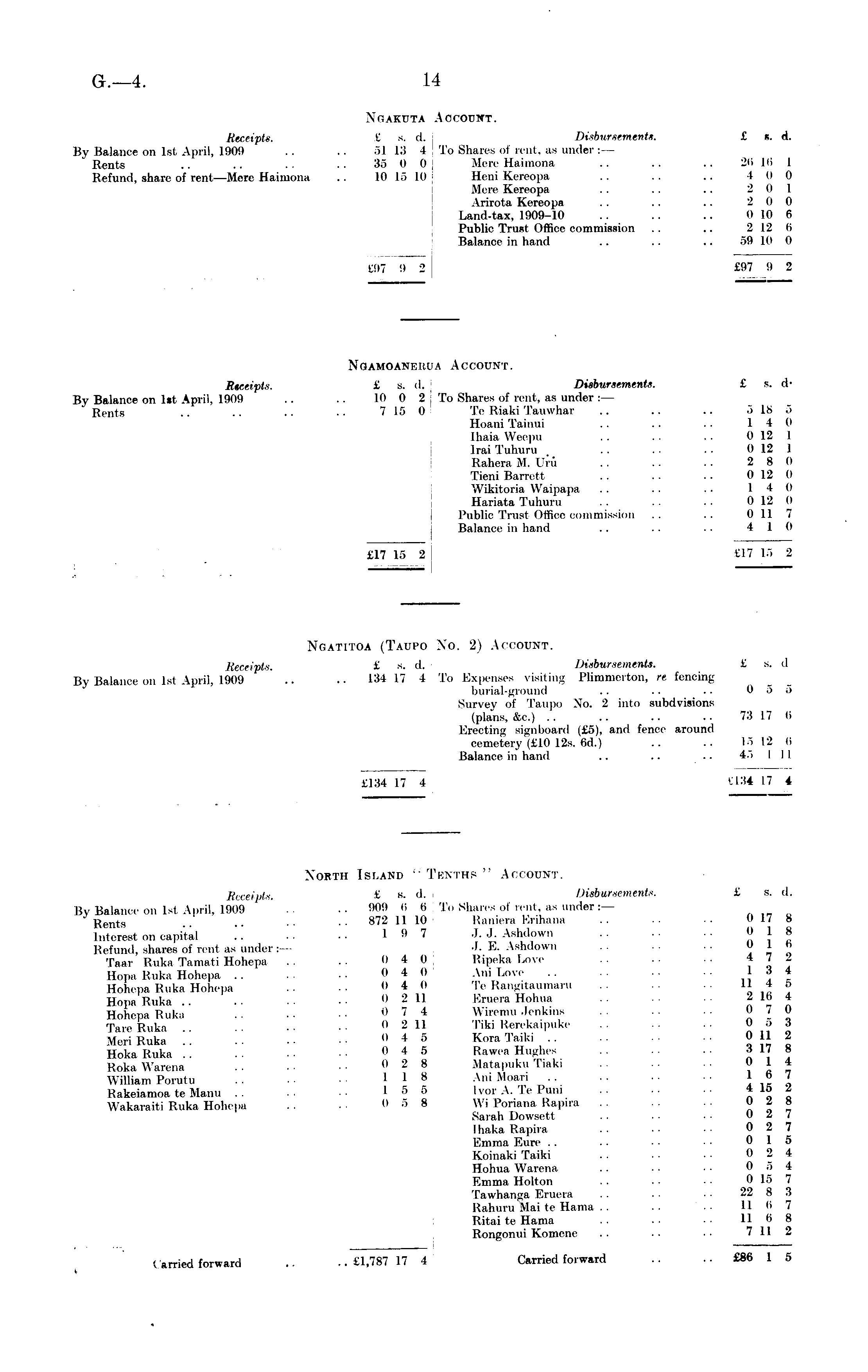 Ngakuta Account. Receipts. £ s. d. Disbursements. £ «. d. By Balance on Ist April, 1909 .. .. 51 13 4 To Shares of rent, as under : — Rents .. .. .. .. 35 0 0 Mere Haimona .. .. .. 20 10 1 Refund, share of rent—Mere Haimona .. 10 15 10 Heni Kereopa .. .. .. 4 0 0 Mere Kereopa .. .. .. 2 0 1 Arirota Kereopa .. .. .. 2 0 0 Land-tax, 1909-10 .. .. .. 010 6 Public Trust Office commission .. .. 2 12 0 Balance in hand .. .. .. 59 10 0 £97 9 2 £97 9 2 Ngamoanerua Account. Receipts. £ s. d. j Disbursements. £ s. dBy Balance on Ist April, 1909 .. .. 10 0 2 To Shares of rent, as under :— Rents .. .. .. .. 7 15 0 Te Riaki Tauwhar .. .. .. 5 18 5 Hoani Tainui .. .. 14 0 lhaia Weepu .. .. .. 0 12 1 Irai Tuhuru .. .. 0 12 1 Rahera M. Uru .. .. .. 2 8 0 Tieni Barrett .. .. .. 0 12 0 Wikitoria Waipapa .. . . .. 14 0 Hariata Tuhuru .. .. .. 0 12 0 Public Trust Office commission .. .. 011 7 Balance in hand .. .. .. 4 10 £17 15 2 £17 15 2 Ngatitoa (Taupo No. 2) Account. Receipts. £ s. d. i Disbursements. £ s. d By Balance on Ist April, 1909 .. .. 134 17 4To Expenses visiting Plimmerton, re fencing burial-ground .. .. .- 0 5 5 Survey of Taupo No. 2 into subdvisions (plans, &c.) .. .. .. .. 73 17 0 Erecting signboard (£5), and fence around cemetery (£lO 12s. 6d.) .. .. 15 12 0 Balance in hand .. .. .. 45 I 1 1 £134 17 4 £134 17 4 North Island " Tenths " Account. Receipts. £ s. d. Disbursements. £ s. d. By Balance on Ist April, 1909 .. .. 909 0 0 To Shares of rent, as under :— Rents .. .. •• ..872 1110 Raniera Erihana .. •• •■ 0 17 8 Interest on capital 19 7 J. J. Ashdown Refund, shares of rent as under:— J. E. Ashdown . . .. .. 0 1 b Taar Ruka Tamati Hohepa .. 04 0 Ripeka Love . . 4 7 2 Hopa Ruka Hohepa .. .. 0 4 0 Ani Love .. ■• 1 3 4 Hohepa Ruka Hohepa .. 0 4 0 Te Rangitaumaru 11 4 5 Hopa Ruka Q 2 11 Eruera Hohua 2 16 4 Hohepa Ruka .. .. • • 0 7 4 Wiremu Jenkins .. . - 0 7 0 Tare Ruka 0 2 11 Tiki Rerekaipuke 0 5 3 Meri Ruka .. 0 4 5 Kora Taiki " Hoka Ruka .. 0 4 5 Rawea Hughes .. .. il7 8 Roka Warena .. .. 0 2 8 Matapuku Tiaki 0 1 4 William Porutu • • 118 Am Moan .. » J Rakeiamoa te Manu .. .. 15 5 Ivor A. Te I'uni 4 15 2 Wakaraiti Ruka Hohepa 0 5 8; Wi Ponana Rapira .. • • 0 2 8 Sarah Dowsett . . 0 2 7 lhaka Rapira .. 0 2 7 Emma Eure .. . • • • 0 15 Koinaki Taiki . . .. ■ • 0 2 4 Hohua Warena .. .. 0 5 4 Emma Holton 0 15 7 Tawhanga Eruera .. • • 22 8 3 Rahuru Mai te Hama . . .. . . 110 7 Ritai te Hama .. . ■ • ■ 11 6 8 Rongonui Komene .. . • • • 711 2 Carried forward .. .. £1,787 17 4 Carried forward .. .. £86 1 5
