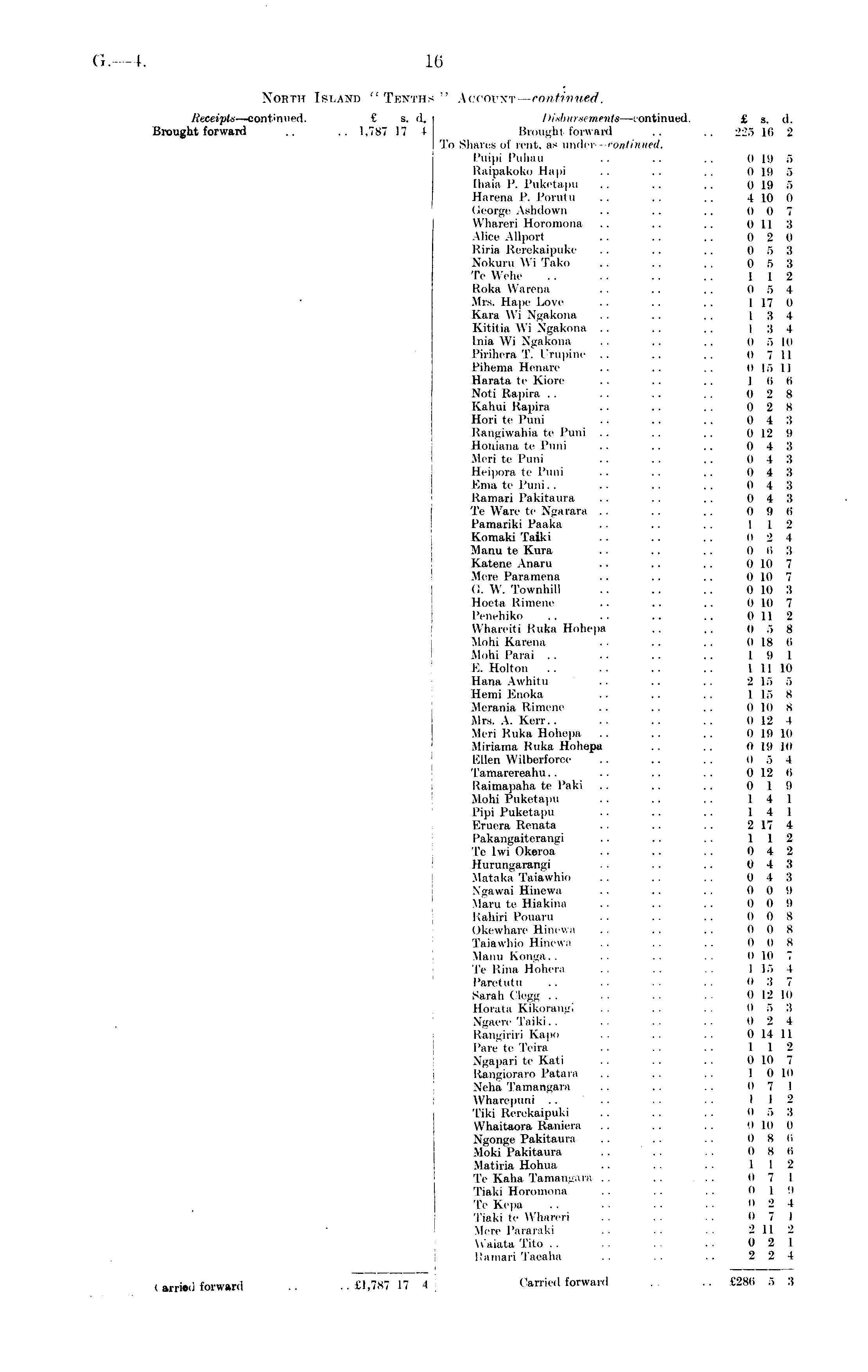 North Island "Tenths" Account continued. Receipts —continued. £ s. d. Disbursements —continued. £ s. d. Brought forward .. .. 1.787 17 I Brought forward .. .. 225 16 2 To Shares of rent, as under continued. I'uipi Puhau .. .. .. 0 19 6 Raipakoko Hapi .. .. .. 0 19 5 lhaia I. Puketapu .. .. .. 019 6 Harena P. Porutu .. .. .. 410 0 (leorge Ashdown .. .. .. 0 0 7 Whareri Horomona .. .. .. 0 113 Alice Airport .. .. .. 0 2 0 Riria Rerekaipuke .. .. .. 0 6 3 Nokui-u Wi Tako .. .. .. 0 5 3 Te Wi-he .. .. .. .. 112 Roka Warena .. .. .. 0 5 4 Mrs. Rape Love .. .. .. 1 17 0 Kara Wi Ngakona .. .. .. 13 4 Kititia Wi Ngakona .. .. .. 13 4 Inia Wi Ngakona .. .. .. 0 6 10 I'irihera T. I'l'lipinc . . . . . . 0 7 11 Pihema Henare .. .. .. 0 15 11 Sarata te Kiore .. .. .. 10 0 Noli Rapira .. .. .. . . 0 2 8 Kahui Rapira .. .. .. 0 2 8 Hori te Puni .. .. .. 0 4 3 Rangiwahia te Puni .. .. .. () 12 9 Honiana te Puni .. .. .. 0 4 3 Meri te Puni .. .. .. 0 4 3 Heipora te Puni .. .. .. 0 4 3 Ema te Puni.. .. .. .. 0 4 3 Ramari I'akitaura .. .. .. 0 4 3 Te Wan-te Ngarara .. .. .. 0 9 ii Pamariki Paaka .. .. .. 112 Komaki 'Taiki .. .. .. 0 2 4 Manu te Kura .. .. .. 0 6 3 Katene Anaru .. .. .. 0 10 7 Mere Paramena .. .. .. 0 10 7 Q. W. Townhill .. .. .. 0 10 3 Hoeta Rimene .. .. .. 0 10 7 Penehiko .. .. .. .. 011 2 Whareiti Ruka Hohepa .. .. II 5 8 Mohi Karena .. .. .. 0 18 0 Mohi I'arai .. .. .. .. 19 1 E. Bolton .. .. .. 1 11 10 liana Awliitu . . . . . . 2 15 5 Semi Enoka .. .. .. 1 15 8 Merania Rimene .. .. .. o los Mrs. A. Kerr.. .. .. .. 0 12 4 Meri Ruka Hohepa . . . . . . 019 10 Miriama Ruka Holiepu .. .. 0 19 li) Ellen Wilberforoe .. .. .. 0 6 4 Tamarereahu. . .. .. .. 0 12 0 Raimapaha te Paki .. .. .. 0 19 Mohi Puketapu .. .. .. 14 1 I'ipi Puketapu .. .. .. 14 1 Eruera Renata .. .. .. 2 17 4 Pakangaiterangi .. .. .. 112 Te Iwi Okeroa .. .. .. 0 4 2 Hurungarangi .. .. .. 0 4 3 Mataka Taiawhio .. .. .. 0 4 3 Ngawai Hinewa .. .. .. 0 0 9 Maru te Hiakina .. .. .. 0 0 9 Kaliiri Pouaru .. .. .. 0 0 8 Okewhare Hinewa .. .. .. 0 0 8 Taiawhio Hinewa .. .. .. 0 0 8 Mann Konga. . . . . . . . 0 10 7 Te Rina Hohera .. .. .. 115 1 Paretutu .. .. .. .. i) ."> 7 Sarah Clegg .. .. .. .. 0 12 10 Horata Kikorangi .. .. .. n 5 :! Ngaere Taiki.. .. .. .. 0 2 4 Rangiriri Kapo .. .. .. 014 11 Pare te Teira .. .. .. 112 Ngapari n- Kati . . . . .. 0 10 7 Rangioraro Patara .. .. .. loin Neha Tamangara .. .. .. o 7 1 Wharepuni .. .. .. .. 112 'Tiki Rerekaipuki .. .. .. 0 6 3 Whaitaora Ranieiii .. .. .. 010 0 Ngonge Pakitaura .. .. .. 0 8 (i Moki Pakitaura .. . . .. 0 S li Mntiria Hohua .. .. .. 112 Te Kaha Tamangara . . .. . . 0 7 1 Tiaki Horomona .. .. . . 0 19 'Te Kepa .. .. .. .. II 2 4 Tiaki te Whareri . . . . .. ('7 1 Mere l'araraki . . . . . . 2 112 W'aiata 'Tito .. .. .. 0 2 1 Ramari Taeaha .. .. 2 2 4 (arried forward .. ..£1,787 17 4 Carried forward .. £2,80 5 3
