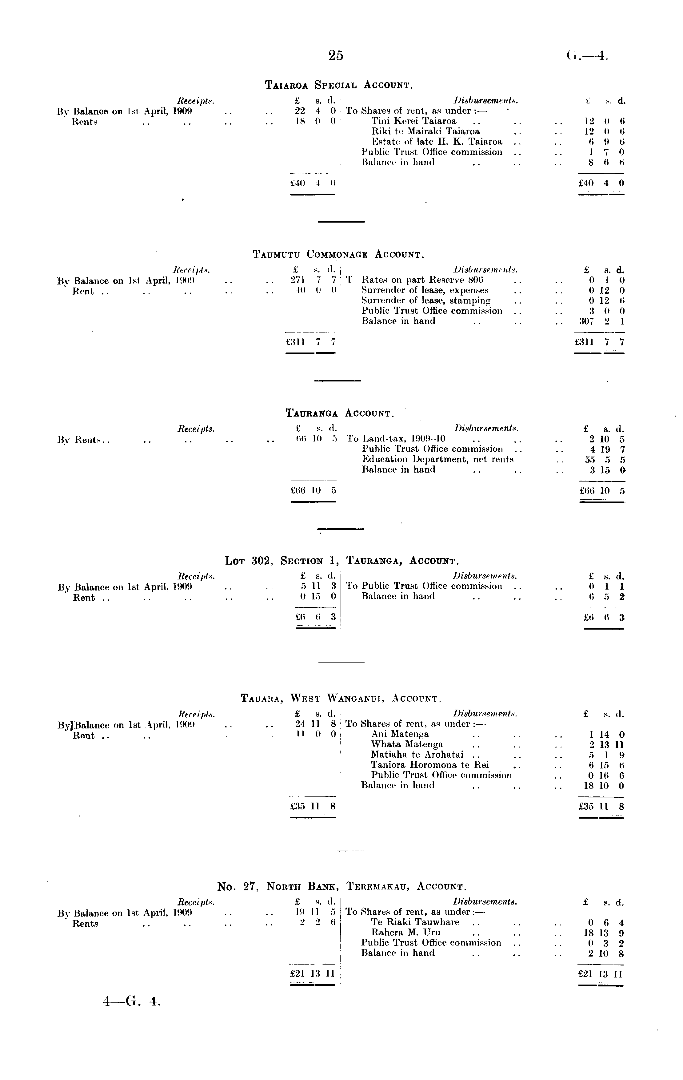 Taiaroa Special Account. Receipts. £ s. d. Disbursements. £ s. d. By Balance on Ist April, 1909 .. .. 22 4 0| To Shares of rent, as under :— Rents .. .. .. .. 18 0 0 Tini Kerei Taiaroa .. .. .. 12 0 6 Riki te Mairaki Taiaroa .. .. 12 0 6 Estate of late H. K. Taiaroa .. 6 9 6 Public Trust Office commission .. .. 17 0 Ralance in hand .. .. .. 8 0 0 £40 4 0 £40 4 0 Taumutu Commonage Account. Receipts. £ s. d. j Disbursements. £ s. d. By Balance on Ist April, I !K 19 .. .. 271 7 7 T Rates on part Reserve 806 .. .. 0 10 Rent .. .. .. . • .. 40 f) 0 Surrender of lease, expenses .. .. 012 0 Surrender of lease, stamping .. .. 012 6 Public Trust Office commission .. .. 3 0 0 Balance in hand .. .. .. 307 2 1 '.3 11 7 7 £311 7 7 Tauranga Account. Receipts. £ s. d. Disbursements. £ a. d. By Rents.. •• ■• •• ■• 60 10 5 To Land-tax, 1909-10 .. .. .. 2 10 5 Public Trust Office commission .. .. 4 19 7 Education Department, net rents . . 55 5 5 Balance in hand .. .. .. 3 15 O £00 10 5 £00 10 5 Lot 302, Section 1, Tauranga, Account. Receipts. £ s. d. Disbursements. £ s. d. By Balance on Ist April, 1909 .. 5 113 To Public Trust Office commission .. .. 0 11 Rent .. .. .. .. •. 0 15 0 Balance in hand .. .. .. 0 5 2 £0 0 3 £0 6 3 Tauaha, West Wanganui, Account. Receipt*. £ s. d. Disbursements. £ s. d. ByJßalance on Ist April, 1909 .. .. 24 11 8j To Shares of rent, as under : — Rent . - .. .110 0 Ani Matenga .. .. .. 114 0 Whata Matenga .. .. .. 2 13 11 Matiaha te Arohatai .. .. .. 5 19 Taniora Horomona te Rei .. .. 6 15 6 Public Trust Office commission .. 0 16 6 Balance in hand .. .. .. 18 10 0 £35 11 8 £35 11 8 No. 27, North Bank, Teremakau, Account. Receipts. £ s. d. Disbursements. £ s. d. By Balance on Ist April, 1909 .. .. 19 11 5 To Shares of rent, as under: — " Rents .. .. .. . ■ 2 2 6 Te Riaki Tauwhare .. .. .. 0 6 4 Rahera M. Uru .. .. .. 18 13 9 Public Trust Office commission .. .. 0 3 2 Balance in hand .. .. 2 10 8 £21 13 11 £21 13 11 4—G. 4.