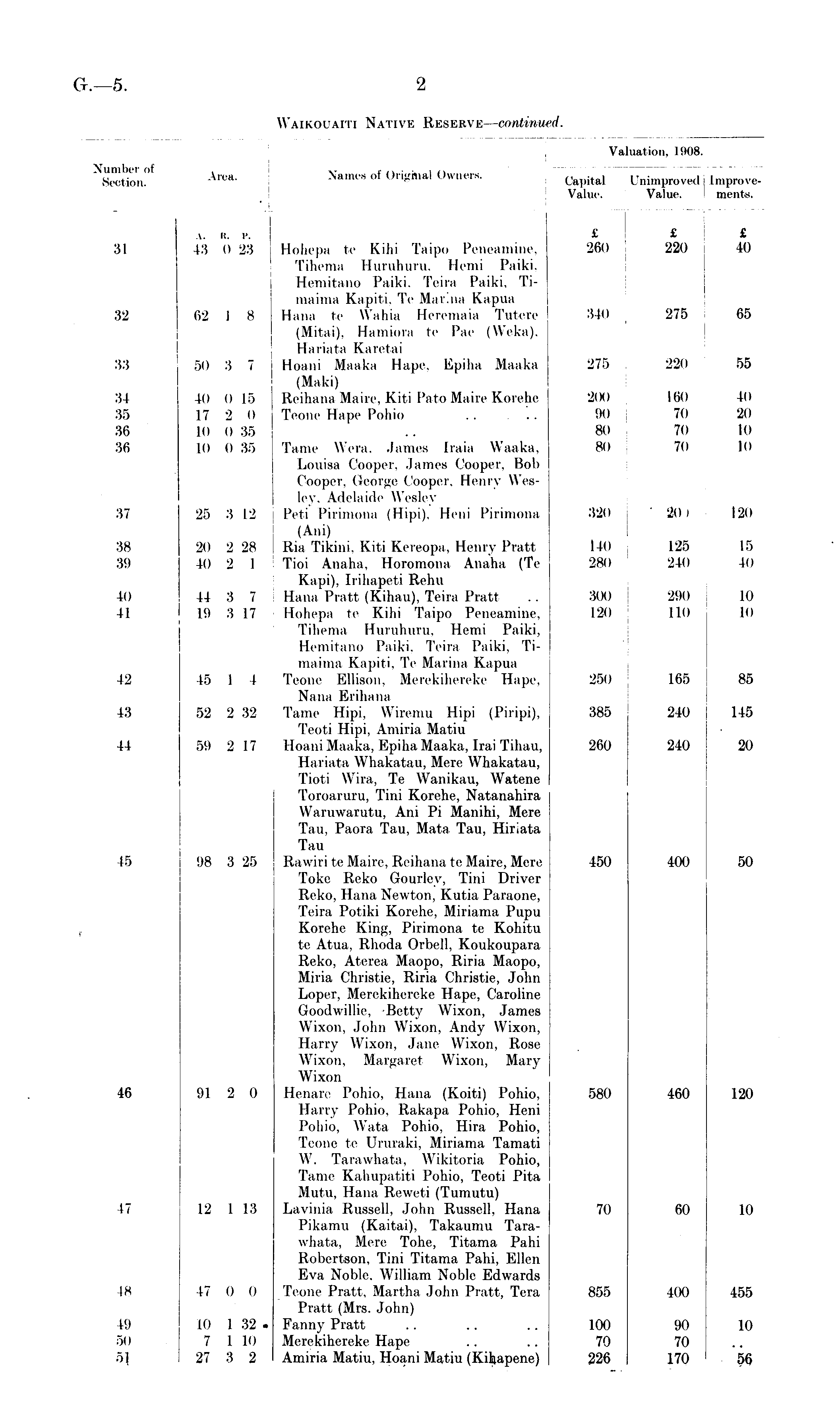 Valuation, 1908. dumber of Section. Area. \;l inrs ot < hiuilial t hvners. Capital Unimproved Improve Value. Value. ments. i £ £ £ 260 220 40 31 32 33 34 35 36 36 37 38 39 lo 41 42 13 II 45 46 4 7 48 in 50 :.i A. l<. I , . 43 0 23 C>2 I S 5< i :i 7 40 o 15 17 2 0 10 o 35 10 0 35 25 3 12 20 2 28 10 2 1 44 3 7 19 :; 17 45 1 I 52 2 32 59 2 17 98 3 25 91 2 0 12 1 13 47 0 o 10 1 32 7 1 10 27 3 2 i I i I i Hohepa if Kihi Taipo Peneamine, Tihema Huruhuru, Hemi Paiki, Hemitano Paiki. Teira Paiki, Timaima Kapiti. Te Marina Kapua liana te \\ahia Heremaia Tutere (Mitai), Hamiora te Pae (Weka), Hariata Karetai lloani Maaka Hape, Epiha Maaka (Maki) Reihana Maire, Kiti Pato Maire Korehe Teone Hape Pohio Tame Wera, .lames Iraia Waaka, Louisa Cooper, .lames Cooper. Bol) Cooper, George Cooper, Homy Wea ley, Adelaide Wesley I'eti Pirimona (Hipi). Ileni Pirimona (Ani) Ria Tikini. Kiti Kereopa, Henry Pratt Tioi Anaha, Horomonn Anaha (Te Kapi). Irihapeti Relui Hana Pratt (Kiliau). Teira Pratt Hohepa te Kihi Taipo Peneamine. Tihema Huruhuru. Hemi Paiki, Hemitano Paiki. Teira Paiki. Timaima Kapiti, Te Marina Kapua Teone Ellison, Merekihereke Hape, Nana Erihana Tame Hipi. Wireinu Hipi (Piripi), Teoti Hipi, Amiria Matiu Hoani Maaka, Epiha Maaka, Irai Tihau, Hariata Whakatau, Mere W'hakatau, Tioti Wira, Te Wanikau, Watene Toroaruru. Tini Korehe, Natanahira Waruwarutu, Ani Pi Manihi, Mere Tau, Paora Tau, Mata Tau, Hiriata Tau Rawiri te Maire. Reihana te Maire, Mere Toke Reko Gourlev, Tini Driver Eeko, Hana Newton, Kutia Paraone, Teira Potiki Korehe, Miriama Pupu Korehe King, Pirimona te Koliitu te Atua, Rlioda Orbell, Koukoupara Reko, Aterea Maopo, Riria Maopo, Miria Christie, Riria Christie, John Loper, Merekihereke Hape, Caroline Goodwillie. Hetty Wixon, James Wixon. John Wixon, Andy Wixon, Harry Wixon. Jane Wixon, Rose Wixon, Margaret Wixon, Mary Wixon Henare Pohio. liana (Koiti) Pohio, Harry Pohio, Rakapa Pohio, Heni Pohio, Wata Pohio, Hira Pohio, Teone te Ururaki, Miriama Tamati W. Tarawhata, Wikitoria Pohio, Tame Kahupatiti Pohio, Teoti Pita Mutu, Hana Reweti (Tumutu) Lavinia Russell, John Russell, Hana Pikamu (Kaitai). Takaumu Tarawhata. Mere Tohe, Titama Pahi Robertson, Tini Titama Pahi, Ellen Eva Noble. William Noble Edwards Teone Pratt, Martha John Pratt, Tera Pratt (Mrs. John) Fanny Pratt Merekihereke Hape Amiria Matiu, Hoani Matiu (Kihapene) ' ' V H •■ V' *-* 340 275 65 * I ■ *m* V^.* 275 220 55 200 Kin +(i 1)0 70 20 so 70 lo 80 70 LO 320 ' 2o i I2o 110 125 15 2S0 240 10 300 2'.)o 10 120 110 10 25o 165 85 385 240 145 260 240 20 85 145 20 15 98 3 25 450 400 50 580 46 91 2 0 460 120 IV 12 1 13 70 60 10 47 o o is 855 400 455 I'.i 50 10 7 27 1 32 . 1 10 3 2 100 70 226 90 70 170 10 56