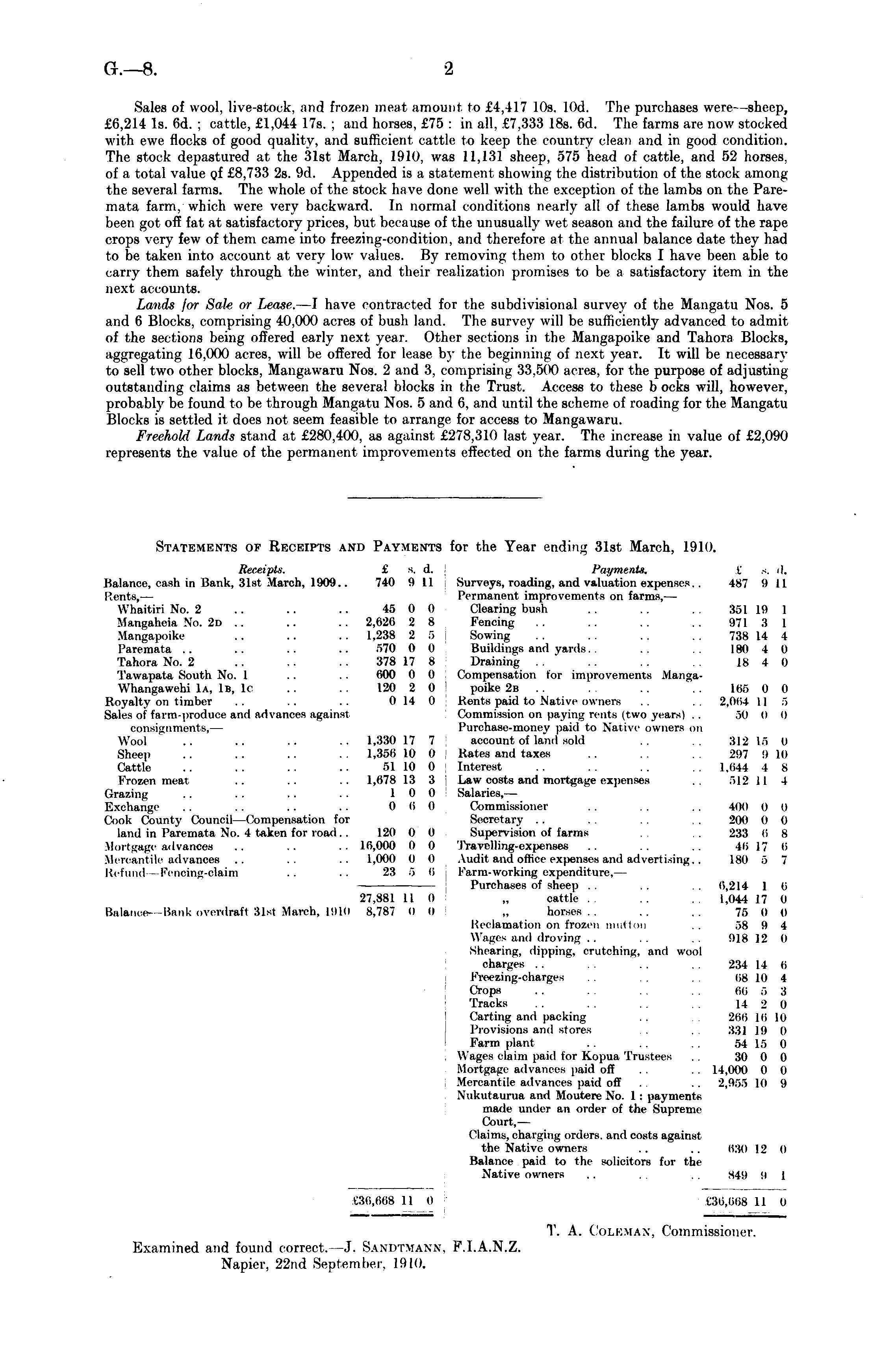Statements of Receipts and Payments for the Year ending 31st March, 1910. Receipts. £ s. d. Payments, t -. d. Balance, cash in Bank, 31st .March, 1909.. 740 911 Surveys, roadiiig. and valuation expenses.. 457 !l II Rents, — Permanent improvements on farms, — Whaitiri No. 2 .. .. .. 45 0 0 Clearing bush .. .. .. 361 lit 1 Mangaheia No. 2d .. .. .. 2,(i26 2 8 Fencing .. .. .. .. 971 3 1 Mangapoike .. .. .. 1,238 2 5 Sowing . . . . .. . . 738 14 4 Paremata .. .. .. .. 570 0 0 Buildings ami yards. .. .. 180 4 0 Tahora No. 2 .. .. .. 378 17 8 Draining ..' .. .. .. IN 4 0 Tawapata South No. 1 .. .. 600 0 0 Compensation for improvements AlangaWhangawehi lα, Iβ, lo . . . . 120 2 0 poike 2b .. . . .. . . 165 0 0 Royalty on timber .. .. .. 014 0 Kents paid to Native owners .. .. 2,0(i4 II 6 Sales of farm-produce and advances against Commission on paying rents (two yean) .. r>o o 0 consignments,— Purchase-in -v paid to Native owners on Wool .. .. .. .. 1,830 17 7 account of land sold .. .. :{I2 16 0 Sheep .. .. .. .. 1,350 10 () Rates and taxee .. .. .. 297 910 Cattle .. .. .. .. 51 10 0 Interest .. .. .. .. 1,644 4 S h'ln/.rn meat .. .. .. 1,078 IS 3 Law ooste and mortgage expenses .. r>l2 ii 4 Grazing .. .. .. .. 10 0 Salaries, — Exchange .. .. .. .. 0 0 0 Commissioner .. .. .. 4(1(1 II 0 Cook County Council —Compensation for Secretary . . . . . . . 200 (I (I land in l'aremata No. 4 taken for road.. 120 0 0 Supervision of farms . 233 Ii 8 Mortgage advances .. .. .. 10,000 o 0 Travelling-expenses .. .. .. 46 17 0 Mercantile advances .. .. .. 1,000 0 0 Audit and office expenses and advertising.. 180 6 7 Refund Fenoing-olaim .. .. 23 6 6 Farm-working expenditure,— ' Purchases of sheep . . .. . . 0,214 1 (i 27.5K1 II II „ cattle . . . . . 1,044 17 0 Balance- Bank overdraft 81st March. 1910 8,787 o o „ horses.. .. .. 75 «i o Reclamation on frozen mutton . . 58 9 4 Wages and droving .. .. .. 018 12 (i Shearing, dipping, crutching, and wool charges .. .. .. .. 234 14 6 IV esing-oharges .. .. . . 08 10 4 Crops .. . . .. 66 6 3 Tracks . . . . . . . . 14 l> (I Carting and packing . . . . 20li 10 1(1 Provisions and stores . . . 331 hi o Farm plant .. .. .. :>4 15 0 Wages claim paid Eor ECopua Trustees .. 30 0 0 Mortgage advanoes paid off .. .. 14.000 0 0 Mercantile advances paid off .. .. 2,!). Vi in it N'uUutnimia and Moutere No. 1: payn made under an order of the Supreme Court. I laitns, oharging orders, and costs against the Native owners .. .. li:)() 12 0 Balance paid to the solicitors for the Native owners . . . . . . S4!l !i I £36,668 11 Of £36,868 11 0 T. A. Coleman, Commissioner. Examined and found correct. — J. Sandtmann, K.I.A.N.Z. Napier, 22nd September, 1910.
