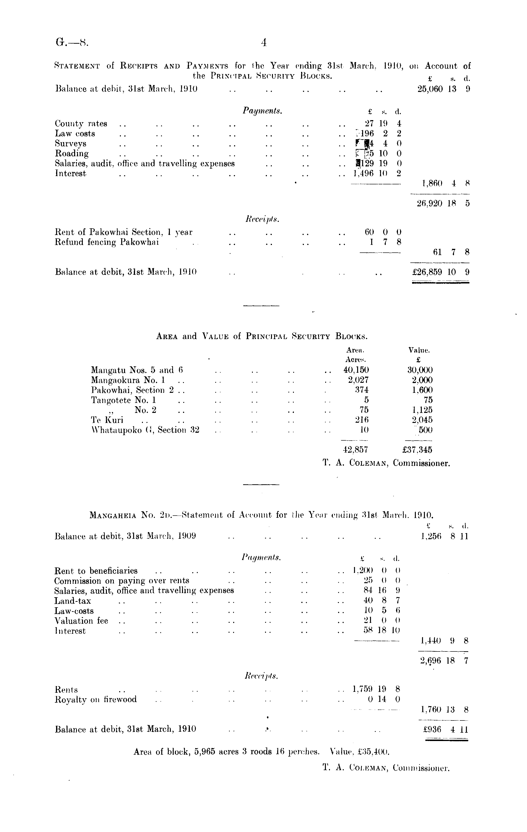 Mangahela No. 2d. Statement of Account for the Year ending 31st March, 1910. £ s. (I. Balance at debit, 31st March, 1909 .. .. .. .. .. J. 256 8 11 Payments. £ s. d. Rent to beneficiaries .. .. .. .. .. .. 1,200 0 0 Commission on paying over rents .. .. .. .. 25 0 0 Salaries, audit, office and travelling expenses .. .. .. 84 l(i !i Land-tax .. .. .. .. ■ • .. .. 40 8 7 Law-costs .. .. • ■ • • • • • • •. 10 5 6 Valuation fee .. .. .. .. .. .. .. 21 0 0 ! merest .. .. .. .. .. .. .. 58 18 10 1,440 9 8 2,696 18 7 Receipts. Rents .. ■ ■ .. .. • • •• 1,759 19 8 Royally on firewood .. .. .. ■• .. .. 014 0 1,760 13 8 Balance at debit, 31st March, 1910 . . .«. . . . . . . £936 411 Area of block, 5,965 acres 3 roods 16 perches. Value, £35,400. T. A. Coleman, Commissioner.