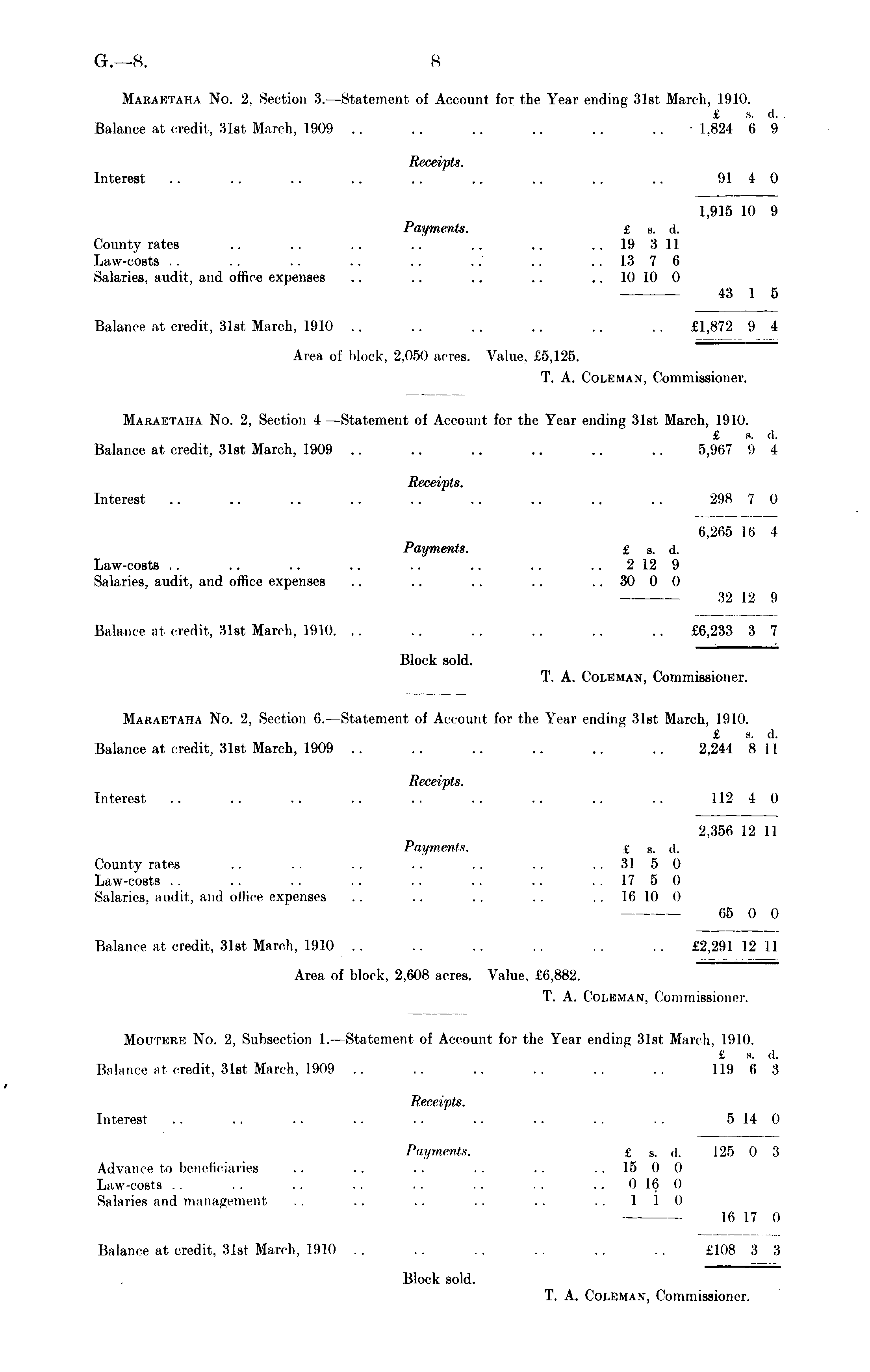 Maraetaha No. 2, Section 4—Statement of Account for the Year ending 31st March, 1910. £ s. d. Balance at credit, 31st March, 1909 .. .. .. .. .. .. 5,967 9 4 Receipts. Interest .. .. .. .. .. .. .. .. .. 298 7 0 6,265 16 4 Payments. £ s . d. Law-costs . . .. .. .. .. .. .. 2 12 9 Salaries, audit, and office expenses .. .. .. .. .. 30 0 0 32 12 9 Balance at credit, Slat March, 1910, .. .. .. .. .. .. £6,233 3 7 Block sold. T. A. Coleman, Commissioner.