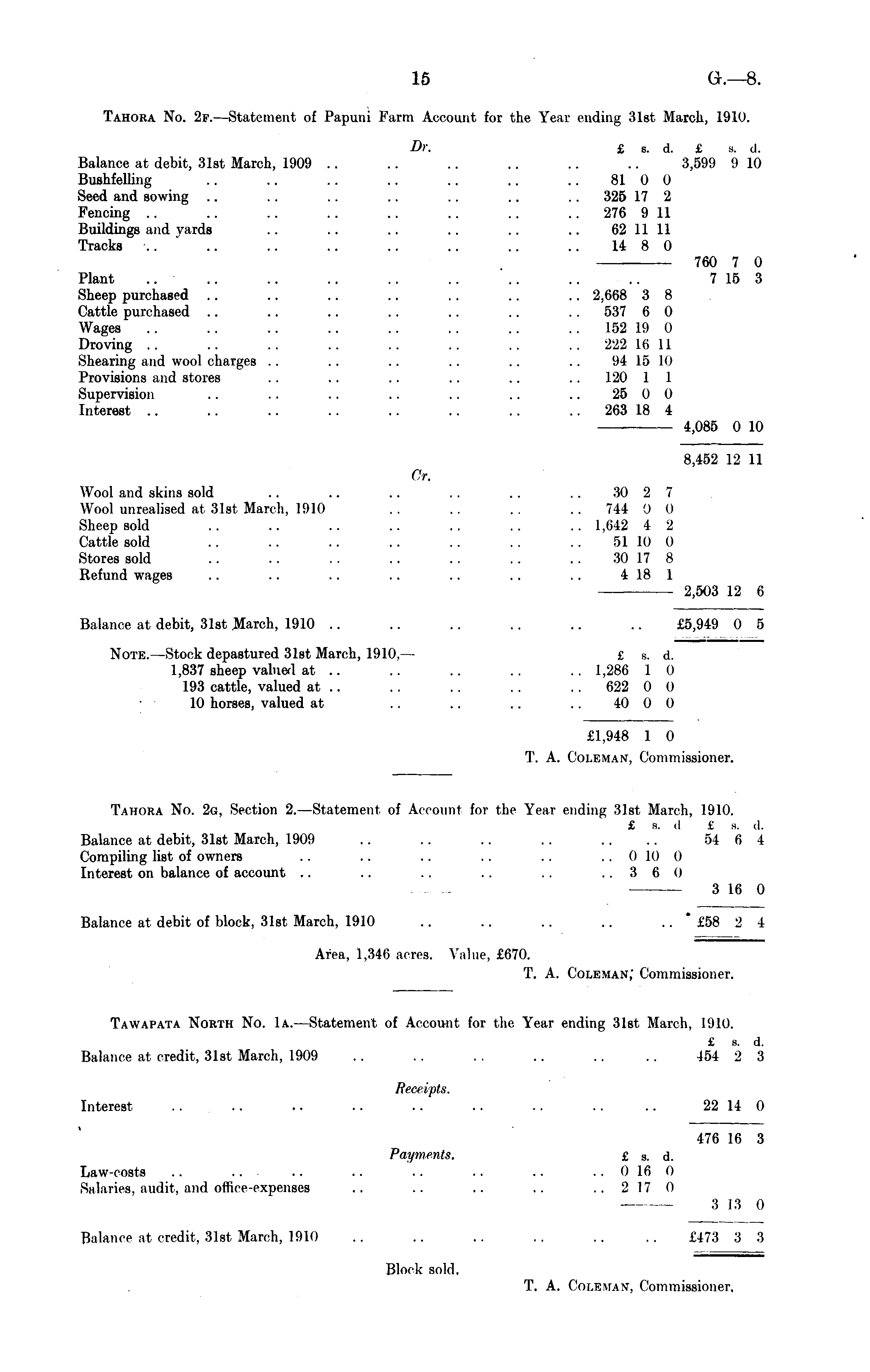 Tawapata North No. Iα. —Statement of Account for the Year ending 31st March, 1910. £ s. d. Balance at credit, 31st March, 1909 .. .. .. .. .. .. 454 2 3 Receipts, Interest .. .. .. .. .. .. .. .. .. 22 14 0 476 16 3 Payments. £ s. d. Law-costs . . .. .. .. . . .. .. ..0160 Salaries, audit, and office-expenses .. .. .. .. .. 2 17 0 3 13 0 Balance at credit, 31st March, 1910 .. .. .. .. .. .. £473 3 3 Block sold. T. A. Coleman, Commissioner.