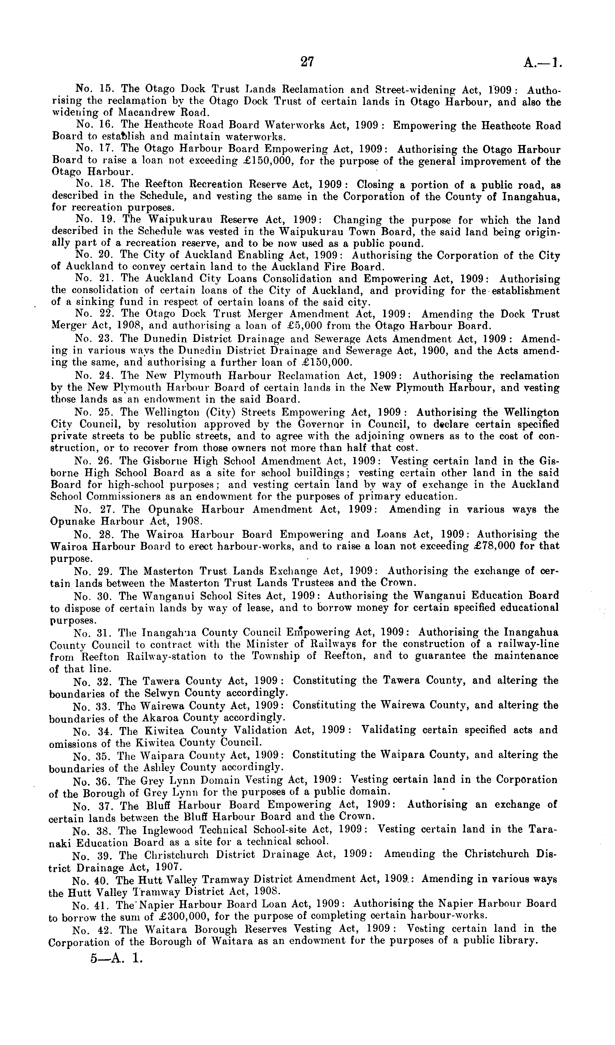No. 15. The Otago Dock Trust Lands Reclamation and Street-widening Act, 1909 : Authorising the reclamation by the Otago Dock Trust of certain lands in Otago Harbour, and also the widening of Macandrew Road. No. 16. The Heathcote Road Board Waterworks Act, 1909 : Empowering the Heathcote Road Board to establish and maintain waterworks. No. 17. The Otago Harbour Board Empowering Act, 1909: Authorising the Otago Harbour Board to raise a loan not exceeding £150,000, for the purpose of the general improvement of the Otago Harbour. No. 18. The Reefton Recreation Reserve Act, 1909 : Closing a portion of a public road, as described in the Schedule, and vesting the same in the Corporation of the County of Inangahua, for recreation purposes. No. 19. The Waipukurau Reserve Act, 1909: Changing the purpose for which the land described in the Schedule was vested in the Waipukurau Town Board, the said land being originally part of a recreation reserve, and to be now used as a public pound. No. 20. The City of Auckland Enabling Act, 1909: Authorising the Corporation of the City of Auckland to convey certain land to the Auckland Fire Board. No. 21. The Auckland City Loans Consolidation and Empowering Act, 1909: Authorising the consolidation of certain loans of the City of Auckland, and providing for the establishment of a sinking fund in respect of certain loans of the said city. No. 22. The Otago Dock Trust Merger Amendment Act, 1909: Amending the Dock Trust Merger Act, 1908, and authorising a loan of £5,000 from the Otago Harbour Board. No. 23. The Dunedin District Drainage and Sewerage Acts Amendment Act, 1909: Amending in various ways the Dunedin District Drainage and Sewerage Act, 1900, and the Acts amending the same, and authorising a further loan of £150,000. No. 24. The New Plymouth Harbour Reclamation Act, 1909: Authorising the reclamation by the New Plymouth Harbour Board of certain lands in the New Plymouth Harbour, and vesting those lands as an endowment in the said Board. No. 25. The Wellington (City) Streets Empowering Act, 1909: Authorising the Wellington City Council, by resolution approved by the Governor in Council, to declare certain specified private streets to be public streets, and to agree with the adjoining owners as to the cost of construction, or to recover from those owners not more than half that cost. No. 26. The Gisborne High School Amendment Act, 1909: Vesting certain land in the Gisborne High School Board as a site for school buildings ; vesting certain other land in the said Board for high-school purposes; and vesting certain land by way of exchange in the Auckland School Commissioners as an endowment for the purposes of primary education. No. 27. The Opunake Harbour Amendment Act, 1909: Amending in various ways the Opunake Harbour Act, 1908. No. 28. The Wairoa Harbour Board Empowering and Loans Act, 1909: Authorising the Wairoa Harbour Board to erect harbour-works, and to raise a loan not exceeding £78,000 for that purpose. No. 29. The Masterton Trust Lands Exchange Act, 1909: Authorising the exchange of certain lands between the Masterton Trust Lands Trustees and the Crown. No. 30. The Wanganui School Sites Act, 1909: Authorising the Wanganui Education Board to dispose of certain lands by way of lease, and to borrow money for certain specified educational purposes. No. 31. The Inangahua County Council Empowering Act, 1909: Authorising the Inangahua County Council to contract with the Minister of Railways for the construction of a railway-line from Reefton Railway-station to the Township of Reefton, and to guarantee the maintenance of that line. No. 32. The Tawera County Act, 1909: Constituting the Tawera County, and altering the boundaries of the Selwyn County accordingly. No. 33. The Wairewa County Act, 1909: Constituting the Wairewa County, and altering the boundaries of the Akaroa County accordingly. No. 34. The Kiwitea County Validation Act, 1909 : Validating certain specified acts and omissions of the Kiwitea County Council. No. 35. The Waipara County Act, 1909: Constituting the Waipara County, and altering the boundaries of the Ashley County accordingly. No. 36. The Grey Lynn Domain Vesting Act, 1909 : Vesting certain land in the Corporation of the Borough of Grey Lynn for the purposes of a public domain. No. 37. The Bluff Harbour Board Empowering Act, 1909: Authorising an exchange of certain lands between the Bluff Harbour Board and the Crown. No. 38. The Inglewood Technical School-site Act, 1909: Vesting certain land in the Taranaki Education Board as a site for a technical school. No. 39. The Christchurch District Drainage Act, 1909: Amending the Christchurch District Drainage Act, 1907. No. 40. The Hutt Valley Tramway District Amendment Act, 1909 : Amending in various ways the Hutt Valley Tramway District Act, 1908. No. 41. The' Napier Harbour Board Loan Act, 1909: Authorising the Napier Harbour Board to borrow the sum of £300,000, for the purpose of completing certain harbour-works. No. 42. The Waitara Borough Reserves Vesting Act, 1909: Vesting certain land in the Corporation of the Borough of Waitara as an endowment for the purposes of a public library.