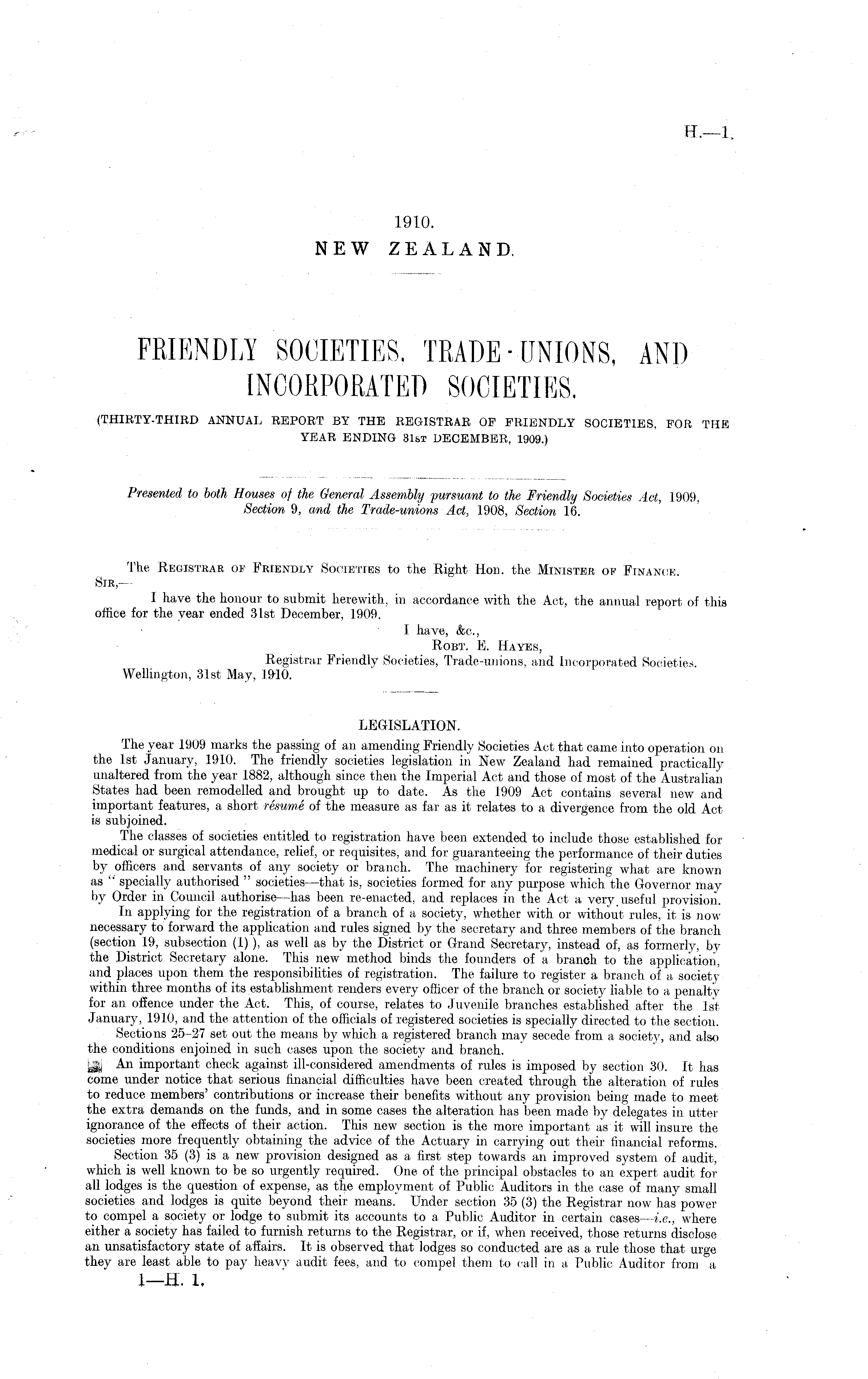 Presented to both Houses of the General Assembly pursuant to the Friendly Societies Act, 1909, Section 9, and the Trade-unions Act, 1908, Section 16. The Registrar of Friendly Societies to the Right Hon. the Minister of Finance. Sir, — I have the honour to submit herewith, in accordance with the Act, the annual report of this office for the year ended 31st December, 1909. ' ■ I have, &c, Robt. E. Hayes, Registrar Friendly Societies, Trade-unions, and Incorporated Societies Wellington, 31st May, 19-10.