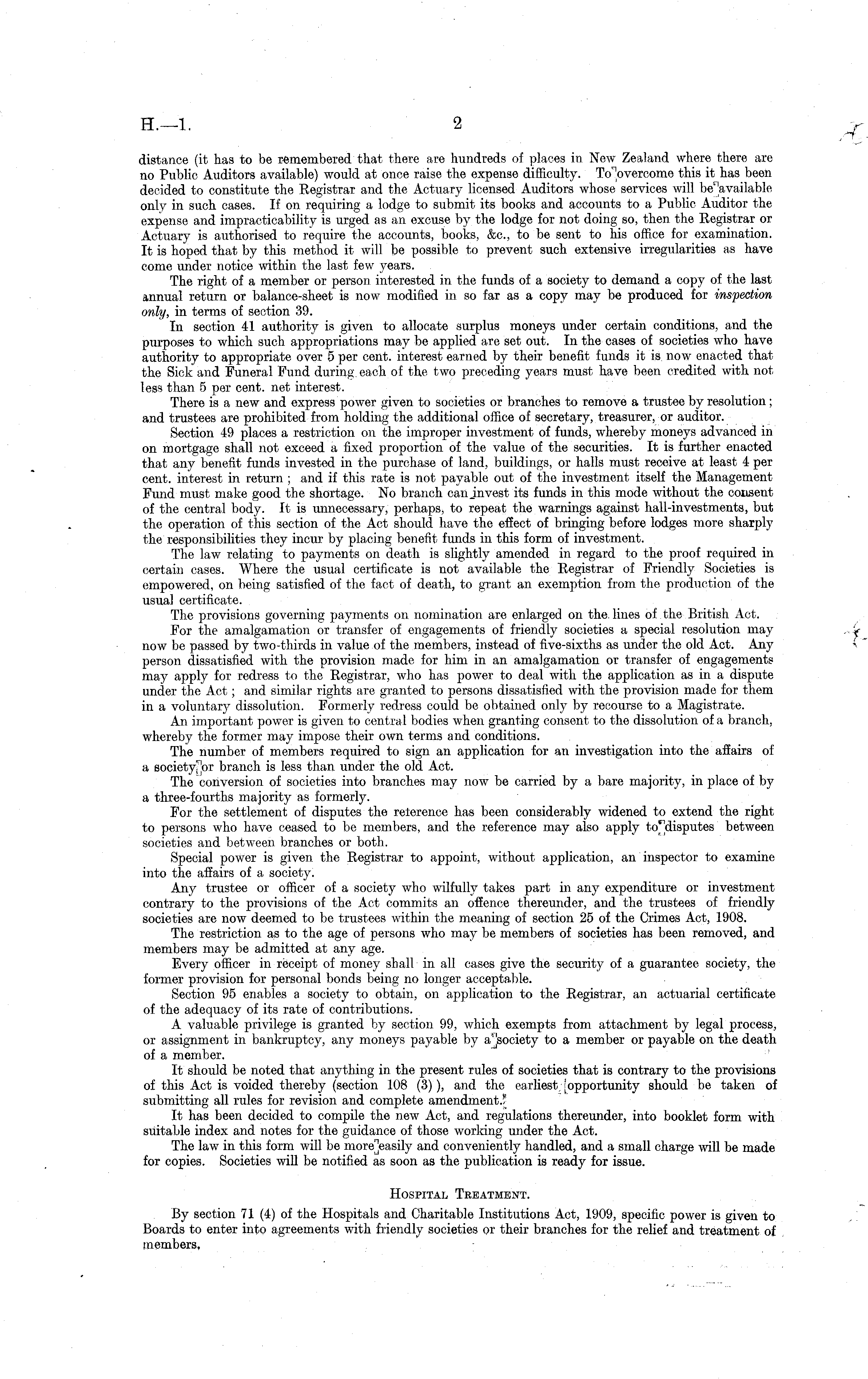 distance (it has to be remembered that there are hundreds of places in New Zealand where there are no Public Auditors available) would at once raise the expense difficulty. To n overcome this it has been decided to constitute the Kegistrar and the Actuary licensed Auditors whose services will be' Available only in such cases. If on requiring a lodge to submit its books and accounts to a Public Auditor the expense and impracticability is urged as an excuse by the lodge for not doing so, then the Registrar or Actuary is authorised to require the accounts, books, &c, to be sent to his office for examination. It is hoped that by this method it will be possible to prevent such extensive irregularities as have come under notice within the last few years. The right of a member or person interested in the funds of a society to demand a copy of the last annual return or balance-sheet is now modified in so far as a copy may be produced for inspection only, in terms of section 39. In section 41 authority is given to allocate surplus moneys under certain conditions, and the purposes to which such appropriations may be applied are set out. In the cases of societies who have authority to appropriate over 5 per cent, interest earned by their benefit funds it is now enacted that the Sick and Funeral Fund during each of the two preceding years must have been credited with not less than 5 per cent, net interest. There is a new and express power given to societies or branches to remove a trustee by resolution; and trustees are prohibited from holding the additional office of secretary, treasurer, or auditor. Section 49 places a restriction on the improper investment of funds, whereby moneys advanced in on mortgage shall not exceed a fixed proportion of the value of the securities. It is further enacted that any benefit funds invested in the purchase of land, buildings, or halls must receive at least 4 per cent, interest in return ; and if this rate is not payable out of the investment itself the Management Fund must make good the shortage. No branch can invest its funds in this mode without the consent of the central body. It is unnecessary, perhaps, to repeat the warnings against hall-investments, but the operation of this section of the Act should have the effect of bringing before lodges more sharply the responsibilities they incur by placing benefit funds in this form of investment. The law relating to payments on death is slightly amended in regard to the proof required in certain cases. Where the usual certificate is not available the Registrar of Friendly Societies is empowered, on being satisfied of the fact of death, to grant an exemption from the production of the usual certificate. The provisions governing payments on nomination are enlarged on the. lines of the British Act. For the amalgamation or transfer of engagements of friendly societies a special resolution may now be passed by two-thirds in value of the members, instead of five-sixths as under the old Act. Any person dissatisfied with the provision made for him in an amalgamation or transfer of engagements may apply for redress to the Registrar, who has power to deal with the application as in a dispute under the Act; and similar rights are granted to persons dissatisfied with the provision made for them in a voluntary dissolution. Formerly redress could be obtained only by recourse to a Magistrate. An important power is given to central bodies when granting consent to the dissolution of a branch, whereby the former may impose their own terms and conditions. The number of members required to sign an application for an investigation into the affairs of a branch is less than under the old Act. The conversion of societies into branches may now be carried by a bare majority, in place of by a three-fourths majority as formerly. For the settlement of disputes the reference has been considerably widened to extend the right to persons who have ceased to be members, and the reference may also apply between societies and between branches or both. Special power is given the Registrar to appoint, without application, an inspector to examine into the affairs of a society. Any trustee or officer of a society who wilfully takes part in any expenditure or investment contrary to the provisions of the Act commits an offence thereunder, and the trustees of friendly societies are now deemed to be trustees within the meaning of section 25 of the Crimes Act, 1908. The restriction as to the age of persons who may be members of societies has been removed, and members may be admitted at any age. Every officer in receipt of money shall in all cases give the security of a guarantee society, the former provision for personal bonds being no longer acceptable. Section 95 enables a society to obtain, on application to the Registrar, an actuarial certificate of the adequacy of its rate of contributions. A valuable privilege is granted by section 99, which exempts from attachment by legal process, or assignment in bankruptcy, any moneys payable by to a member or payable on the death of a member. It should be noted that anything in the present rules of societies that is contrary to the provisions of this Act is voided thereby (section 108 (3)), and the earliest, [opportunity should be taken of submitting all rules for revision and complete amendment.? It has been decided to compile the new Act, and regulations thereunder, into booklet form with suitable index and notes for the guidance of those working under the Act. The law in this form will be more]easily and conveniently handled, and a small charge will be made for copies. Societies will be notified as soon as the publication is ready for issue. Hospital Treatment. By section 71 (4) of the Hospitals and Charitable Institutions Act, 1909, specific power is given to Boards to enter into agreements with friendly societies or their branches for the relief and treatment of members,