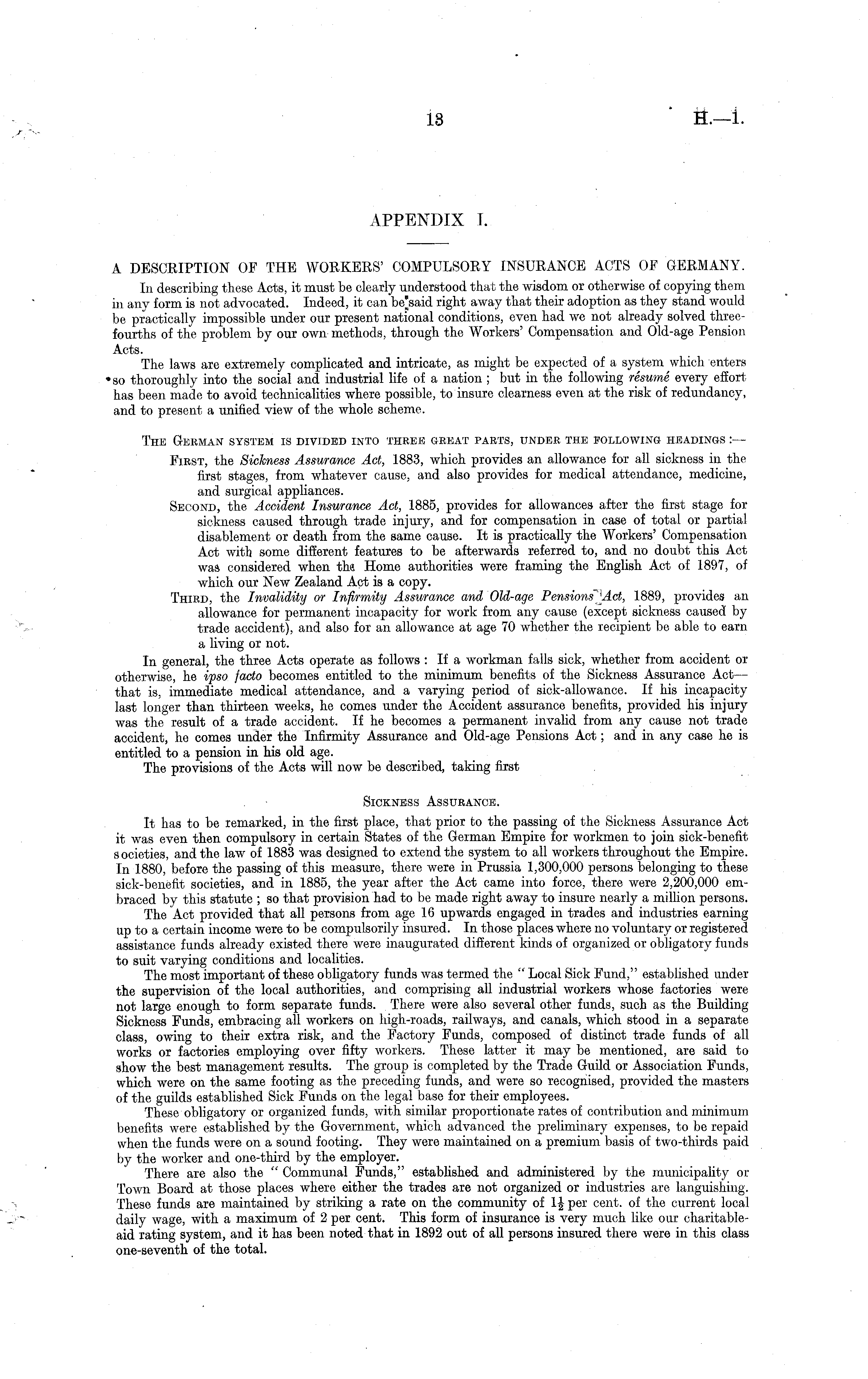 A DESCRIPTION OF THE WORKERS' COMPULSORY INSURANCE ACTS OF GERMANY. In describing these Acts, it must be clearly understood that the wisdom or otherwise of copying them in any form is not advocated. Indeed, it can be'said right away that their adoption as they stand would be practically impossible under our present national conditions, even had we not already solved threefourths of the problem by our own methods, through the Workers' Compensation and Old-age Pension Acts. The laws are extremely complicated and intricate, as might be expected of a system which enters ■so thoroughly into the social and industrial life of a nation ; but in the following resume every effort has been made to avoid technicalities where possible, to insure clearness even at the risk of redundancy, and to present a unified view of the whole scheme. The German system is divided into thbeu great parts, under the following headings : — First, the Sichness Assurance Act, 1883, which provides an allowance for all sickness in the first stages, from whatever cause, and also provides for medical attendance, medicine, and surgical appliances. Second, the Accident Insurance Act, 1885, provides for allowances after the first stage for sickness caused through trade injury, and for compensation in case of total or partial disablement or death from the same cause. It is practically the Workers' Compensation Act with some different features to be afterwards referred to, and no doubt this Act wak considered when tha Home authorities were framing the English Act of 1897, of which our New Zealand Act is a copy. Third, the Invalidity or Infirmity Assurance and Old-age 1889, provides an allowance for permanent incapacity for work from any cause (except sickness caused by trade accident), and also for an allowance at age 70 whether the recipient be able to earn a living or not. In general, the three Acts operate as follows: If a workman falls sick, whether from accident or otherwise, he ipso facto becomes entitled to the minimum benefits of the Sickness Assurance Act — that is, immediate medical attendance, and a varying period of sick-allowance. If his incapacity last longer than thirteen weeks, he comes under the Accident assurance benefits, provided his injury was the result of a trade accident. If he becomes a permanent invalid from any cause not trade accident, he comes under the Infirmity Assurance and Old-age Pensions Act; and in any case he is entitled to a pension in his old age. The provisions of the Acts will now be described, taking first Sickness Assurance. It has to be remarked, in the first place, that prior to the passing of the Sickness Assurance Act it was even then compulsory in certain States of the German Empire for workmen to join sick-benefit societies, and the law of 1883 was designed to extend the system to all workers throughout the Empire. In 1880, before the passing of this measure, there were in Prussia 1,300,000 persons belonging to these sick-benefit societies, and in 1885, the year after the Act came into force, there were 2,200,000 embraced by this statute ; so that provision had to be made right away to insure nearly a million persons. The Act provided that all persons from age 16 upwards engaged in trades and industries earning up to a certain income were to be compulsorily insured. In those places where no voluntary or registered assistance funds already existed there were inaugurated different kinds of organized or obligatory funds to suit varying conditions and localities. The most important of these obligatory funds was termed the " Local Sick Fund," established under the supervision of the local authorities, and comprising all industrial workers whose factories were not large enough to form separate funds. There were also several other funds, such as the Building Sickness Funds, embracing all workers on high-roads, railways, and canals, which stood in a separate class, owing to their extra risk, and the Factory Funds, composed of distinct trade funds of all works or factories employing over fifty workers. These latter it may be mentioned, are said to show the best management results. The group is completed by the Trade Guild or Association Funds, which were on the same footing as the preceding funds, and were so recognised, provided the masters of the guilds established Sick Funds on the legal base for their employees. These obligatory or organized funds, with similar proportionate rates of contribution and minimum benefits were established by the Government, which advanced the preliminary expenses, to be repaid when the funds were on a sound footing. They were maintained on a premium basis of two-thirds paid by the worker and one-third by the employer. There are also the " Communal Funds," established and administered by the municipality or Town Board at those places where either the trades are not organized or industries are languishing. These funds are maintained by striking a rate on the community of 1|- per cent, of the current local daily wage, with a maximum of 2 per cent. This form of insurance is very much like our charitableaid rating system, and it has been noted that in 1892 out of all persons insured there were in this class one-seventh of the total.