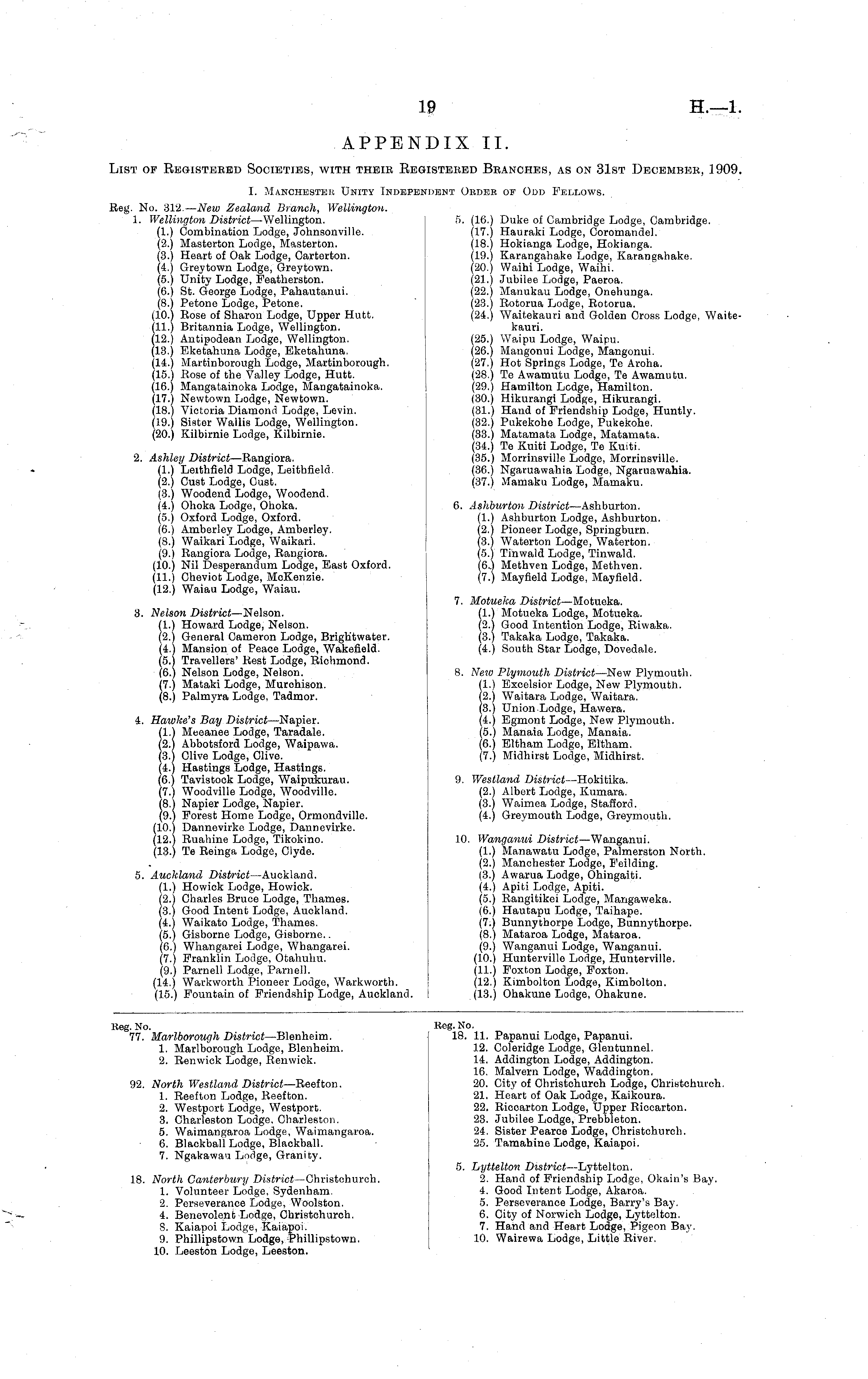 APPENDIX 11. List of Registered Societies, with theih Registered Beanches, as on 31st December, 1909. I. Manchester Unity Independent Oeder of Odd Pillows.
