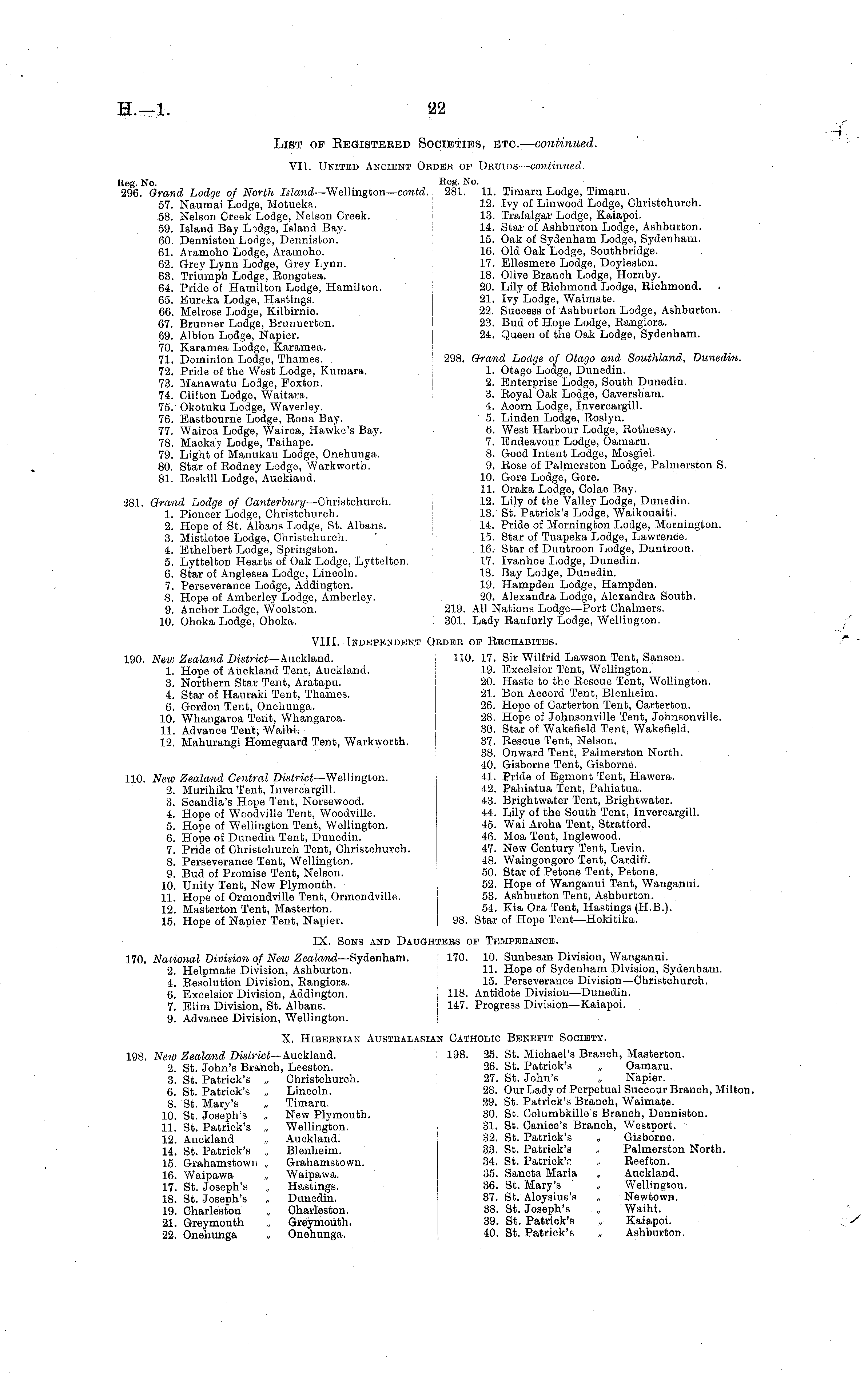 List of Kegistebed Societies, etc. — continued. VII. United Ancient Obdek of Druids — continued. Keg. No. Keg. No. 296. Grand Lodge of North Island— Wellington— contd. J 281. 11. Timaru Lodge, Timaru. 57. Naumai Lodge, Motueka. 12. Ivy of Linwood Lodge, Ghristehuroh. 58. Nelson Creek Lodge, Nelson Greek. 13. Trafalgar Lodge, Kaiapoi. 59. Island Bay Island Bay. 14. Star of Ashburton Lodge, Ashburton. 60. Denniston Lodge, Denniston. 15. Oak of Sydenham Lodge, Sydenham. 61. Aramoho Lodge, Aramoho. 16. Old Oak Lodge, Southbridge. 62. Grey Lynn Lodge, Grey Lynn. 17. BUesmere Lodge, Doyleston. 63. Triumph Lodge, Rongotea. 18, Olive Branch Lodge, Hornby. 64. Pride of Hamilton Lodge, Hamilton. 20. Lily o£ Richmond Lodge, Richmond. 65. Eureka Lodge, Hastings. 21. Ivy Lodge, Waimate. 66. Melrose Lodge, Kilbirnie. 22. Sucoess of Ashburton Lodge, Ashburton. 67. Brunner Lodge, Brunnerton. 23. Bud of Hope Lodge, Rangiora. 69. Albion Lodge, Napier. 24. Queen of the Oak Lodge, Sydenham. 70. Karamea Lodge, Karamea. 71. Dominion Lodge, Thames. ' 298. Grand Lodge of Otago and Southland, Dunedin. 72. Pride of the West Lodge, Kumara. 1. Otago Lodge, Dunedin. 73. Manawatu Lodge, Poxton. 2. Enterprise Lodge, South Dunedin. 74. Clifton Lodge, Waitara. 3. Royal Oak Lodge, Gaversham. 75. Okotuku Lodge, Waverley. 4. Aoorn Lodge, Invercargill. 76. Eastbourne Lodge, Rona Bay. 5. Linden Lodge, Roslyn. 77. Wairoa Lodge, Wairoa, Hawke's Bay. 6. West Harbour Lodge, Rothesay. 78. Mackay Lodge, Taihape. 7. Endeavour Lodge, Oamaru. 79. Light of Manukau Lodge, Onehunga. 8. Good Intent Lodge, Mosgiel. 80. Star of Rodney Lodge, Warkwortb. 9. Rose of Palmerston Lodge, Palmerston S. 81. Roskill Lodge, Auckland. 10. Gore Lodge, Gore. 11. Oraka Lodge, Colac Bay. 281. Grand Lodge of Canterbury —Christchurch. 12. Lily of the Valley Lodge, Dunedin. 1. Pioneer Lodge, Christchurch. 13. St. Patrick's Lodge, Waikouaiti. 2. Hope of St. Albans Lodge, St. Albans. 14. Pride of Mornington Lodge, Mornington. 3. Mistletoe Lodge, Christchurch. 15. Star of Tuapeka Lodge, Lawrence. 4. Ethelbert Lodge, Springston. 16. Star of Duntroon Lodge, Duntroon. 5. Lyttelton Hearts of Oak Lodge, Lyttelton. 17. Ivanhoe Lodge, Dunedin. 6. Star of Anglesea Lodge, Lincoln. 18. Bay Lodge, Dunedin. 7. Perseverance Lodge, Aldington. 19. Hampden Lodge, Hampden. 8. Hope of Amberley Lodge, Amberley. 20. Alexandra Lodge, Alexandra South. 9. Anchor Lodge, Woolston. 219. All Nations Lodge—Port Chalmers. 10. Ohoka Lodge, Ohoka. I 301. Lady Ranfurly Lodge, Wellington. VIII. Independent Obdeb of Rbchabites. 190. New Zealand District —Auckland. 110. 17. Sir Wilfrid Lawson Tent, Sanson. 1. Hope of Auckland Tent, Auckland. 19. Excelsior Tent, Wellington. 3. Northern Star Tent, Aratapu. 20. Haste to the Rescue Tent, Wellington. 4. Star of Hauraki Tent, Thames. 21. Bon Accord Tent, Blenheim. 6. Gordon Tent, Onehunga. 26. Hope of Oarterton Tent, Carterton. 10. Whangaroa Tent, Whangaroa. 28. Hope of Johnsonville Tent, Johnsonville. 11. Advance Tent, Waihi. 30. Star of Wakefield Tent, Wakefield. 12. Mahurangi Homeguara Tent, Warkworth. 37. Rescue Tent, Nelson. 38. Onward Tent, Palmerston North. 40. Gisborne Tent, Gisborne. 110. New Zealand Central District— Wellington. 41. Pride of Egmont Tent, Hawera. 2. Murihiku Tent, Invercargill. 42. Pahiatua Tent, Pahiatua. 3. Scandia's Hope Tent, Norsewood. 43. Brightwater Tent, Brightwater. 4. Hope of Woodville Tent, Woodville. 44. Lily of the South Tent, Invercargill. 5. Hope of Wellington Tent, Wellington. 45. Wai Aroha Tent, Stratford. 6. Hope of Dunedin Tent, Dunedin. 46. Moa Tent, Inglewood. 7. Pride of Ghristchurch Tent, Christchurch. 47. New Century Tent, Levin. 8. Perseverance Tent, Wellington. 48. Waingongoro Tent, Cardiff. 9. Bud of Promise Tent, Nelson. 50. Star of Petone Tent, Petone. 10. Unity Tent, New Plymouth. 52. Hope of Wanganui Tent, Wanganui. 11. Hope of Ormondville Tent, Ormondville. 53. Ashburton Tent, Ashburton. 12. Masterton Tent, Masterton. 54. Kia Ora Tent, Hastings (H. 8.). 15. Hope of Napier Tent, Napier. 98. Star of Hope Tent—Hokitika. IX. Sons and Daughters of Temperance. 170. National Division of New Zealand—Sydenh&m. 170. 10. Sunbeam Division, Wanganui. 2. Helpmate Division, Ashburton. 11. Hope of Sydenham Division, Sydenham. 4. Resolution Division, Rangiora. 15. Perseverance Division—Ghristchurch. 6. Excelsior Division, Addington. j 118. Antidote Division—Dunedin. 7. Elim Division, St. Albans. j 147. Progress Division—Kaiapoi. 9. Advance Division, Wellington. X. Hibebnian Australasian Catholic Benefit Society. 198. New Zealand District— Auckland. 198. 25. St. Michael's Branch, Masterton. 2. St. John's Branch, Leeston. 26. St. Patrick's „ Oamaru. 3. St. Patrick's „ Ghristchurch. 27. St. John's „ Napier. 6. St. Patrick's „ Lincoln. 28. Our Lady of Perpetual Succour Branch, Milton 8. St. Mary's „ Timaru. 29. St. Patrick's Branch, Waimate. 10. St. Joseph's „ New Plymouth. 30. St. Columbkilles Branch, Denniston. 11. St. Patrick's „ Wellington. 31. St. Canice's Branch, Westport. 12. Auckland „ Auckland. 32. St. Patrick's „ Gisborne. 14. St. Patrick's „ Blenheim. 3,3. St. Patrick's „ Palmerston North. 15. Grahamstown „ Grahamstown. 34. St. Patrick'; , „ Reefton. 16. Waipawa „ Waipawa. 35. Sancta Maria „ Auckland. 17. St. Joseph's „ Hastings. 36. St. Mary's „ Wellington. 18. St. Joseph's „ Dunedin. 37. St. Aloysius's „ Newtown. 19. Charleston „ Charleston. 38. St. Joseph's „ Waihi. 21. Greymouth „ Greymouth. 39. St. Patrick's „ Kaiapoi. 22. Onehunga „ Onehunga. 40. St. Patrick's „ Ashburton.