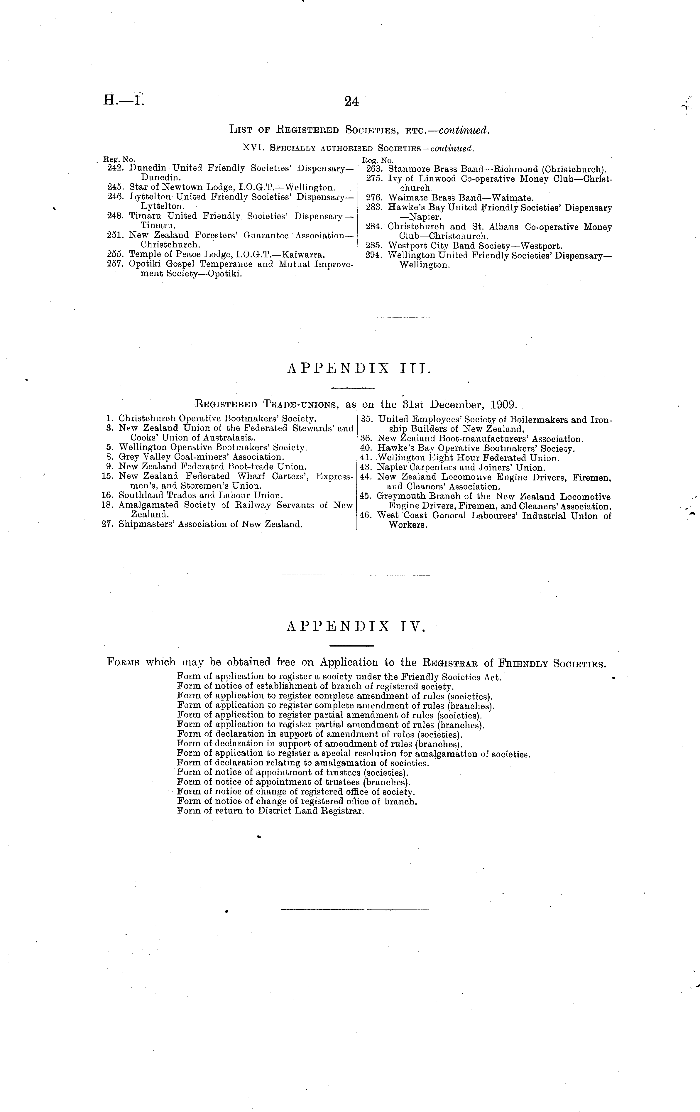 Forms which may be obtained free on Application to the Registrab of Friendly Societies. Form of application to register a society under the Friendly Societies Act. Form of notice of establishment of branch of registered society. Form of application to register complete amendment of rules (societies). Form of application to register complete amendment of rules (branches). Form of application to register partial amendment of rules (societies). Form of application to register partial amendment of rules (branches). Form of declaration in support of amendment of rules (societies). Form of declaration in support of amendment of rules (branches). Form of application to register a special resolution for amalgamation of societies. Form of declaration relating to amalgamation of sooieties. Form of notice of appointment of trustees (societies). Form of notice of appointment of trustees (branches). Form of notice of change of registered office of society. Form of notice of change of registered office of branch. Form of return to District Land Eegistrar.